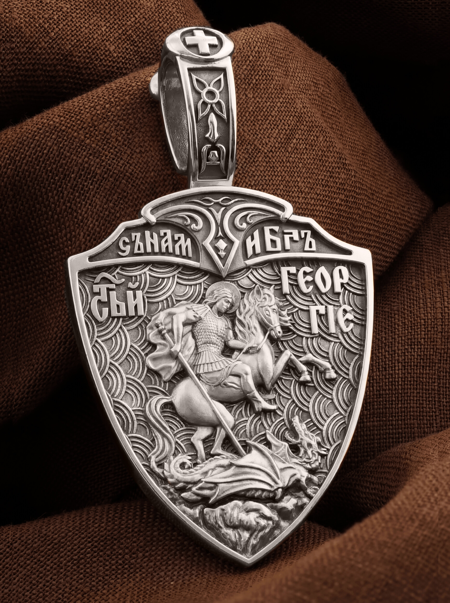 На оборотной стороне образка изображен Святой Великомученик Георгий Победоносец — один из самых почитаемых и удивительных святых. На Руси он известен как Юрий или Егорий, заступник для верующих, чья жизнь имеет какое-либо отношение к военным делам, помощник в крестьянском труде. На образке Георгий изображен как воитель, сидящий на вздыбленном коне и поражающий копьем огнедышащего змея. Змей символизирует собою сатанинские силы. Молитвами вознесенными к Всевышнему и своей непреклонной верой он смог одолеть чудовище. Святой убил змея, спас царскую дочь, принесенную в жертву, и жителей города, их души от влияния дьявола, породив в них надежду и веру в Господа, призывая людей принять христианскую веру.