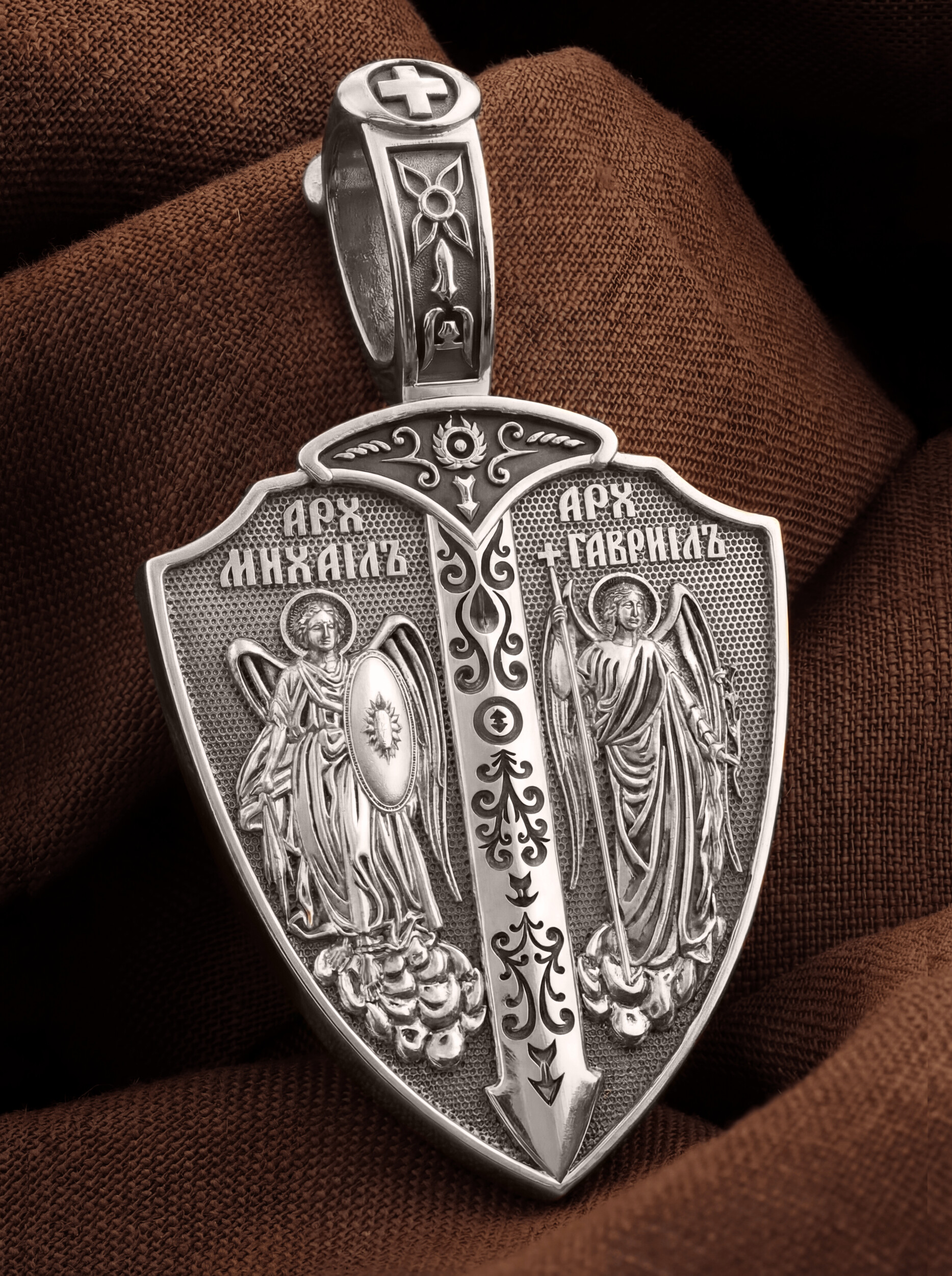 Образок выполнен в виде воинского щита и меча. На лицевой стороне образка изображены Архангел Михаил и Архангел Гавриил. Архангел Михаил изображен в воинственном виде с огненным мечом в правой руке и щитом в левой руке. Архангел Михаил — верный служитель Божий, который низринул с Неба возгордившегося денницу с другими павшими духами. В Православии его называют Архистратигом, что означает глава святого воинства Ангелов и Архангелов. Архангел почитается как покровитель воинов и всех верных Богу и ведущих борьбу против сил зла, борец против ересей, а также защитник душ умерших, страж райских врат. Архангел Гавриил изображен с крестом в правой руке и цветком лилии в левой руке. Он несколько раз упоминается в Писании, как Небесный вестник, которого Бог посылает, чтобы возвестить людям Свои планы о спасении рода человеческого. Так, Архангел Гавриил несколько раз являлся пророку Даниилу и раскрывал ему тайны пришествия Мессии, гонений антихриста и конца мира (Дан. 8, 16, 9−21). Перед пришествием Сына Божия в мир архангел Гавриил явился в храме старцу Захарии и сообщил ему о чудесном зачатии Предтечи. Через шесть месяцев он явился в Назарете Деве Марии с вестью об избрании Ее быть Матерью Христа Спасителя (Лк. 1). Когда Господь перед Своими страданиями молился в Гефсиманском саду до кровавого пота, на укрепление Его, по Церковному Преданию, был послан с Небес Архангел Гавриил. (Лк.22:43). Жены мироносицы услышали от Архистратига радостную весть о Воскресении Христовом.