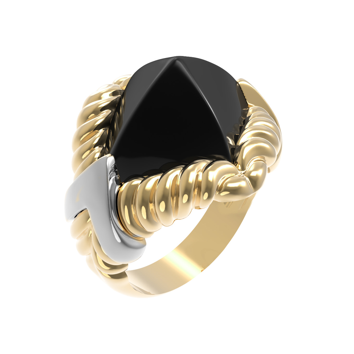 Данная модель выполнена в стиле геометрия, что придает ей современный и выразительный вид. Глубокий черный цвет вставки создает контрастное сочетание с лимонным золотом, делая украшение заметным и привлекательным. Кольцо универсально и подойдет как для женщин, так и для мужчин, желающих подчеркнуть свою индивидуальность.
