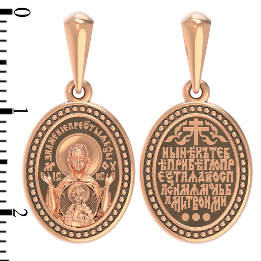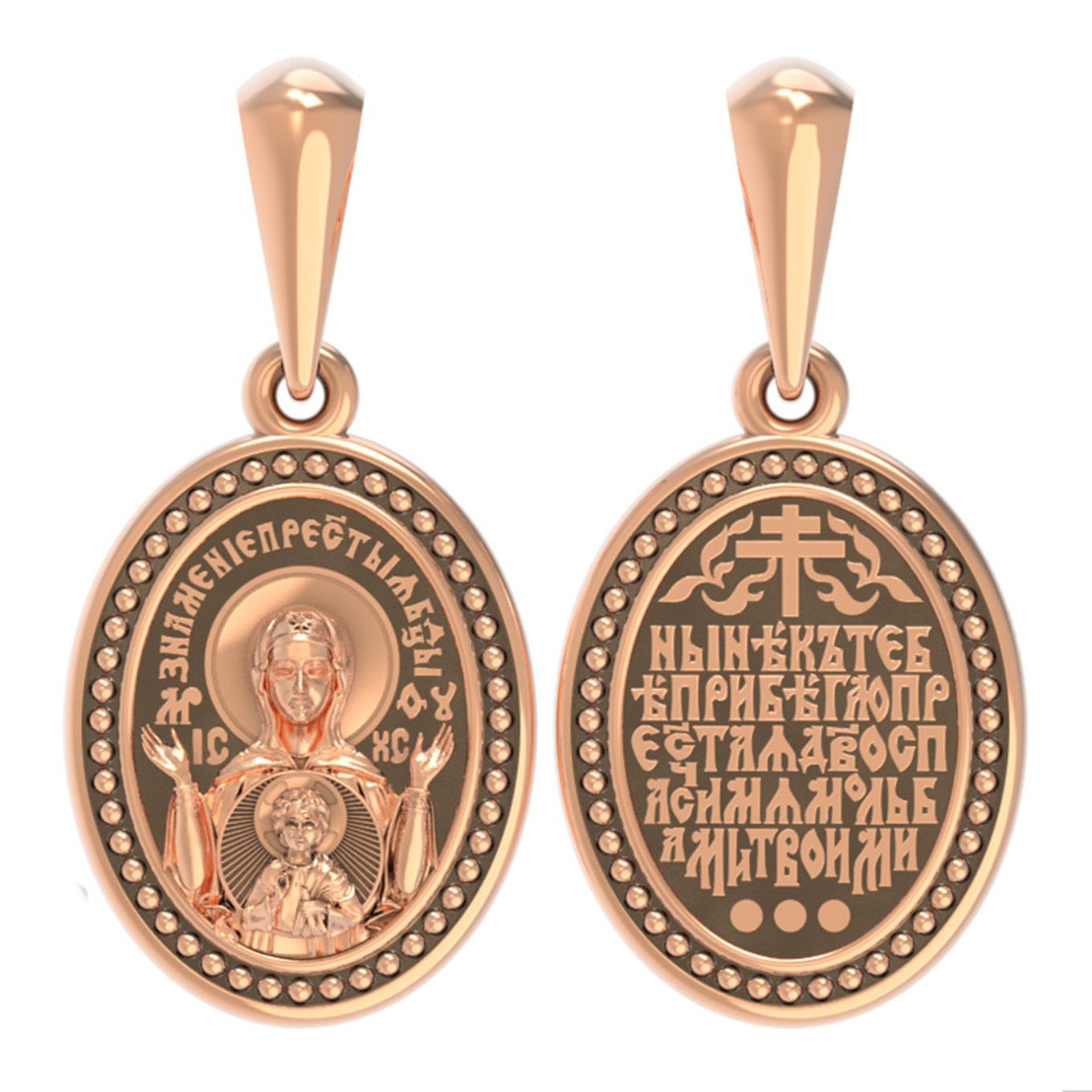 В центр образка помещен образ Божией Матери «Знамение», прославившийся многими чудесами в Новгороде в XII веке. Икона эта чтится как одна из самых великих святынь Русской земли. Молитвенно воздетые руки Богородицы означают заступничество за людей пред Богом. Рядом с Ней, на фоне круглого щита, — благословляющий Божественный Младенец — Спас-Эммануил.