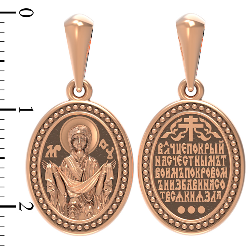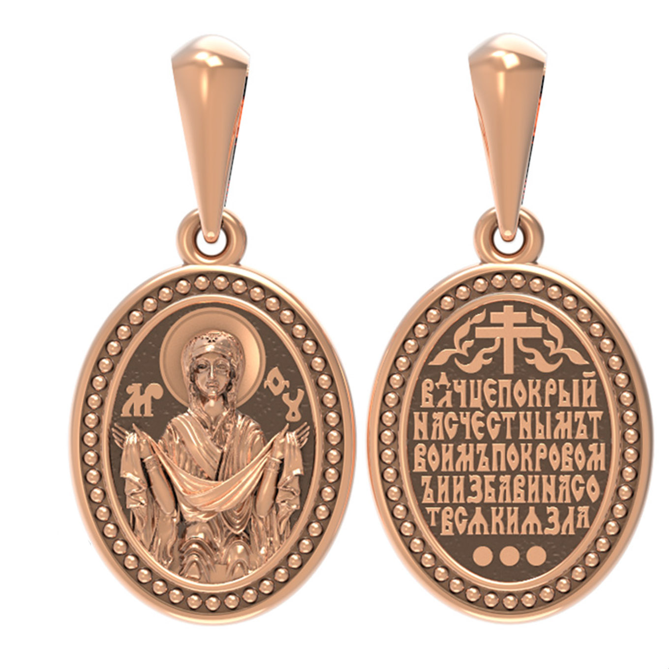 На лицевой части образка изображена икона Покров Пресвятой Богородицы. Праздник Покрова Божией Матери является воспоминанием чуда, которое произошло во Влахнернской церкви 1 (14) октября 910 года: Пресвятая Богородица явилась верующим над алтарем храма и распростерла над ними Свое покрывало. В этот день Божья Матерь открыла людям, что Она является Ходатаицей за них перед Богом. Богородица простирает Свой молитвенный покров над всеми православными христианами и умоляет Сына Своего о даровании вечного спасения каждому человеку.