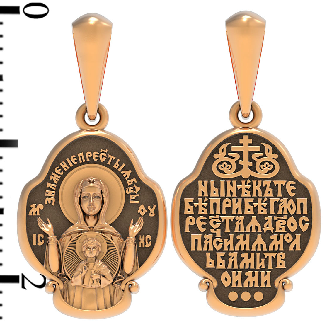 В центр образка помещен образ Божией Матери «Знамение», прославившийся многими чудесами в Новгороде в XII веке. Икона эта чтится как одна из самых великих святынь Русской земли. Молитвенно воздетые руки Богородицы означают заступничество за людей пред Богом. Рядом с Ней, на фоне круглого щита, — благословляющий Божественный Младенец — Спас-Эммануил.