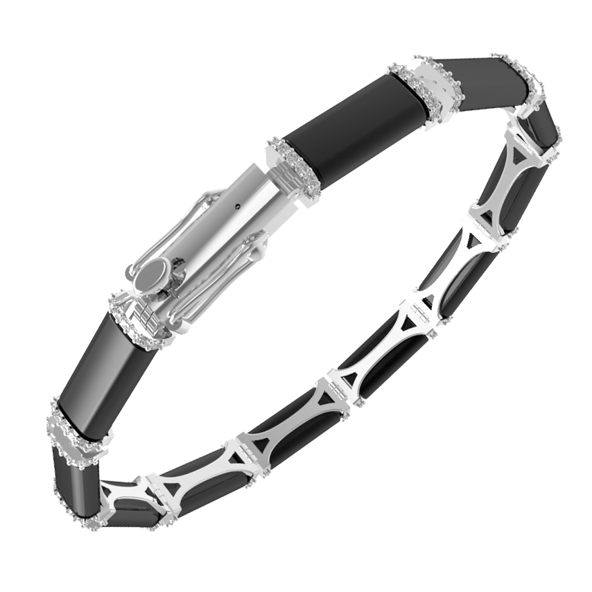 Особое очарование украшению придает инкрустация бриллиантами. Всего в модели использовано 1185 вставок круглой формы, которые создают ослепительную игру света и подчеркивают холодный блеск белого золота. Гармоничное сочетание черных ониксов и белых бриллиантов превращает этот браслет в универсальный аксессуар, который подойдет как женщинам, так и мужчинам. Изделие смотрится массивно и солидно, притягивая взгляды своей архитектурной выверенностью.