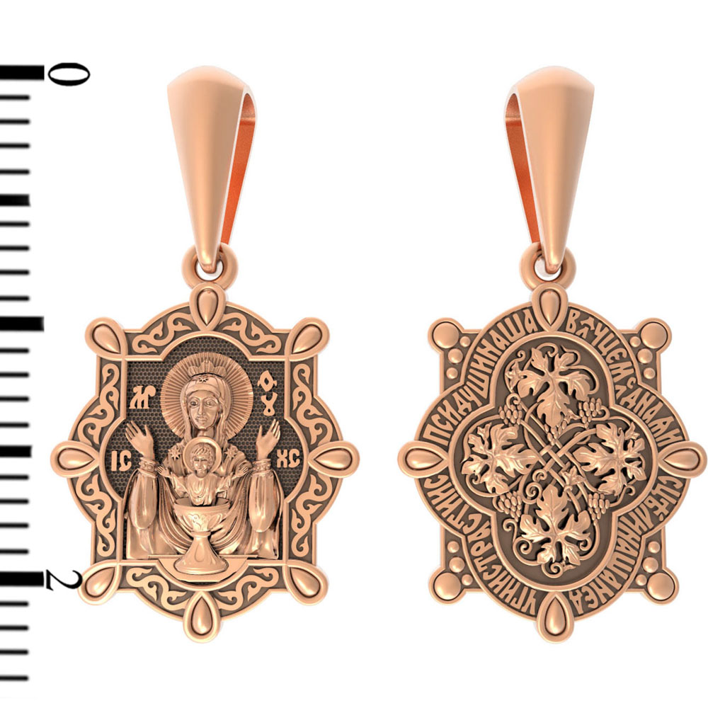 На лицевой части образка изображена икона Божией Матери «Неупиваемая чаша». Икона славится помощью в исцелении зависимостей, помогает людям обрести свободу от греховных страстей.