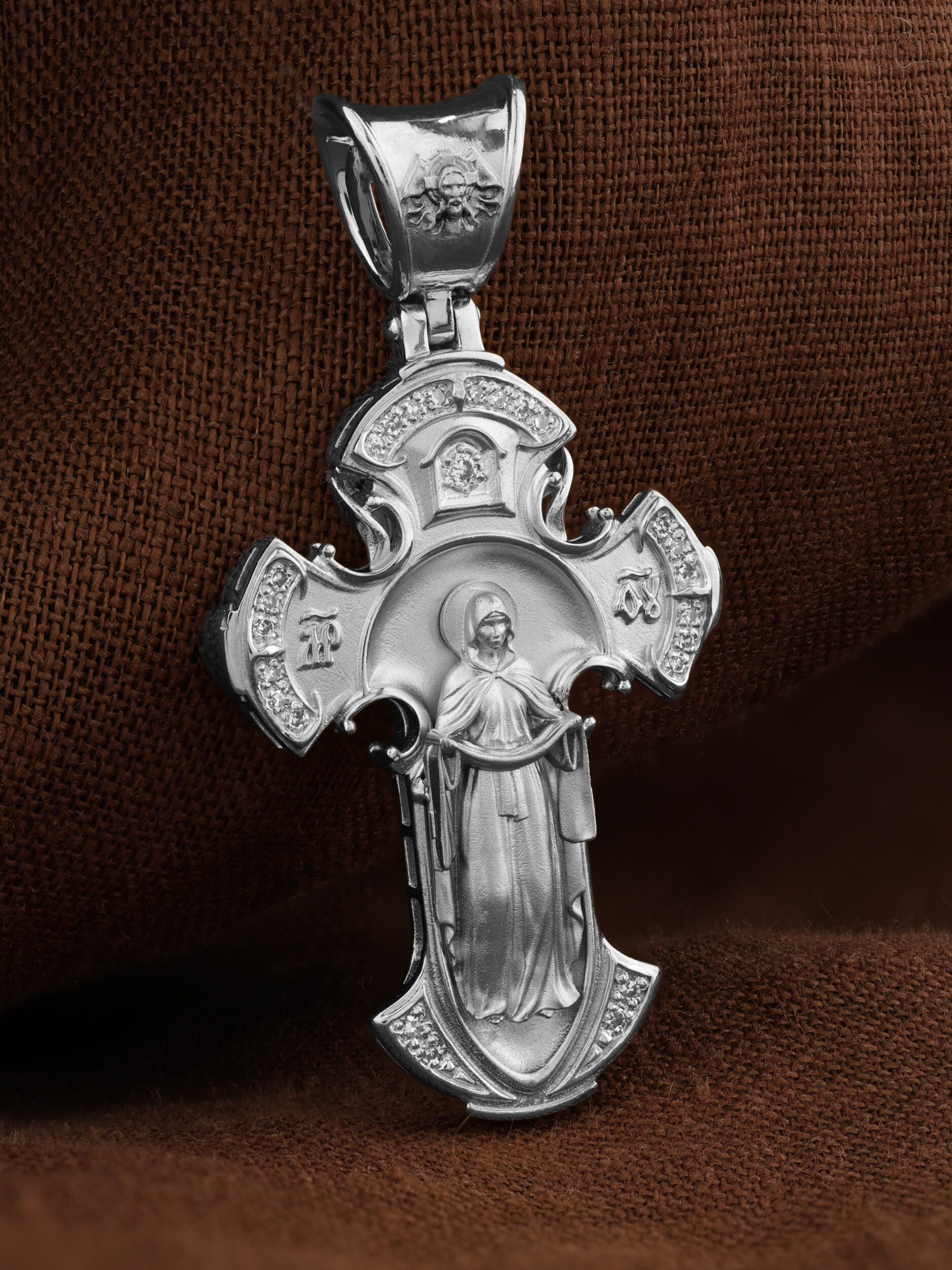 На оборотной стороне креста размещен образ Божией Матери «Покров Пресвятой Богородицы». Праздник Покрова Пресвятой Богородицы пришел на Русь в XII веке из Византии и стал одним из самых почитаемых. В 910 году Византийской Империи угрожали нападением сарацины. Не видя ниоткуда помощи, в те дни греки во множестве стекались в Константинополь, во Влахернский храм, в котором хранились риза Богоматери и Ее головной покров, и молились. 1 (14) октября 910 года Святому Андрею Юродивому и его ученику Епифанию было видение Покрова Божией Матери. Пресвятая Богородица, в окружении Святых, явилась над алтарем Храма и слезно молилась. По окончании молитвы сняла с Себя блистающее великое и страшное покрывало, которое носила на Пречистой главе Своей и, держа его с великой торжественностью, распростерла над всем стоящим народом. Вскоре враги без всякого кровопролития отступили от города. Богородица простирает Свой молитвенный покров над всеми православными христианами и умоляет Сына своего о даровании вечного спасения каждому человеку. На кулонном кольце размещен образ Спас Нерукотворный — образ Господа и Спасителя нашего Иисуса Христа, чудесно отпечатавшийся на плате, котором Христос вытер свой лик.