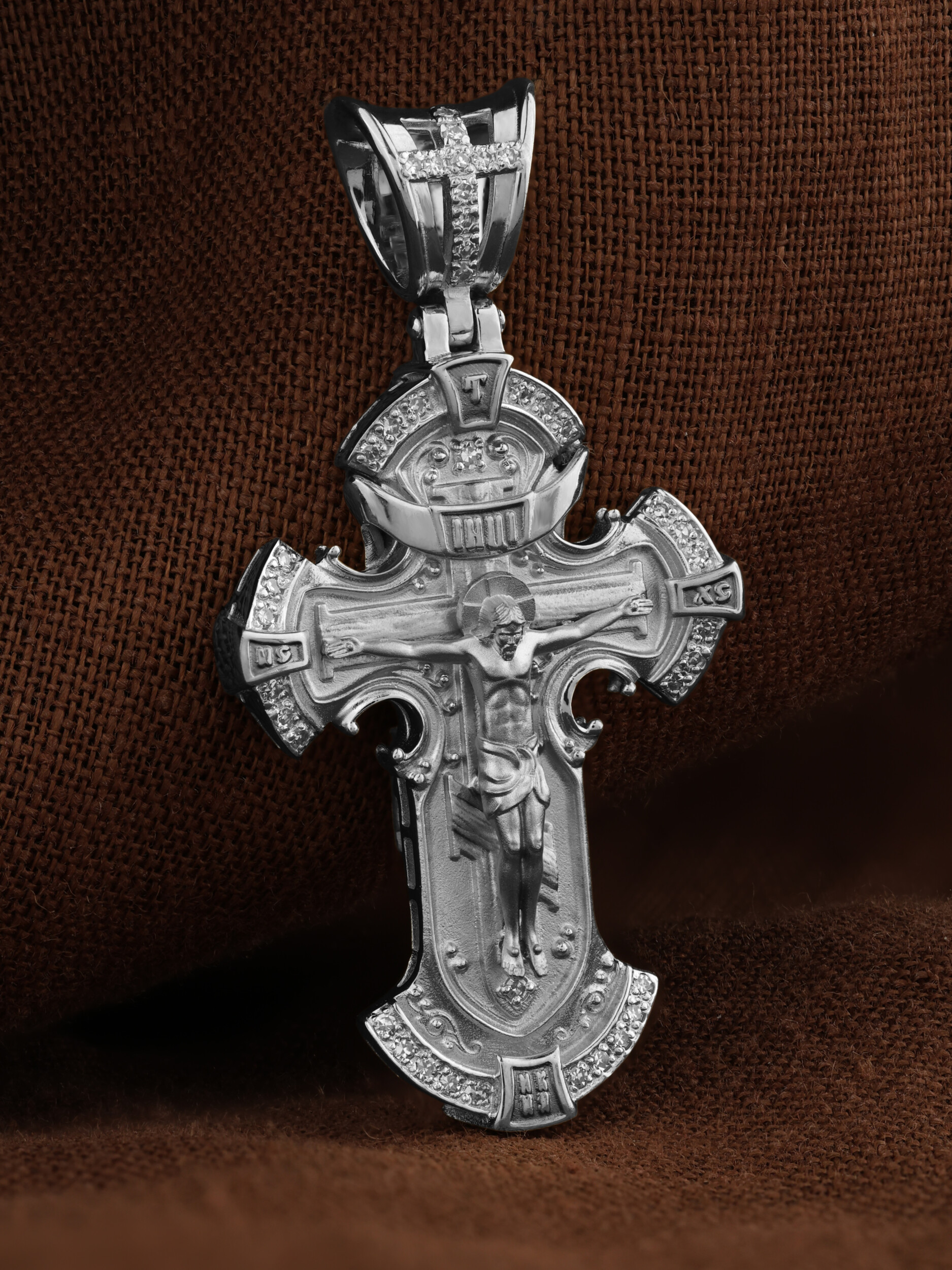 На лицевой стороне креста изображено Распятие Господа и Спасителя нашего Иисуса Христа, отдавшего Себя на смерть, для искупления грехов мира. Крест является символом жертвенной любви Всеблагого Бога к падшим людям, всепобеждающим духовным оружием христиан, основанием и средоточием церковной жизни. Господь сказал: кто хочет идти за Мною, отвергнись себя, и возьми крест свой, и следуй за Мною. (Мк. 8: 34). Верхняя перекладина символизирует титло — табличка, на которой, согласно Евангелию, было начертано: Иисус Назорей Царь Иудейский (IНЦI). Справа и слева от Распятия изображены символы «IС ХС» — святое имя Христа. Внизу креста написано слово «НИКА», что значит «победитель». В верхней части креста обозначена буква «Т», которая символизирует одно из орудий страданий Господа — трость.