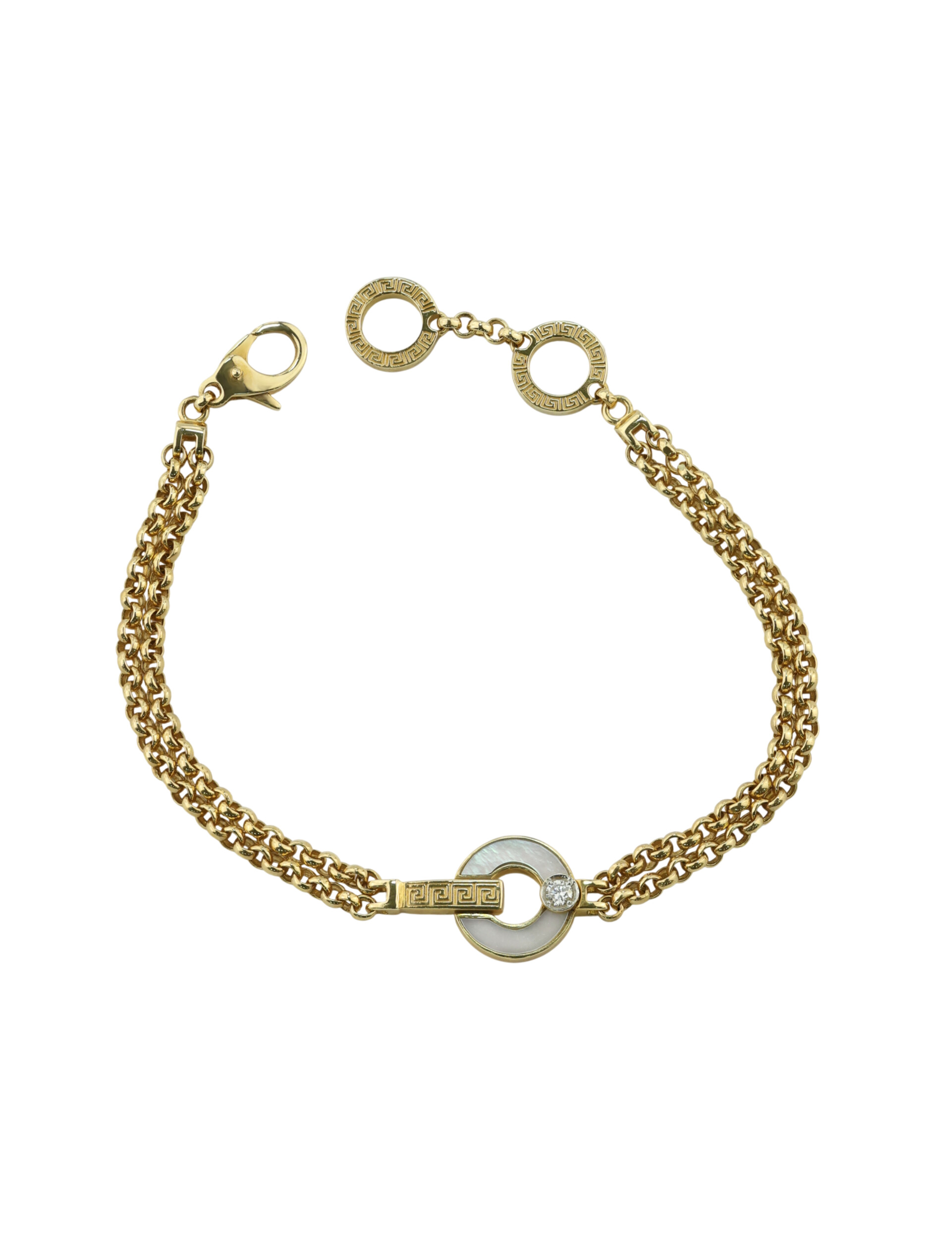 Универсальный дизайн этого браслета позволяет носить его как женщинам, так и мужчинам, создавая утонченный и запоминающийся образ. Белый цвет бриллианта и нежное перламутровое сияние создают контрастное сочетание с лимонным цветом золота, привлекая внимание к каждому движению вашей руки. Данное изделие прекрасно смотрится как самостоятельный аксессуар, так и в сочетании с другими ювелирными украшениями, позволяя вам создавать гармоничные комплекты. Это ювелирное украшение станет достойным подарком для ценителей высокого искусства и качества.