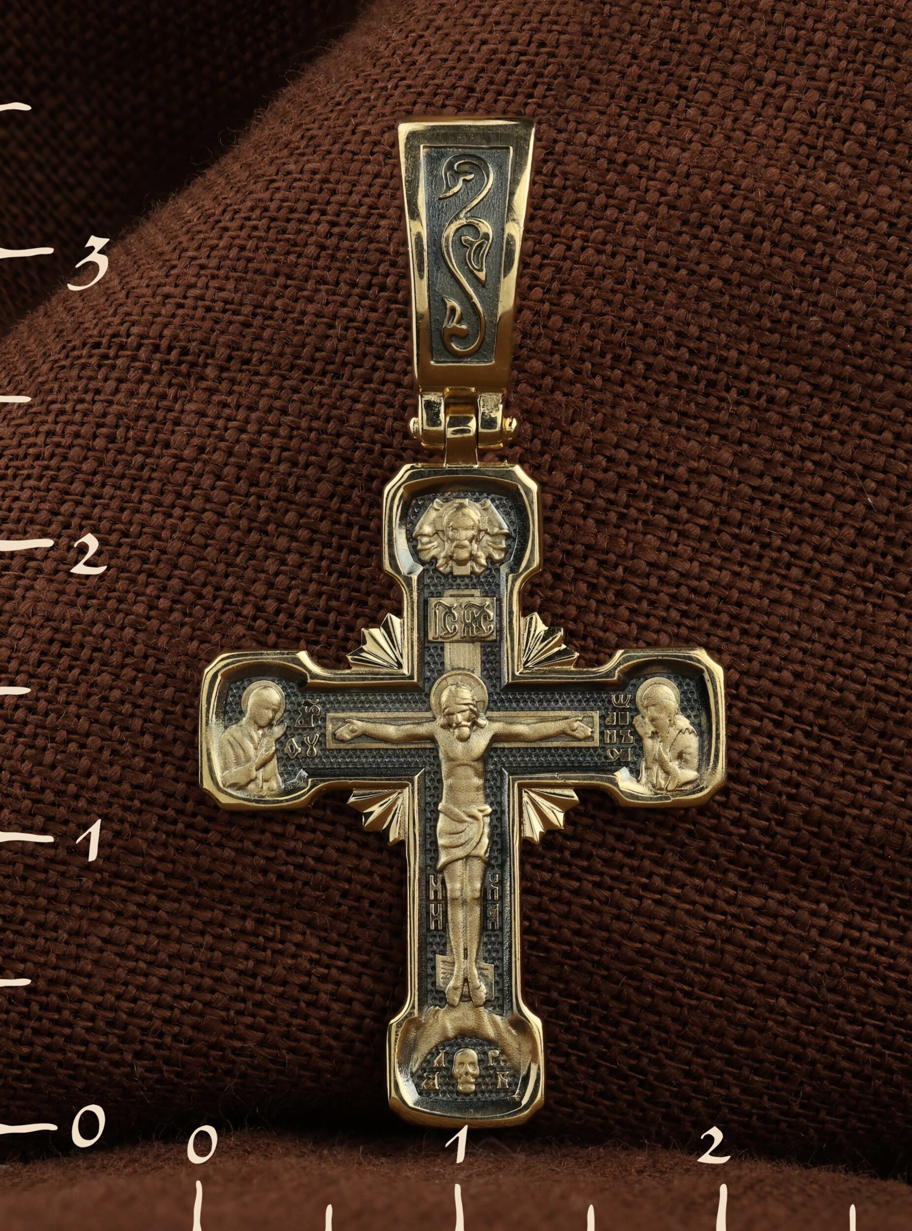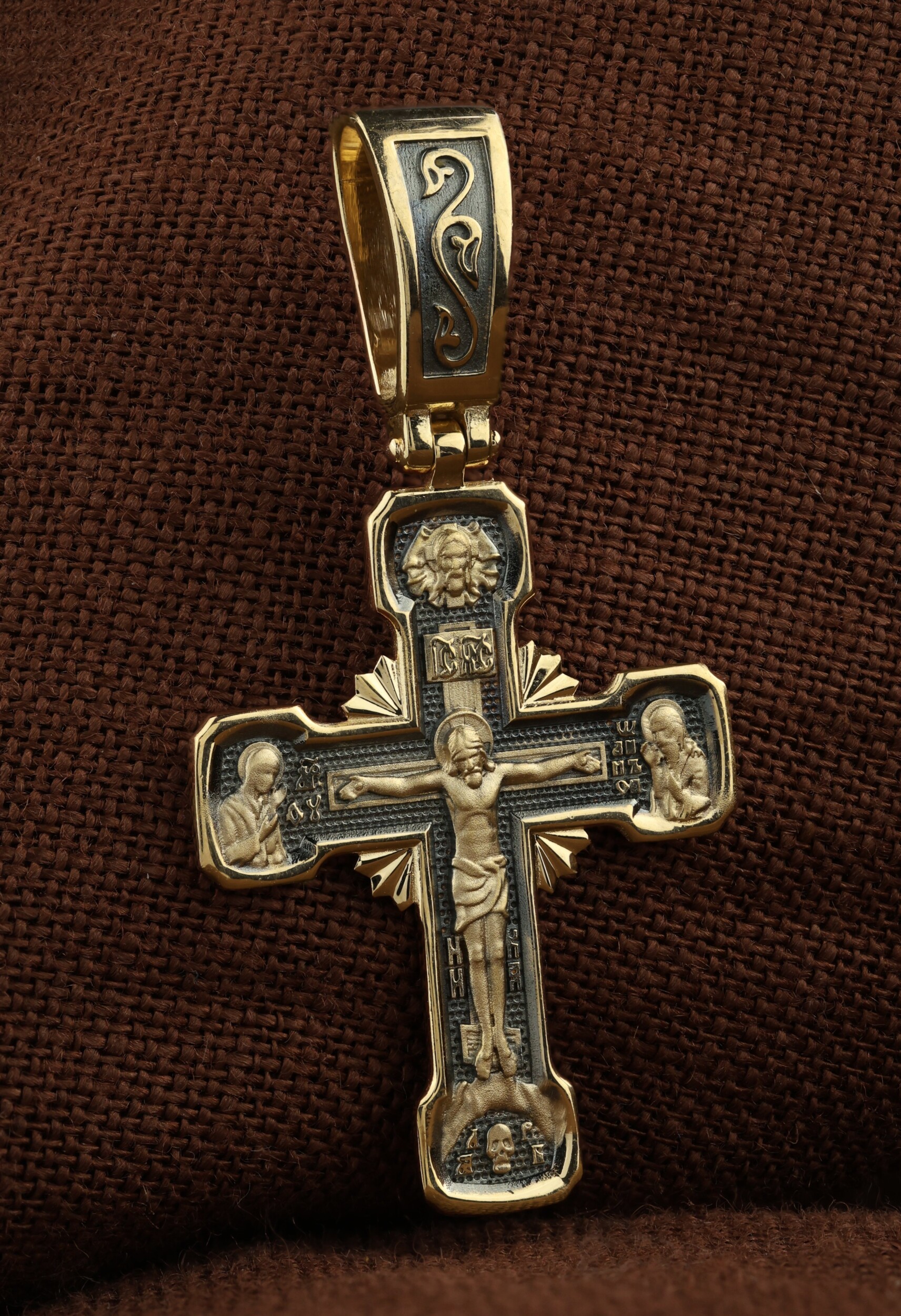 На лицевой стороне креста изображено Распятие Господа Иисуса Христа. Верхняя перекладина символизирует собой табличку с надписью «IHЦI» — Иисус Назарянин Царь Иудейский. Ниже перекладины добавляется: «НИКА» (греч. — Победитель). Возвышение, на котором стоит Крест, символизирует гору Голгофу, на которой произошло Распятие. У подножия Креста изображают прах Адама, обозначенный черепом.