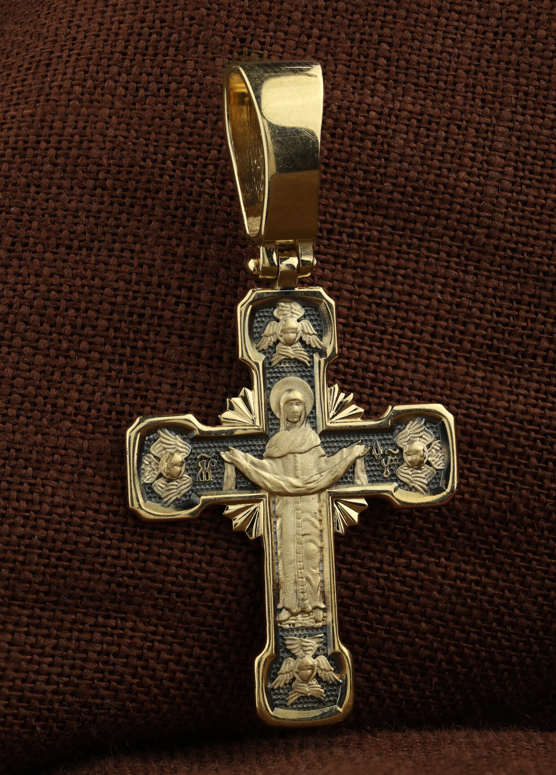 На обороте креста изображена икона Покрова Пресвятой Богородицы. Праздник Покрова Божией Матери является воспоминанием чуда, которое произошло во Влахнернской церкви 1 (14) октября 910 года: Пресвятая Богородица явилась верующим над алтарем храма и распростерла над ними Свое покрывало. В этот день Божья Матерь открыла людям, что Она является Ходатаицей за них перед Богом. Икону окружают шестикрылые Серафимы — самые приближенные к Господу Ангелы. Над иконой Богородицы изображен Спас Нерукотворный — Символ вочеловечившегося Божества.