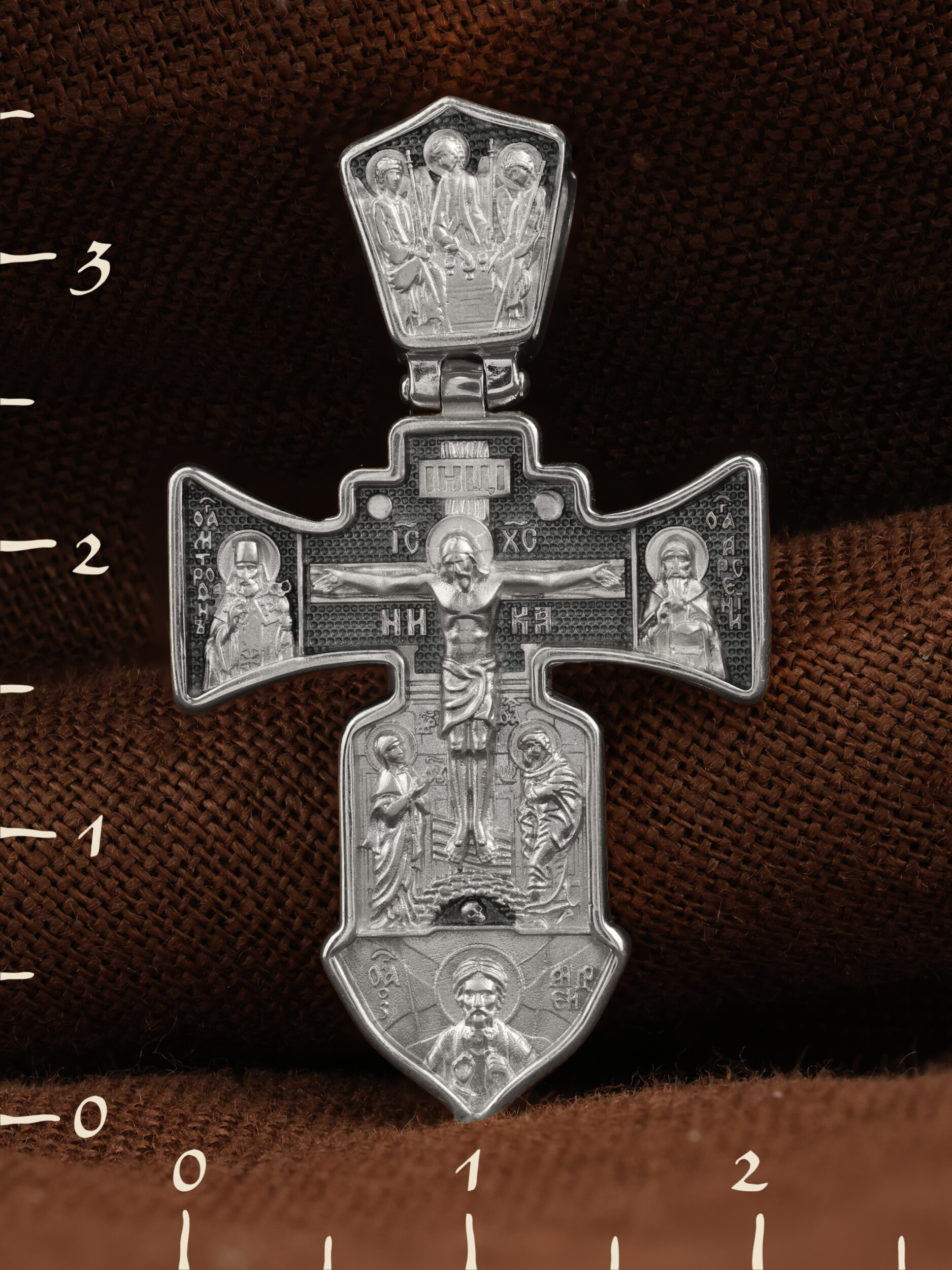 На лицевой стороне креста изображено Распятие Господа Иисуса Христа.
