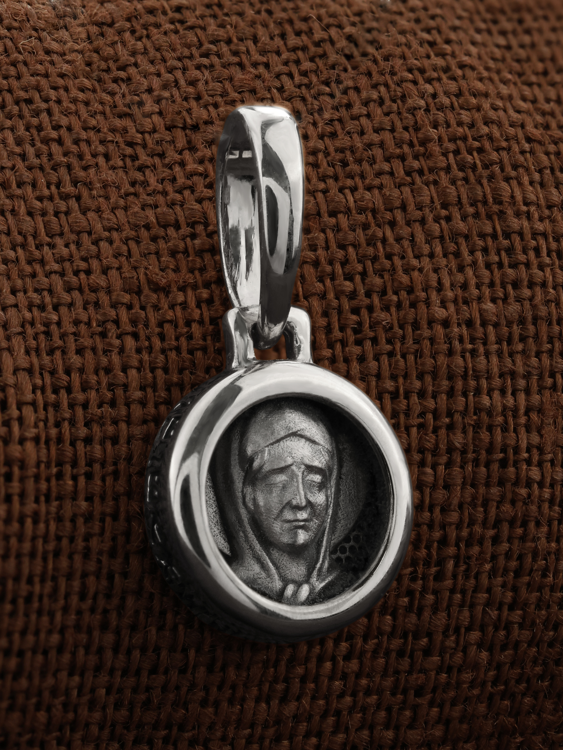 На лицевой стороне образка изображена Святая Матрона Московская. Родилась блаженная Матрона (Матрона Дмитриевна Никонова) в 1881 г. в деревне Себино Тульской губернии, недалеко от знаменитого Куликова поля, в бедной, но благочестивой крестьянской семье. Кроме Матроны, в семье уже было трое детей: двое братьев и сестра. Поэтому мать Матроны решила отдать будущего ребенка в приют, но увидела вещий сон. Еще не родившаяся дочь явилась ей во сне в виде белой птицы с человеческим лицом и закрытыми глазами и села ей на правую руку. Приняв сон как знамение, богобоязненная женщина отказалась от мысли отдать ребенка в приют. Дочь родилась слепой, но мать любила свое «дитя несчастное».