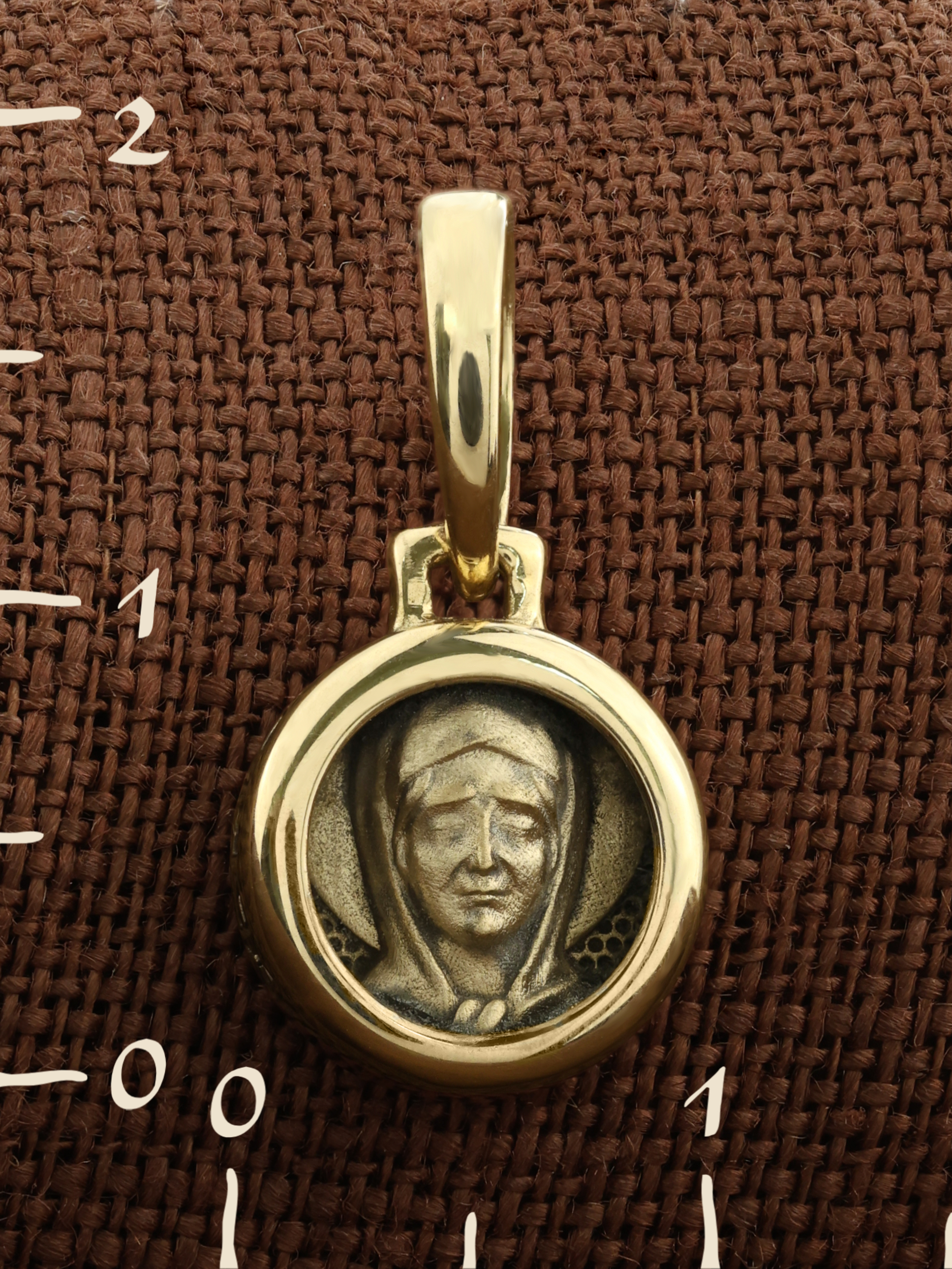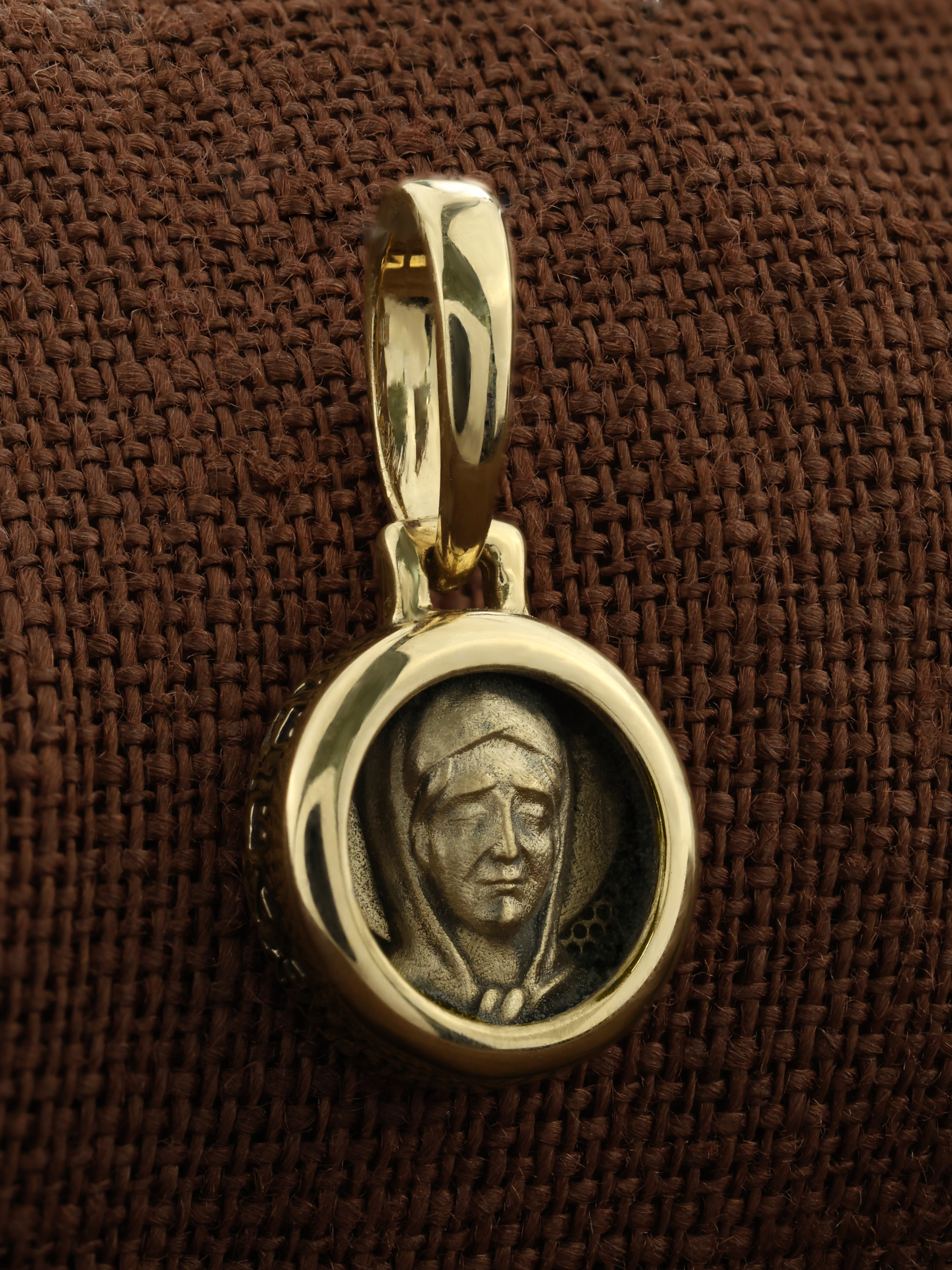 На лицевой стороне образка изображена Святая Матрона Московская. Родилась блаженная Матрона (Матрона Дмитриевна Никонова) в 1881 г. в деревне Себино Тульской губернии, недалеко от знаменитого Куликова поля, в бедной, но благочестивой крестьянской семье. Кроме Матроны, в семье уже было трое детей: двое братьев и сестра. Поэтому мать Матроны решила отдать будущего ребенка в приют, но увидела вещий сон. Еще не родившаяся дочь явилась ей во сне в виде белой птицы с человеческим лицом и закрытыми глазами и села ей на правую руку. Приняв сон как знамение, богобоязненная женщина отказалась от мысли отдать ребенка в приют. Дочь родилась слепой, но мать любила свое «дитя несчастное».