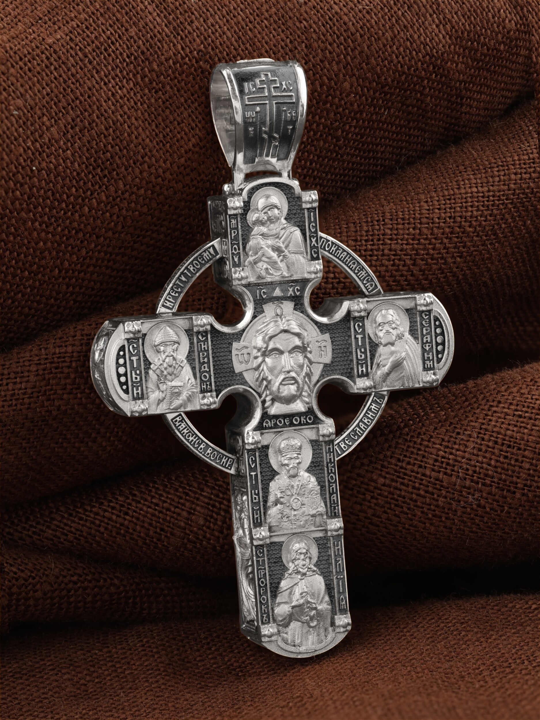 В центре оборотной стороны креста размещен образ Господа и Спасителя нашего Иисуса Христа — Господь Вседержитель или Пантократор (от греч. всевластный, всесильный). Именование Иисуса «Вседержителем» указывает, с одной стороны, на Его Божественную природу: «Аз есмь Альфа и Омега, начало и конец, говорит Господь, Который есть и был и грядет, Вседержитель» (Откр. 1: 8). С другой стороны, такое именование связано и с человеческой природой Христа, искупившего крестной жертвой людские грехи и обновившего тем самым человеческую природу. Над образом изображена икона Божией Матери «Владимирская», ниже — образы святителя Николая Чудотвореца, архиепископа Мир Ликийских и пророка Ильи. Слева изображен святитель Спиридон Тримифунтский, справа — преподобный Серафим Саровский. На кулонном кольце размещен образ шестикрылого Серафима.