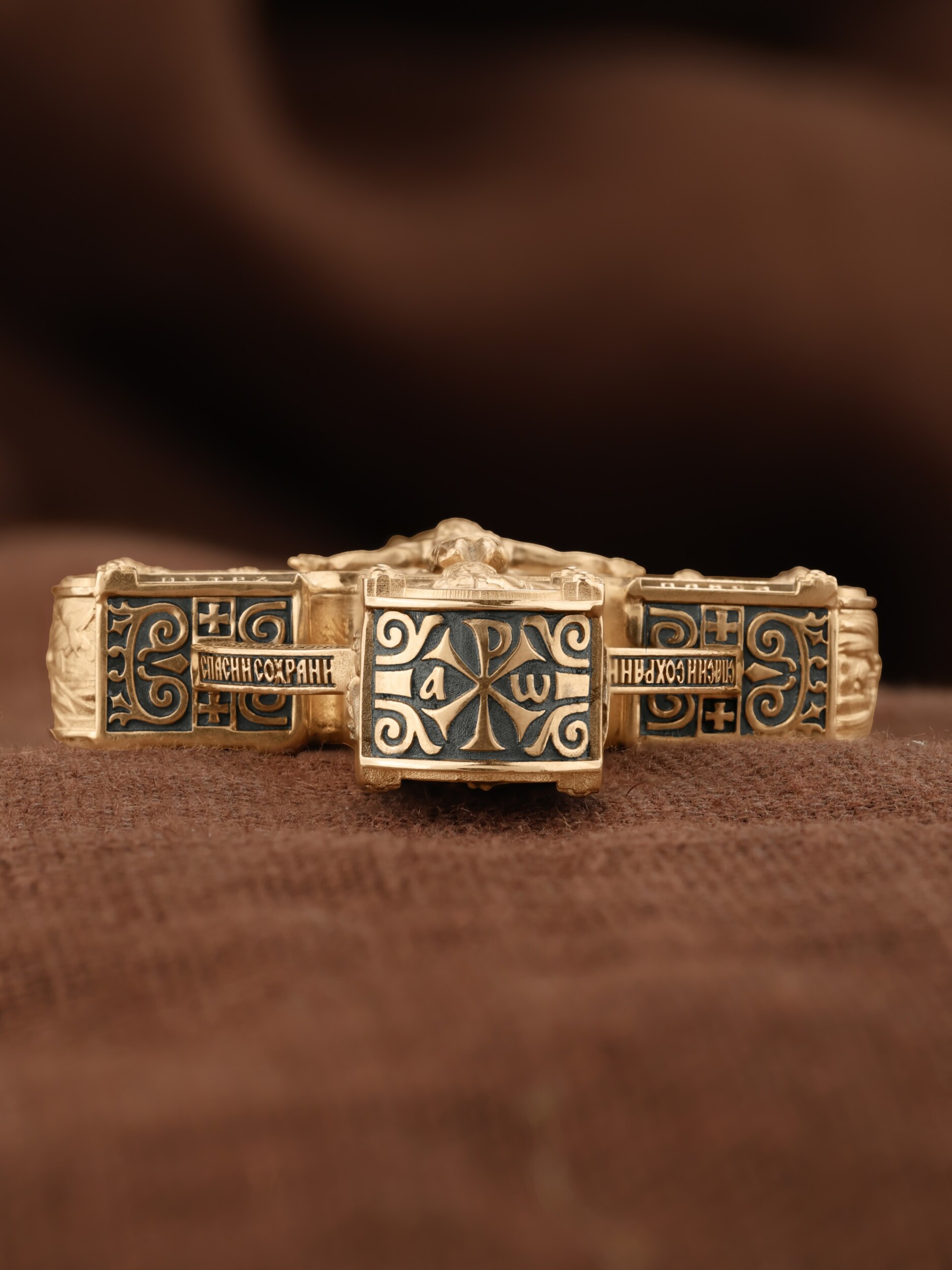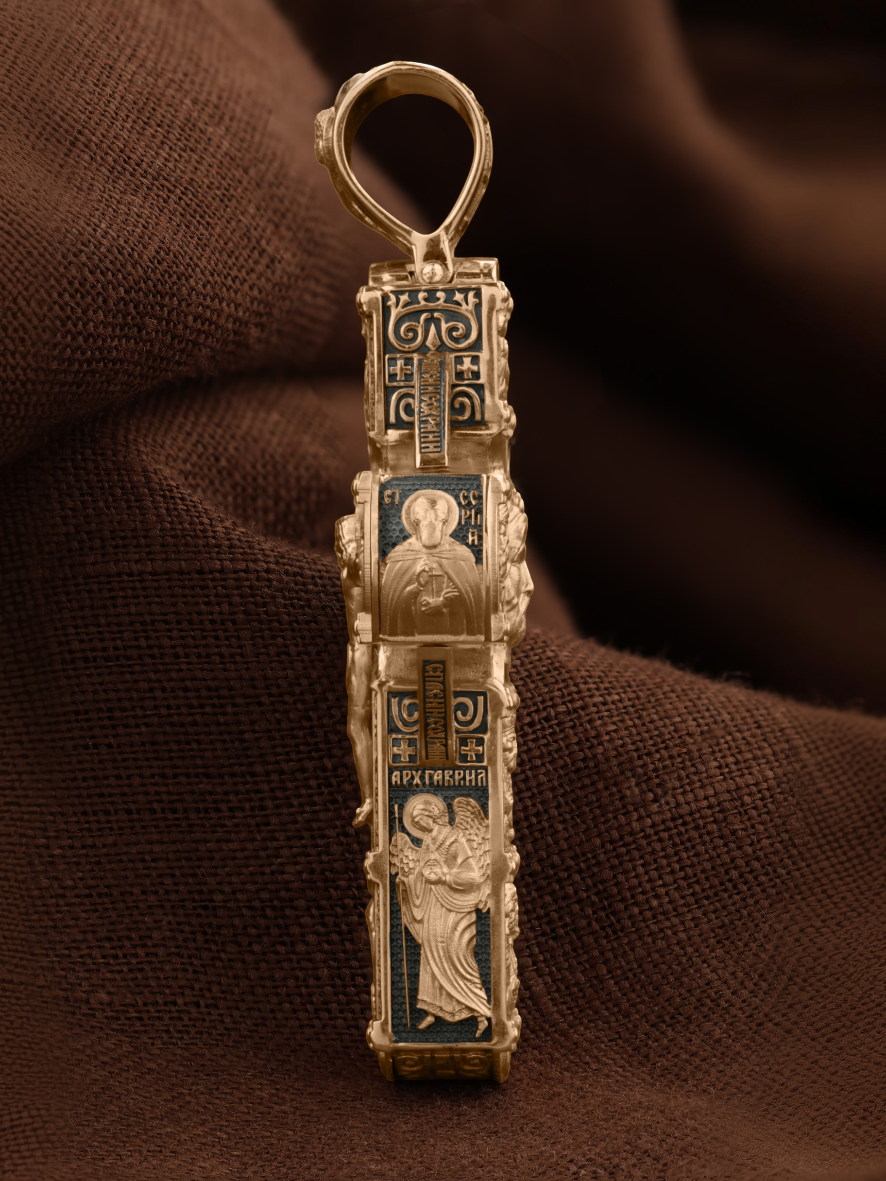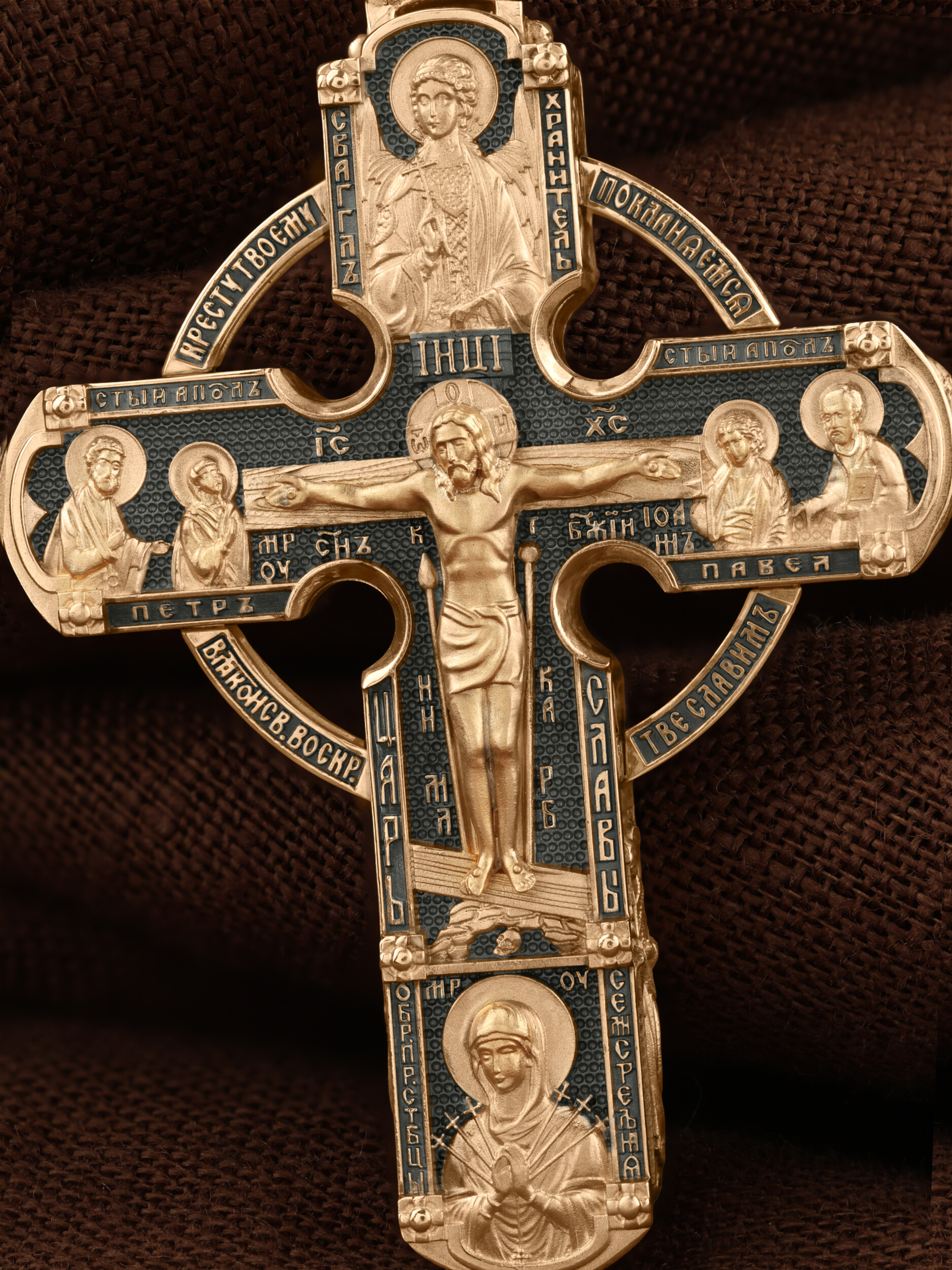 Крест объединяет в одной фигуре два христианских символа — круг-нимб и крест. На лицевой стороне креста изображено Распятие Господа и Спасителя нашего Иисуса Христа. Крест — символ спасения и искупления рода человеческого, знамение победы над смертью и адом. Распятие сопровождается каноническими надписями. На верхней табличке, выше головы Иисуса, расположена надпись, составленная Понтием Пилатом — «IНЦI». Она означает «Иисус Назорей, Царь Иудейский». Надписи «IC» «ХC», что означает Иисус Христос и «Сын Божий» размещается на разных сторонах поперечной перекладины креста. Вдоль Распятия размещены надписи «Царь Славы», «НИКА» (греч. — Победитель) и «МЛРБ» — «место лобное рай бысть» означает место лобное стало раем». Крест стоит на горе камней, символизирующих Голгофу. В ее основании различается череп — это голова Адама. Вдоль креста изображены орудия Страстей Христовых: копие сотника Лонгина, которым пронзили подреберье мёртвого Иисуса, чтобы убедиться в Его смерти, и трость с губкой, с которой Иисуса напоили уксусом. Они обозначены буквами «К» и «Т». Слева от Распятия помещены лики Пречистой Богородицы и Апостола Петра, справа изображены Апостол и евангелист Иоанн Богослов и Апостол Павел. Над Распятием изображен Святой Ангел-Хранитель, ниже — икона Божией Матери «Семистрельная». По кругу размещена молитва: «Кресту Твоему поклоняемся, Владыко, и Святое Воскресение Твое славим». На кулонном кольце помещено изображение Креста «Голгофа», на котором был распят Господь и Спаситель наш Иисус Христос.