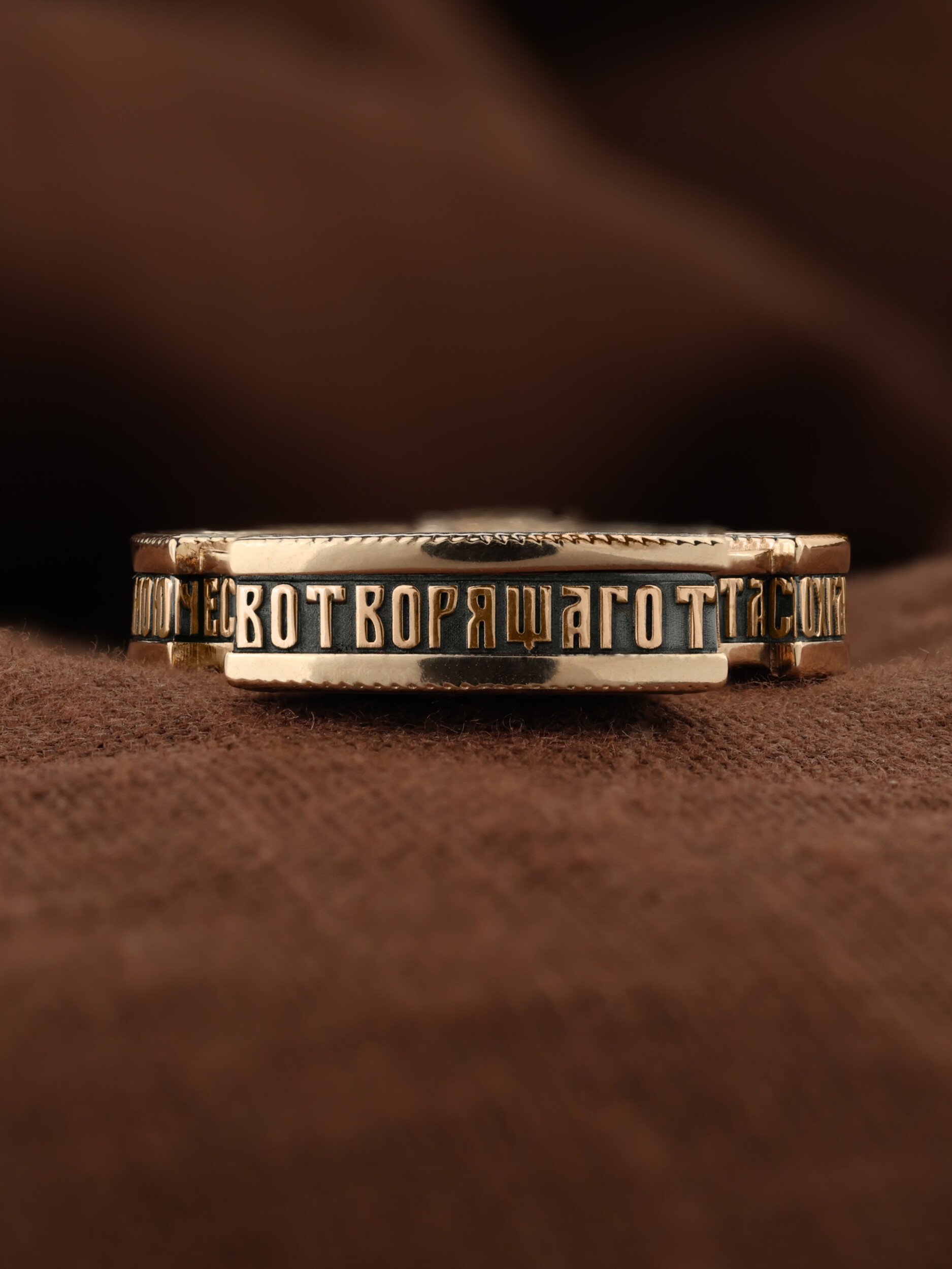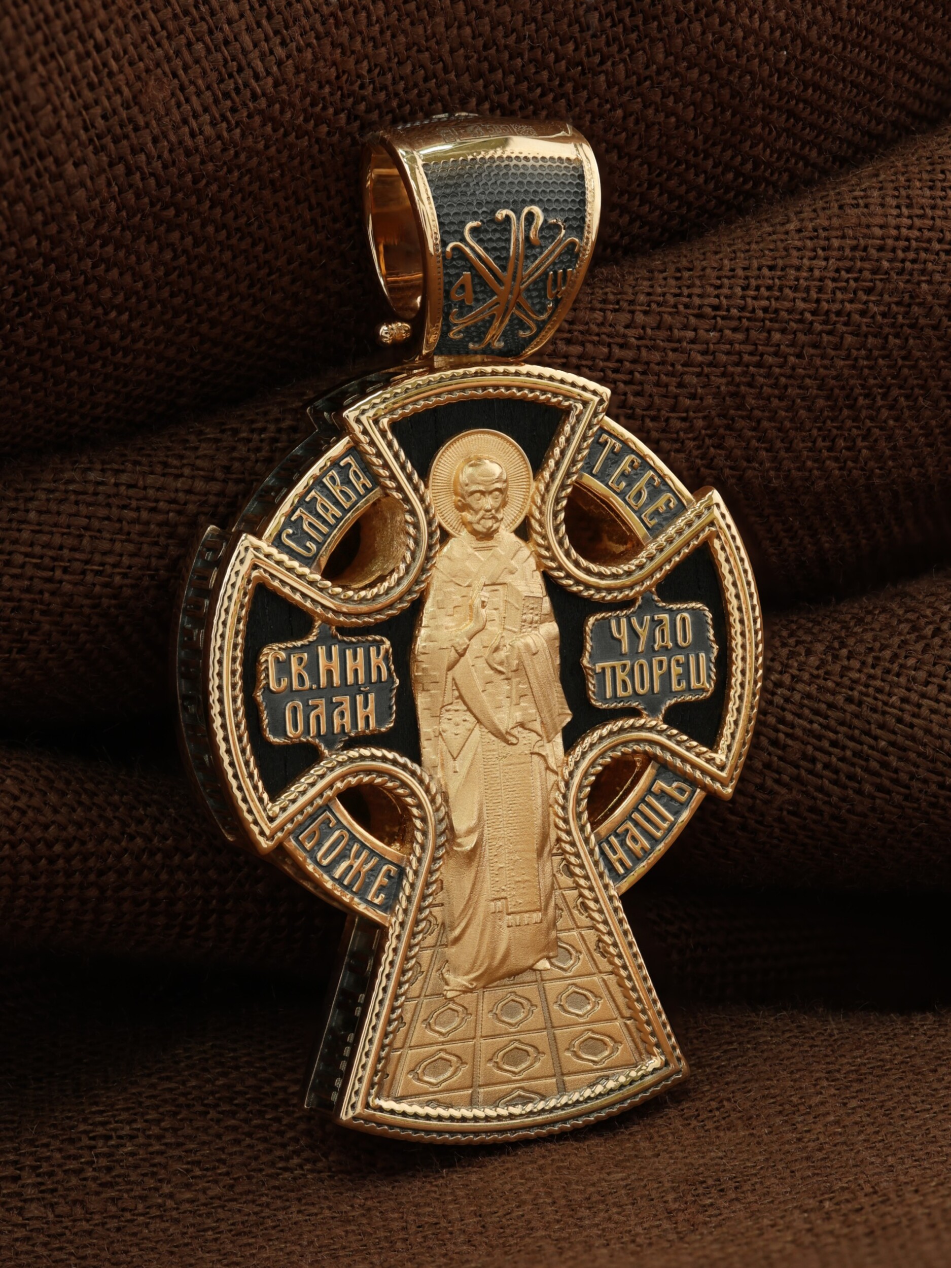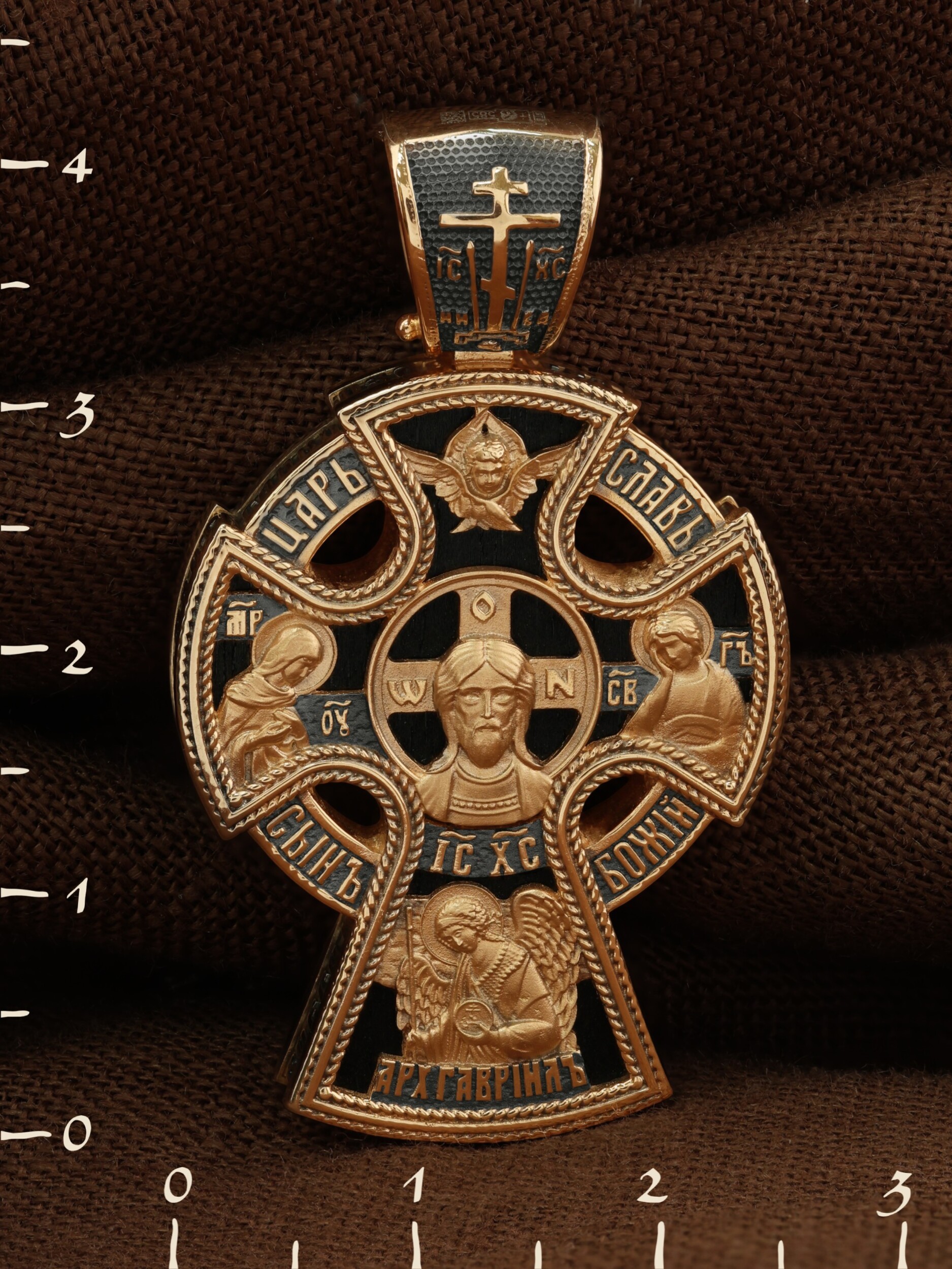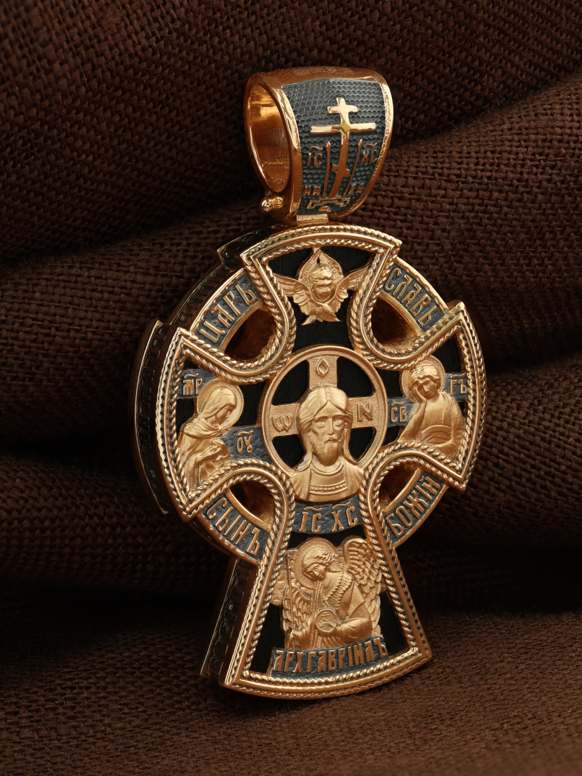 Крест объединяет в одной фигуре два христианских символа — круг-нимб и крест. Крест подобной формы был распространён в Новгородских землях в XIII—XVI веках. В центре лицевой стороны креста размещен образ Господа и Спасителя нашего Иисуса Христа — Господь Вседержитель или Пантократор (от греч. всевластный, всесильный). Именование Иисуса «Вседержителем» указывает, с одной стороны, на Его Божественную природу: «Аз есмь Альфа и Омега, начало и конец, говорит Господь, Который есть и был и грядет, Вседержитель» (Откр. 1: 8). С другой стороны, такое именование связано и с человеческой природой Христа, искупившего крестной жертвой людские грехи и обновившего тем самым человеческую природу. Крест сопровождается каноническими надписями: «Царь Славы» и «Сын Божий», что означает божественную природу Иисуса Христа, которые размещены по кругу. Слева от образа помещен лик Пречистой Богородицы, скорой помощницы и заступницы рода Христианского. Справа изображен апостол и евангелист Иоанн Богослов, один из ближайших учеников Иисуса Христа. Выше образа размещено изображение шестикрылого Серафима, ниже — Ар¬хан¬гела Гав¬ри¬ила. На кулонном кольце помещено изображение Креста «Голгофа», на котором был распят Господь и Спаситель наш Иисус Христос.