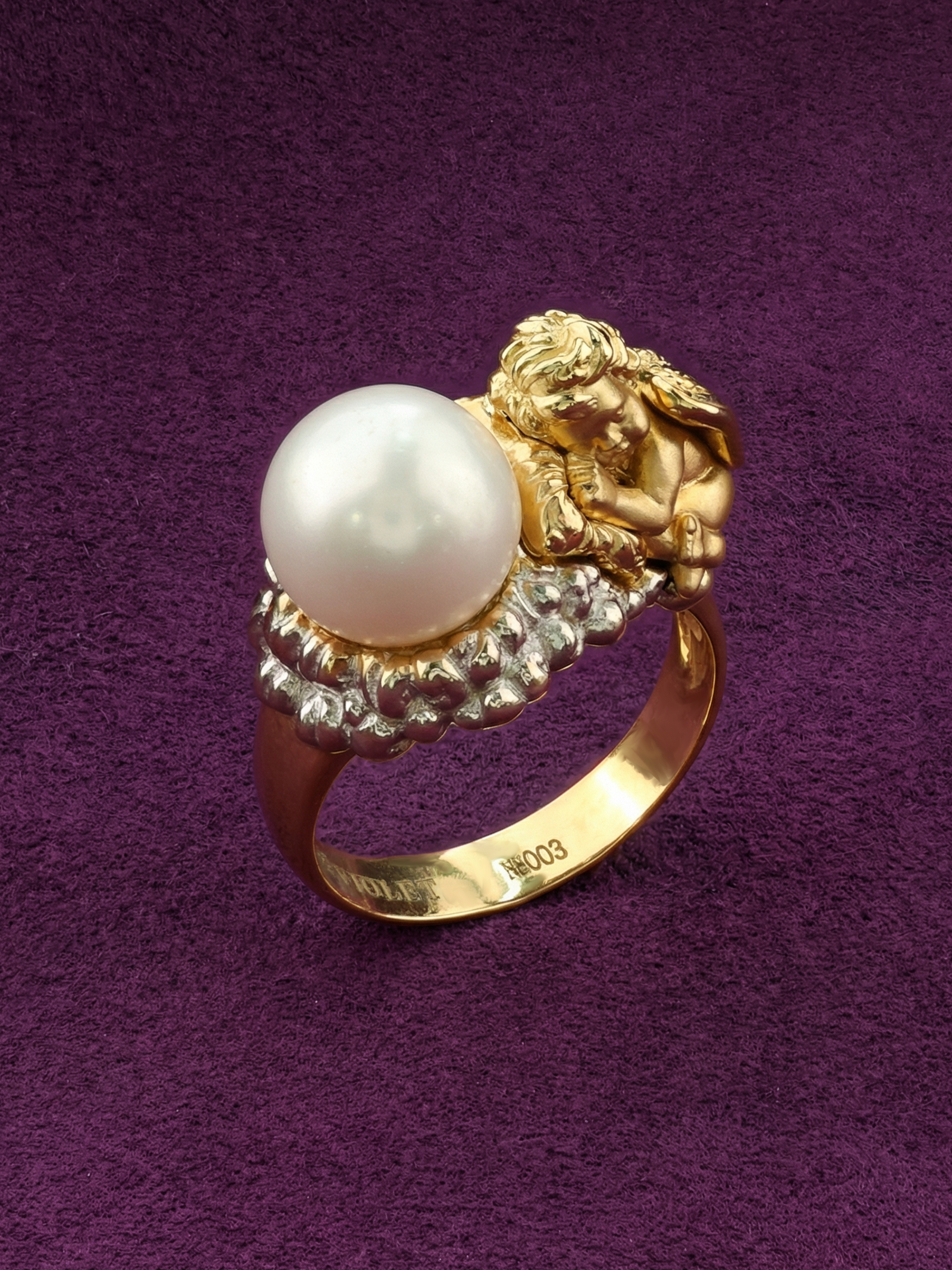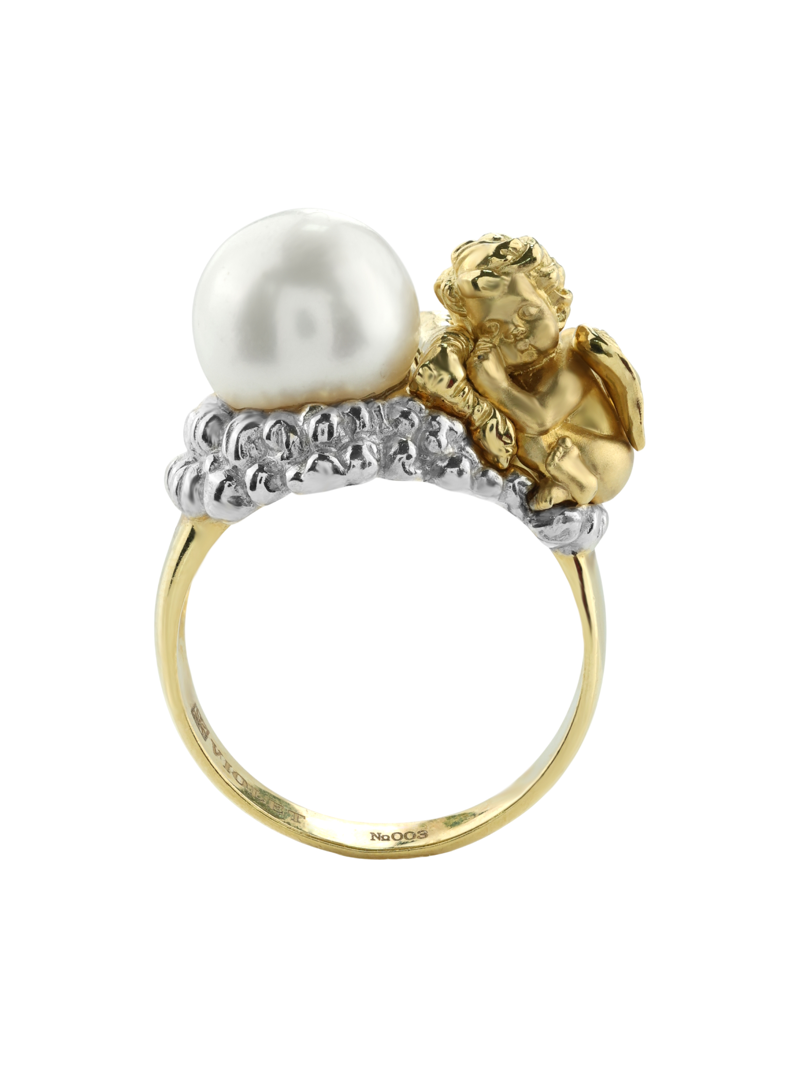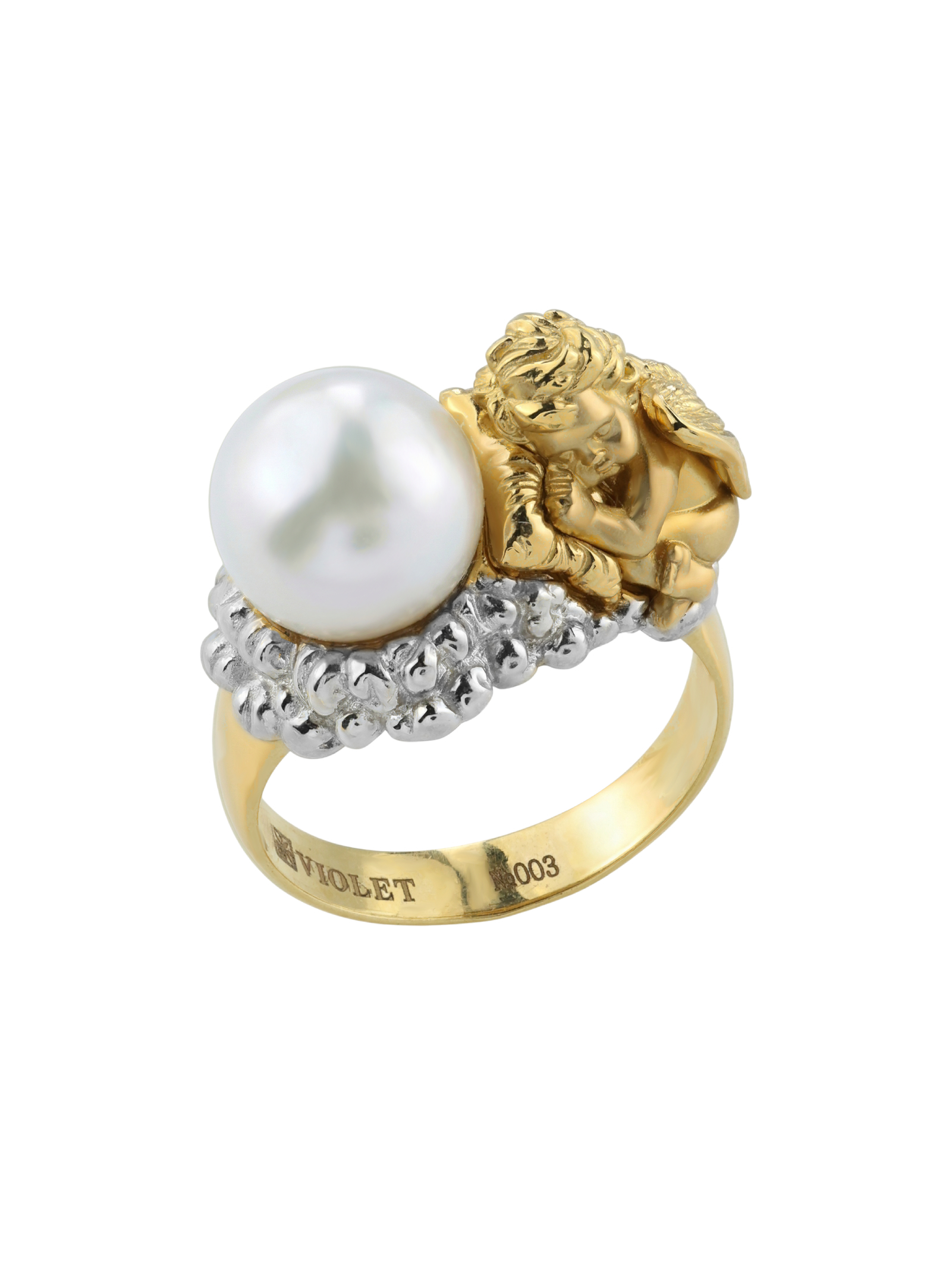 Кольцо из лимонного золота с жемчугом из коллекции De Luxe — Купидоны — это выразительное ювелирное украшение, сочетающее в себе благородные материалы и глубокий символизм. Центральным элементом дизайна является одна вставка из жемчуга белого цвета круглой формы, которая мягко контрастирует с теплым оттенком металла. Оправа изделия выполнена в оригинальной художественной манере: фигурка купидона придает украшению романтичный и возвышенный характер, делая его заметным акцентом в образе.