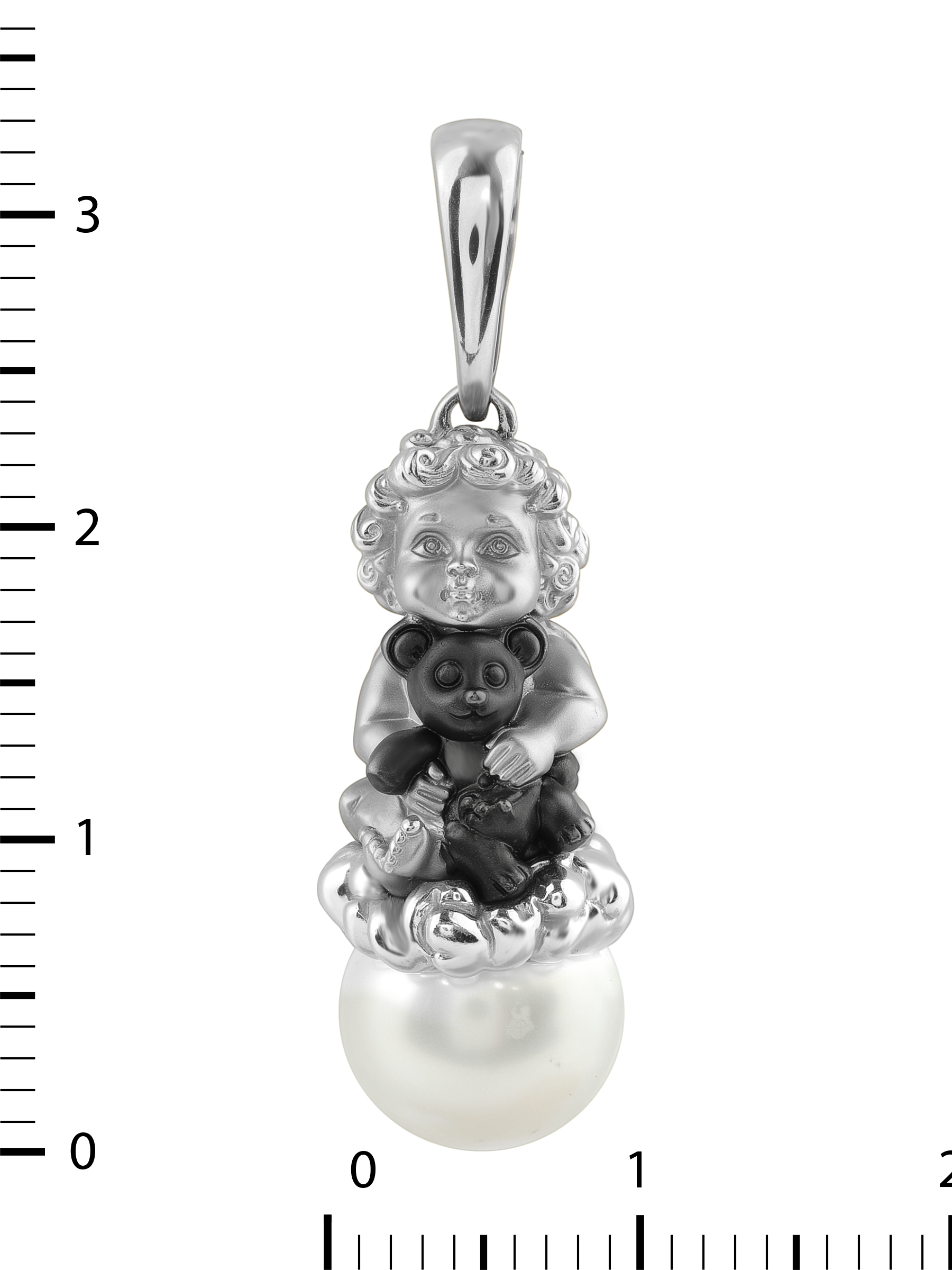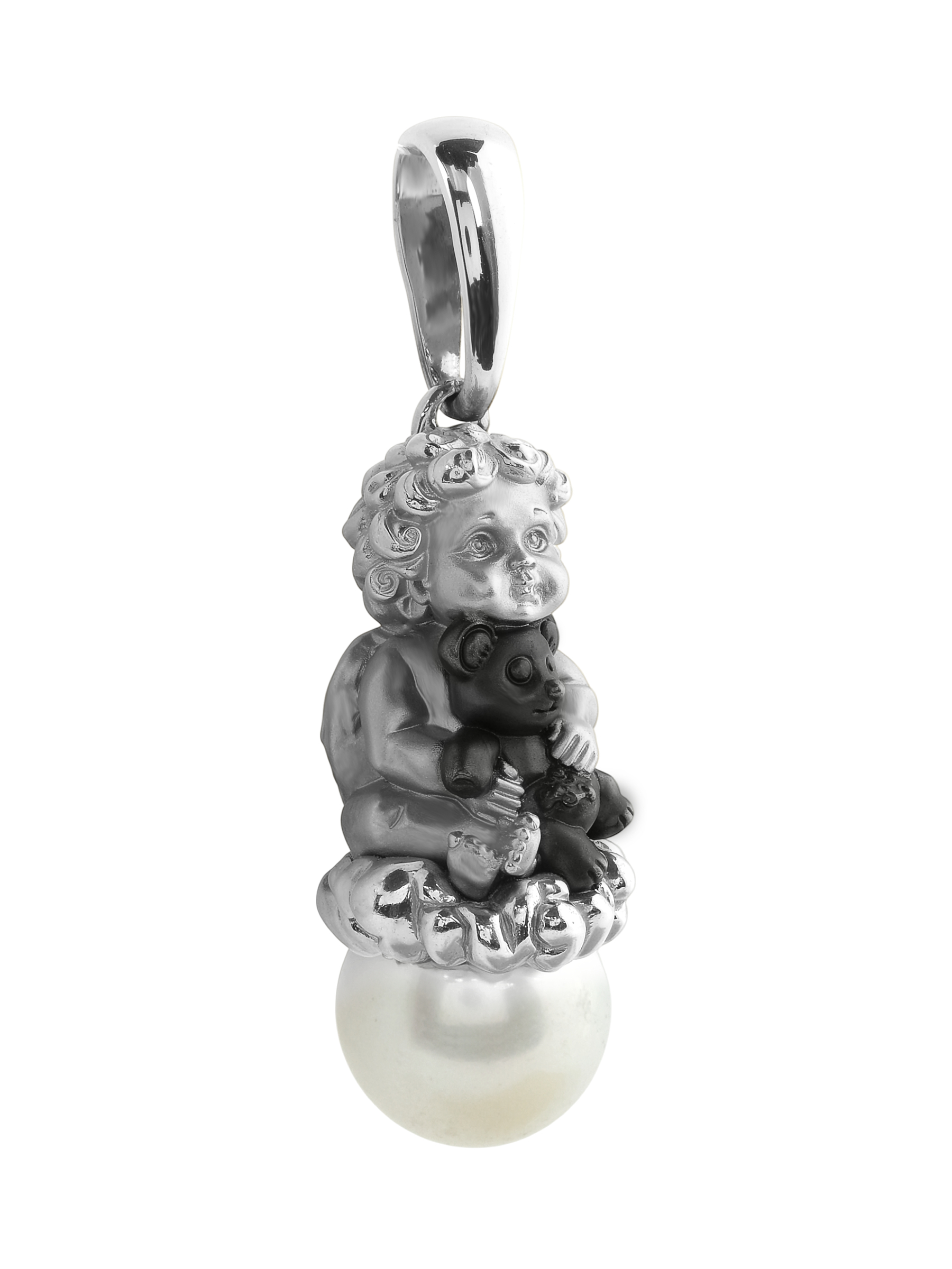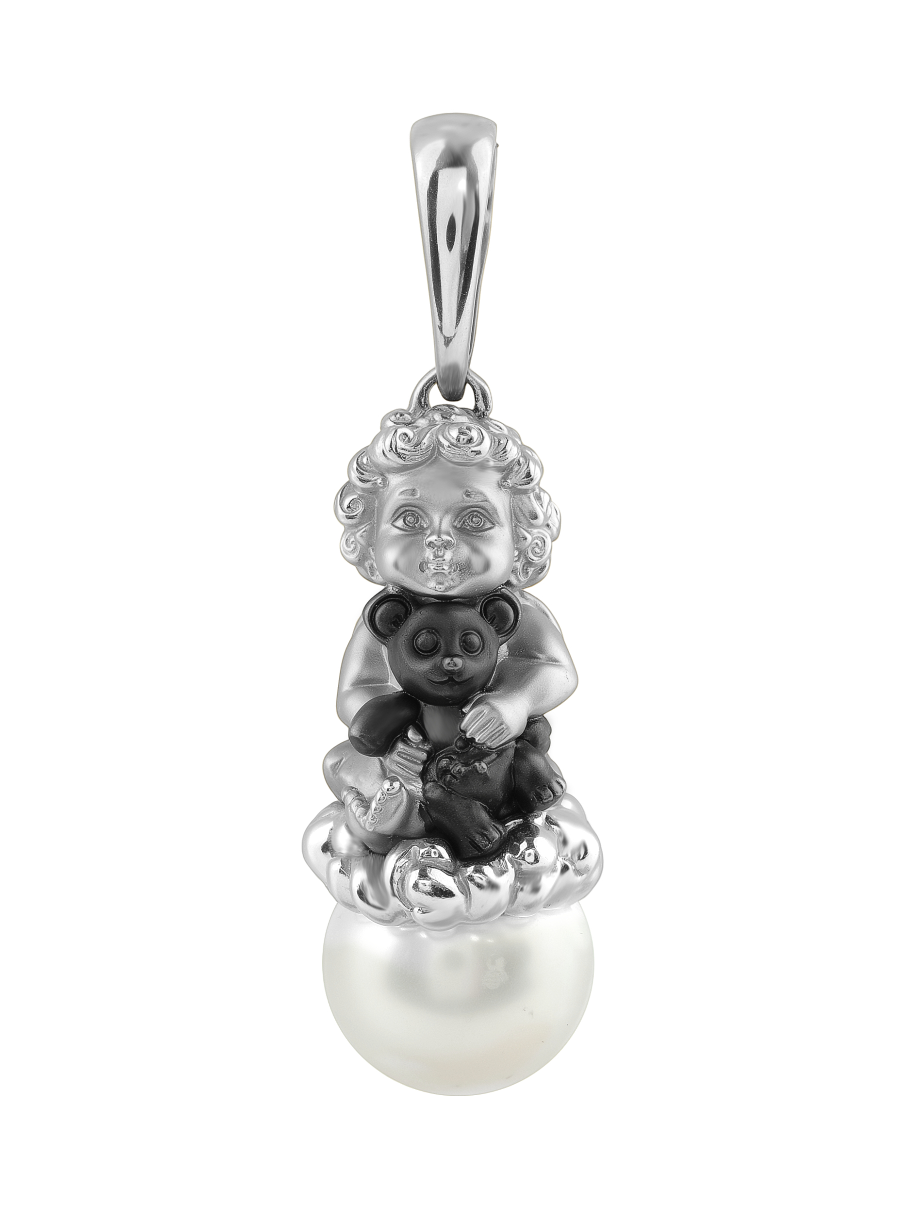 Изысканная подвеска из белого золота 585 пробы из коллекции De Luxe — Купидоны станет утонченным дополнением вашего ювелирного гардероба. Дизайн изделия выполнен в виде фигурки купидона, который держит маленького медвежонка, восседая на облаке, символизирующем нежность и чистоту. В основании композиции расположена одна вставка из жемчуга круглой формы белого цвета, чей мягкий блеск гармонично сочетается с холодным сиянием металла.