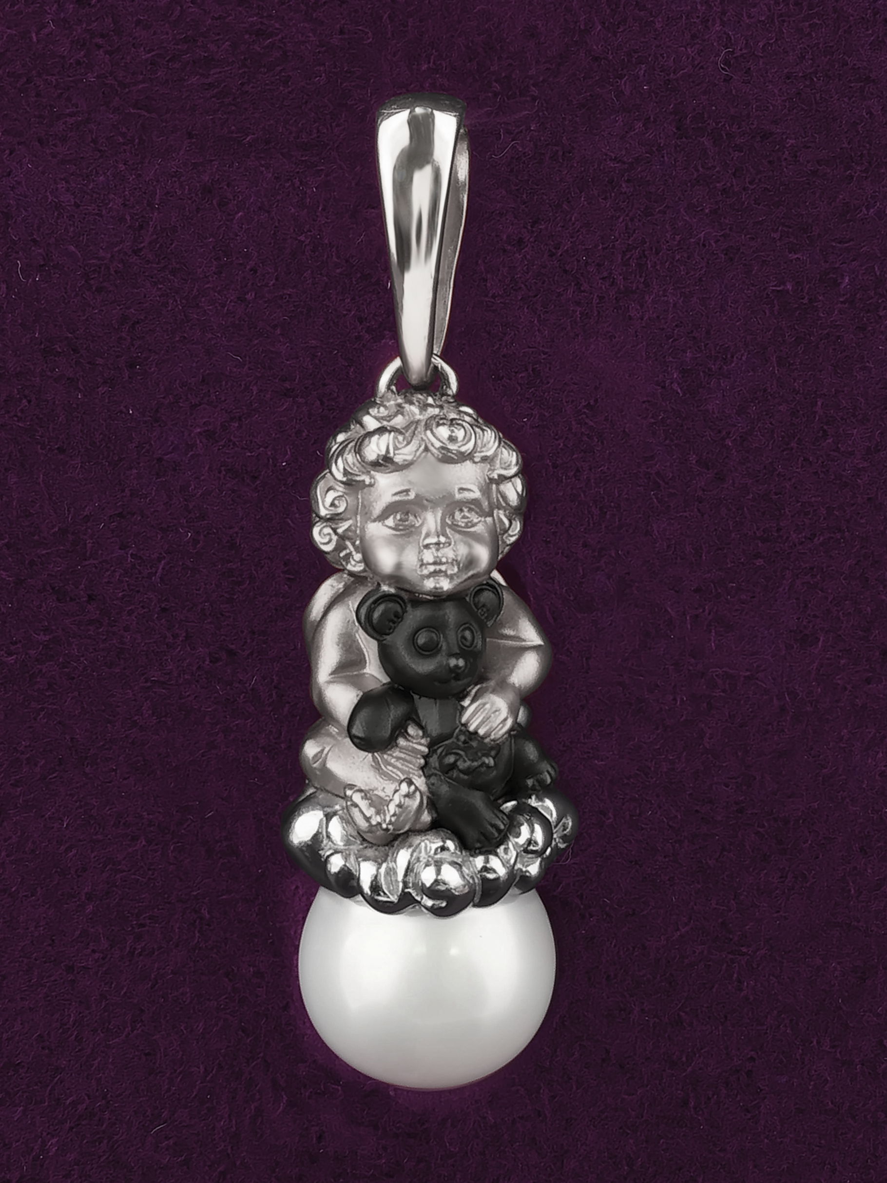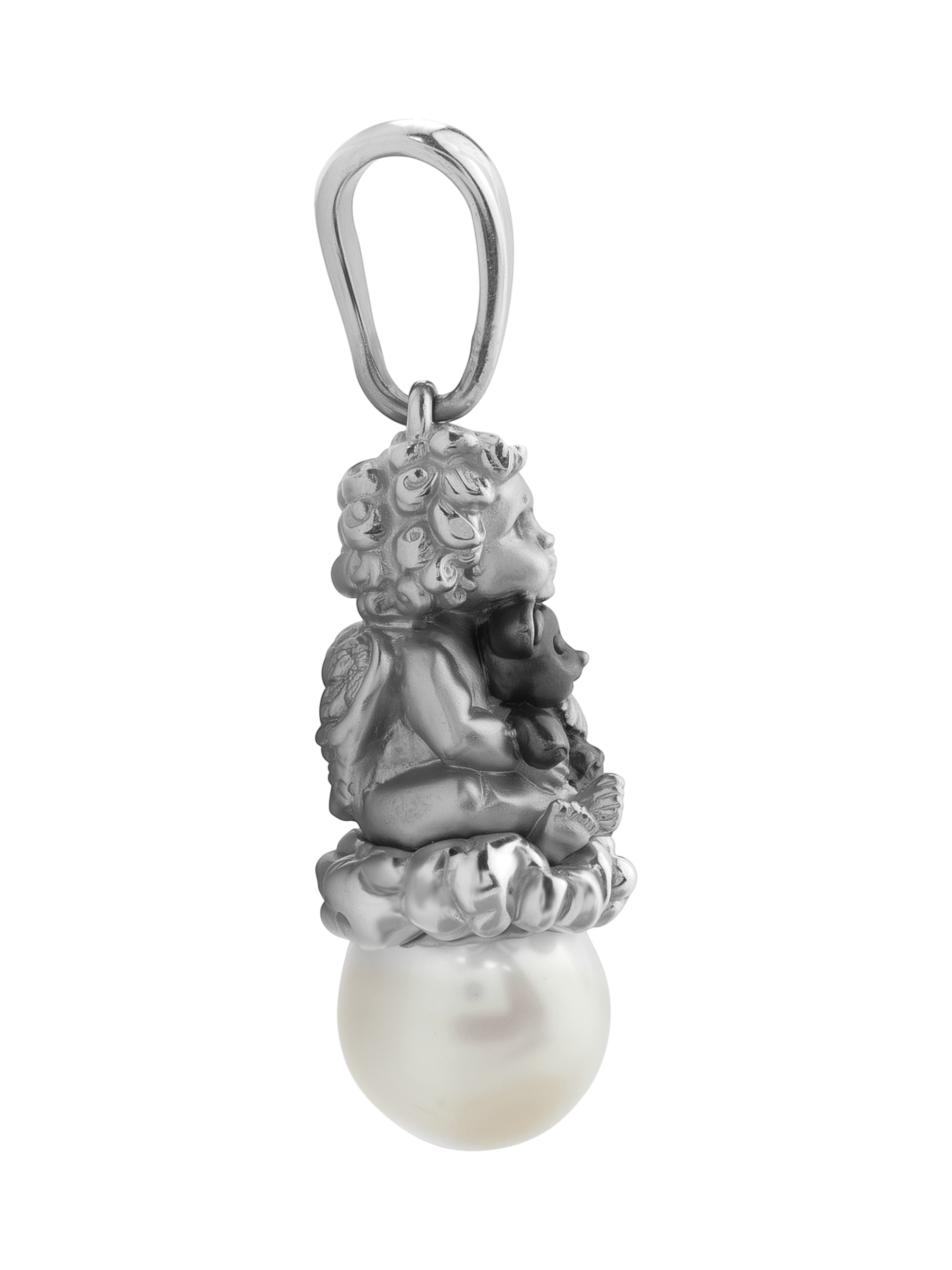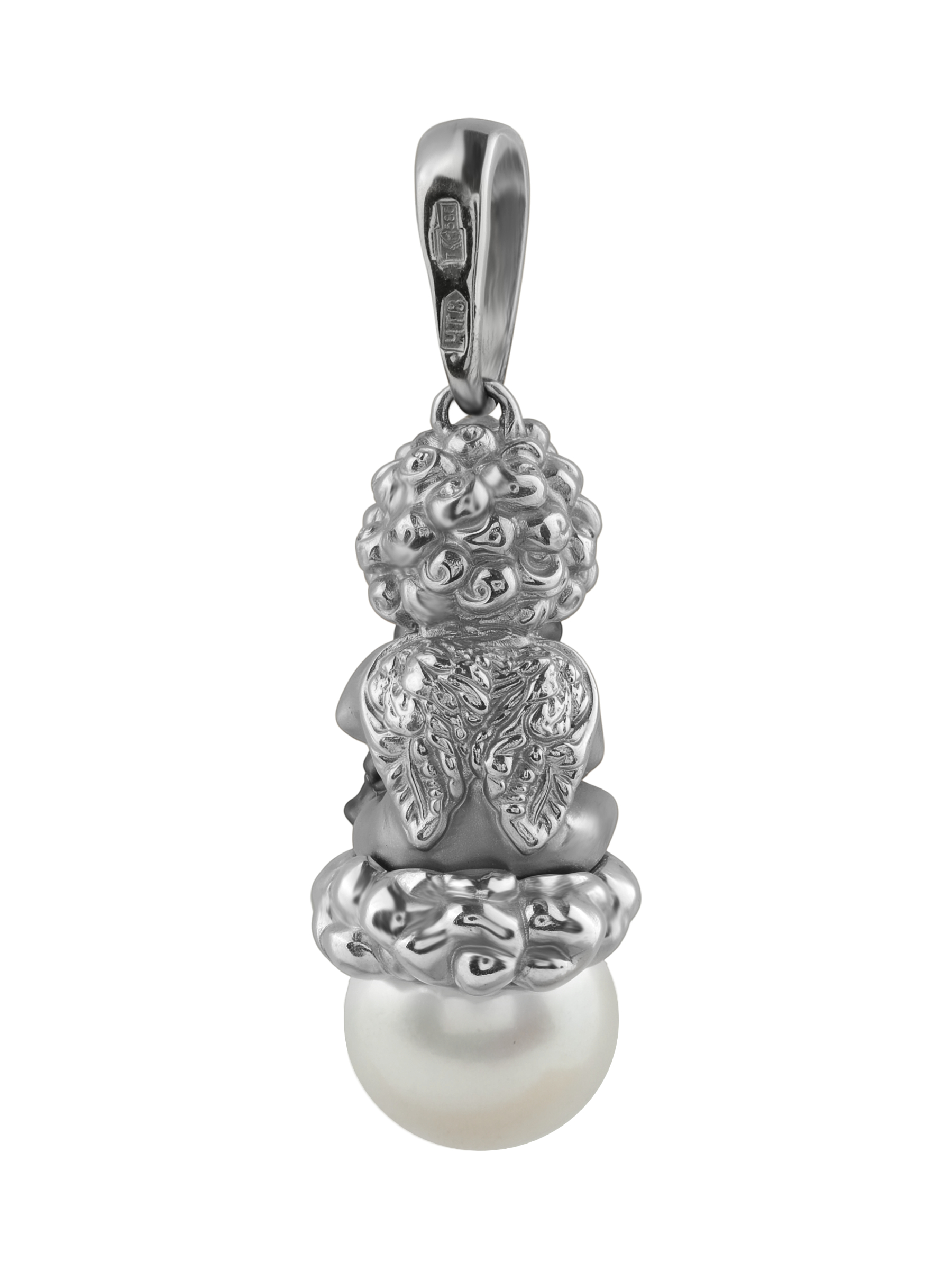 Изысканная подвеска из белого золота 585 пробы из коллекции De Luxe — Купидоны станет утонченным дополнением вашего ювелирного гардероба. Дизайн изделия выполнен в виде фигурки купидона, который держит маленького медвежонка, восседая на облаке, символизирующем нежность и чистоту. В основании композиции расположена одна вставка из жемчуга круглой формы белого цвета, чей мягкий блеск гармонично сочетается с холодным сиянием металла.