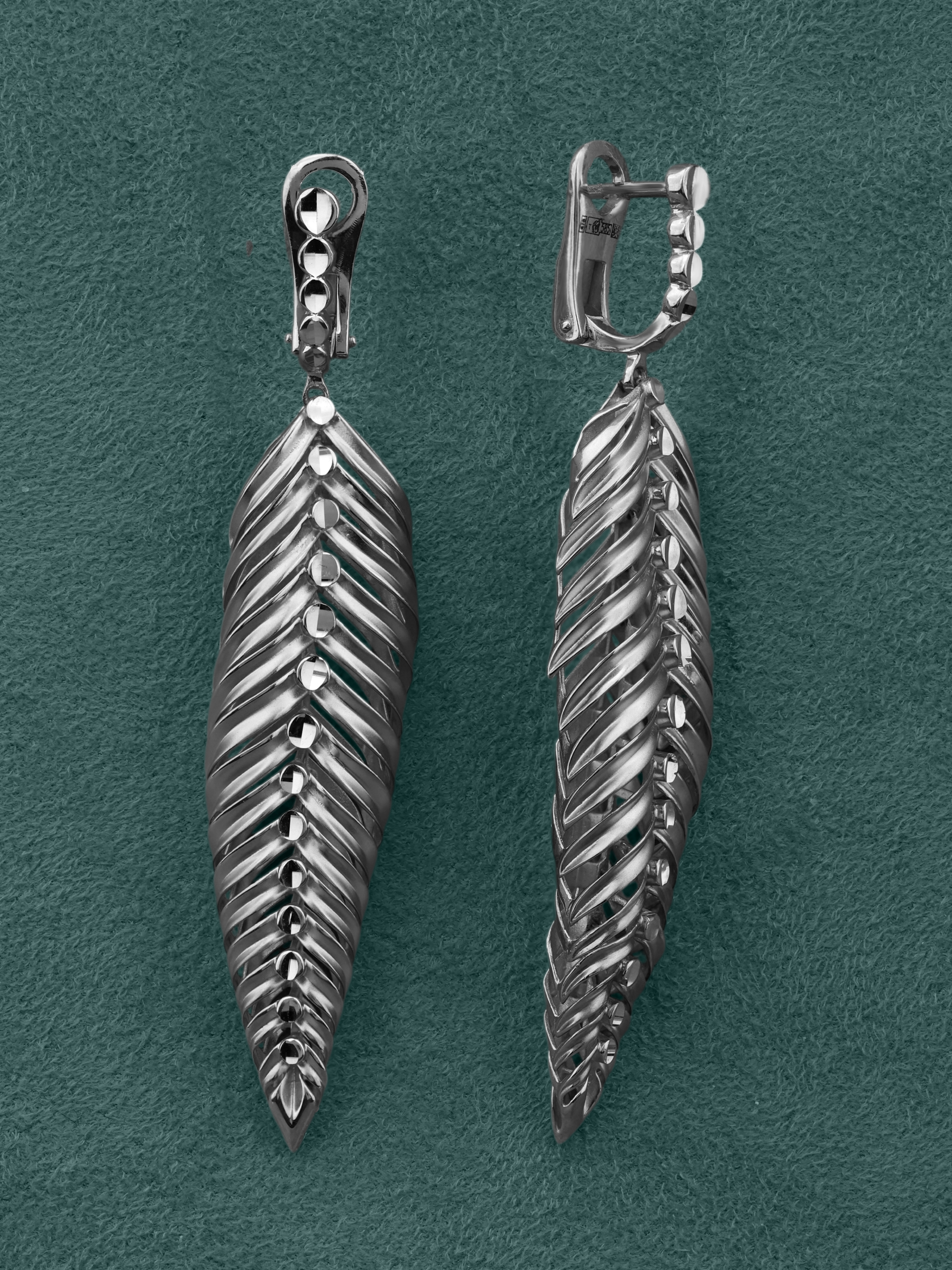 Эффектные серьги из белого золота 585 пробы станут воплощением изысканности и утонченного вкуса в вашем образе. Дизайн изделия вдохновлен природными мотивами — искусная форма листьев пальмы придает украшению природную гармонию и грацию. Холодный блеск белого металла подчеркивает детализацию каждой прожилки, создавая глубокую и выразительную игру света при каждом движении.