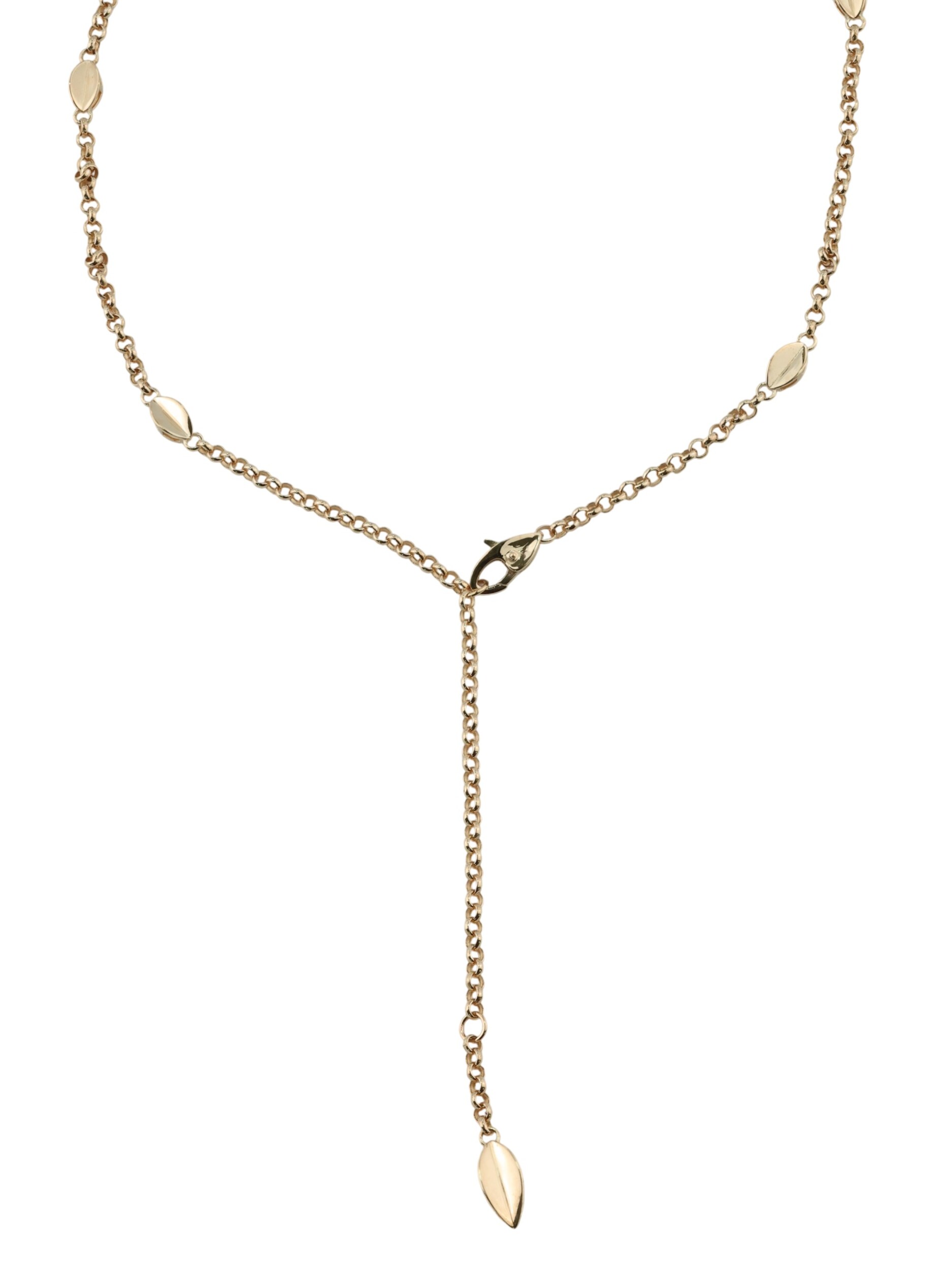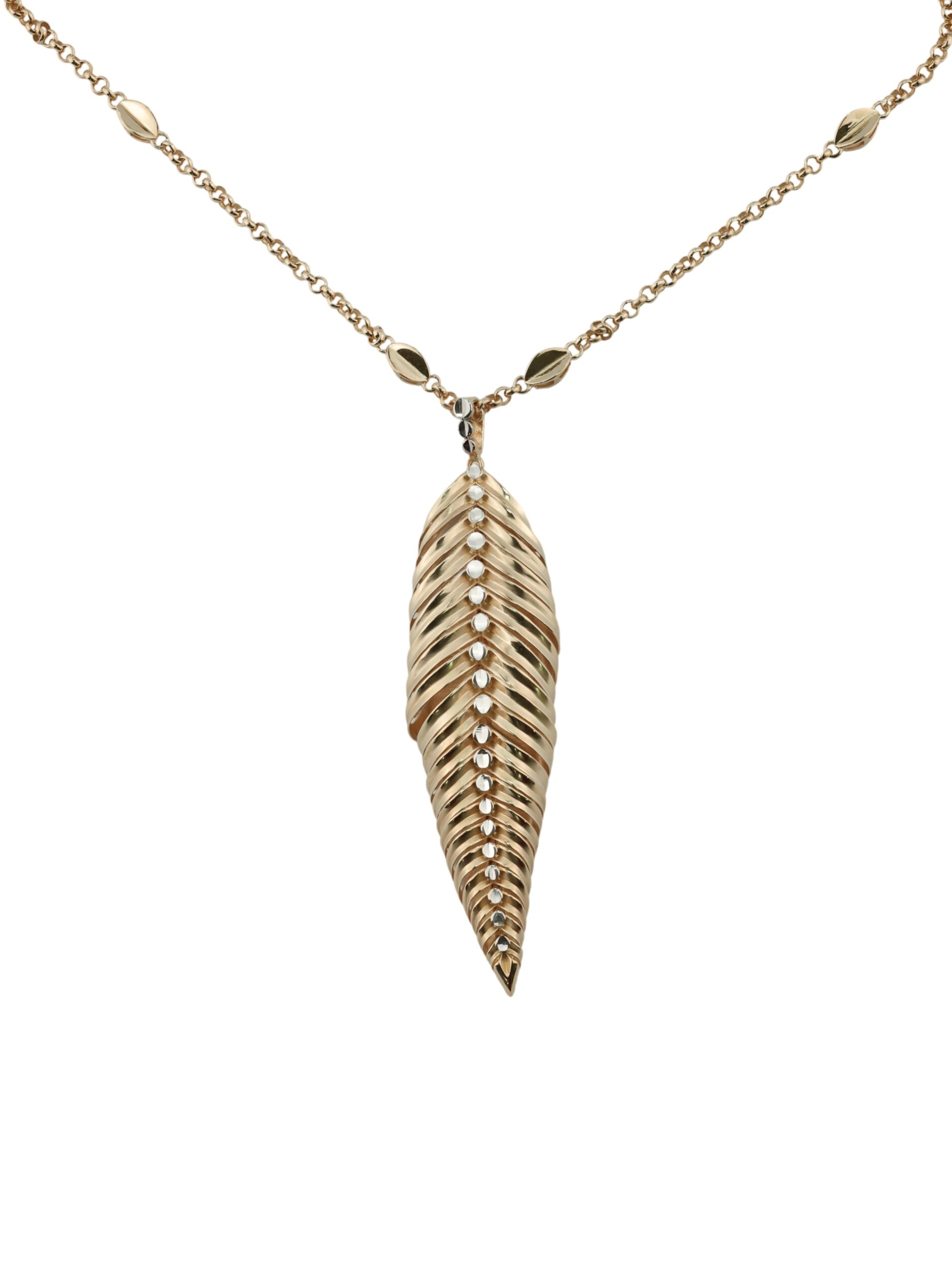 Утонченная цепочка дополнена декоративными элементами, которые придают украшению дополнительный шарм. Это колье — часть продуманных комплектов, поэтому вы легко сможете подобрать к нему другие изделия для создания завершенного ювелирного гарнитура. Красное золото 585 пробы эффектно играет на свету, привлекая внимание к каждой детали дизайна в виде листьев. Выбирая данное украшение, вы делаете ставку на элегантность, которая никогда не выйдет из моды.