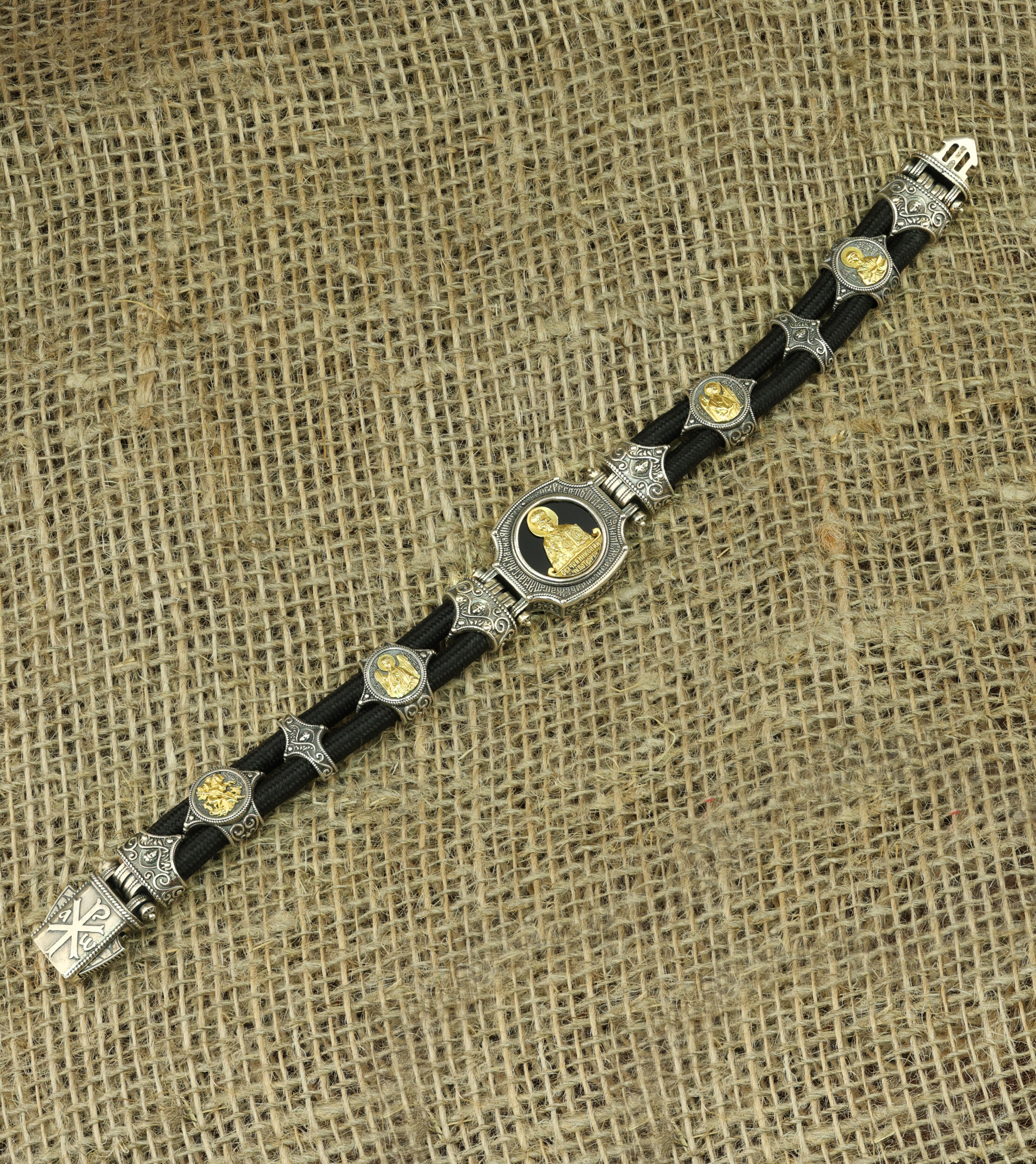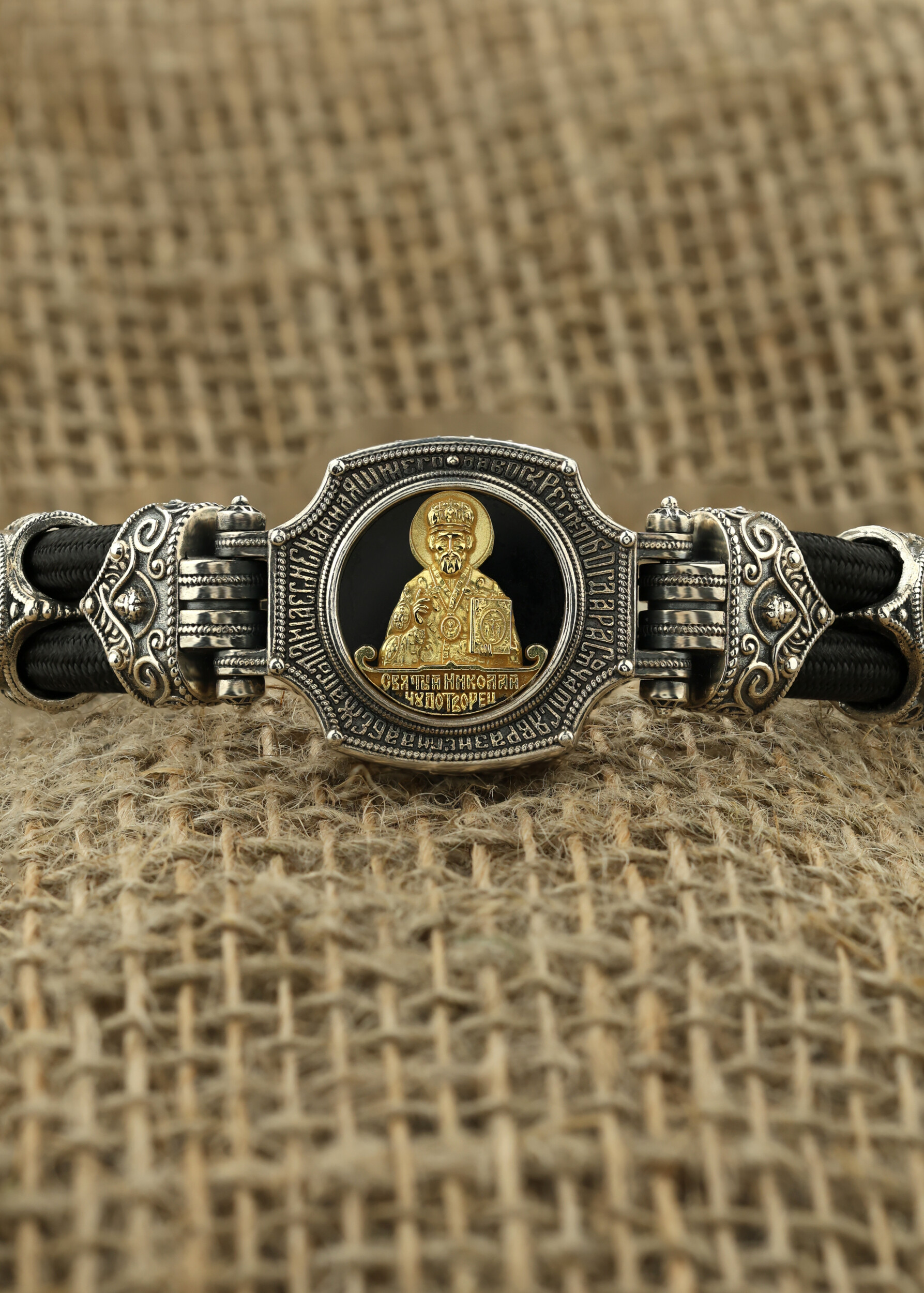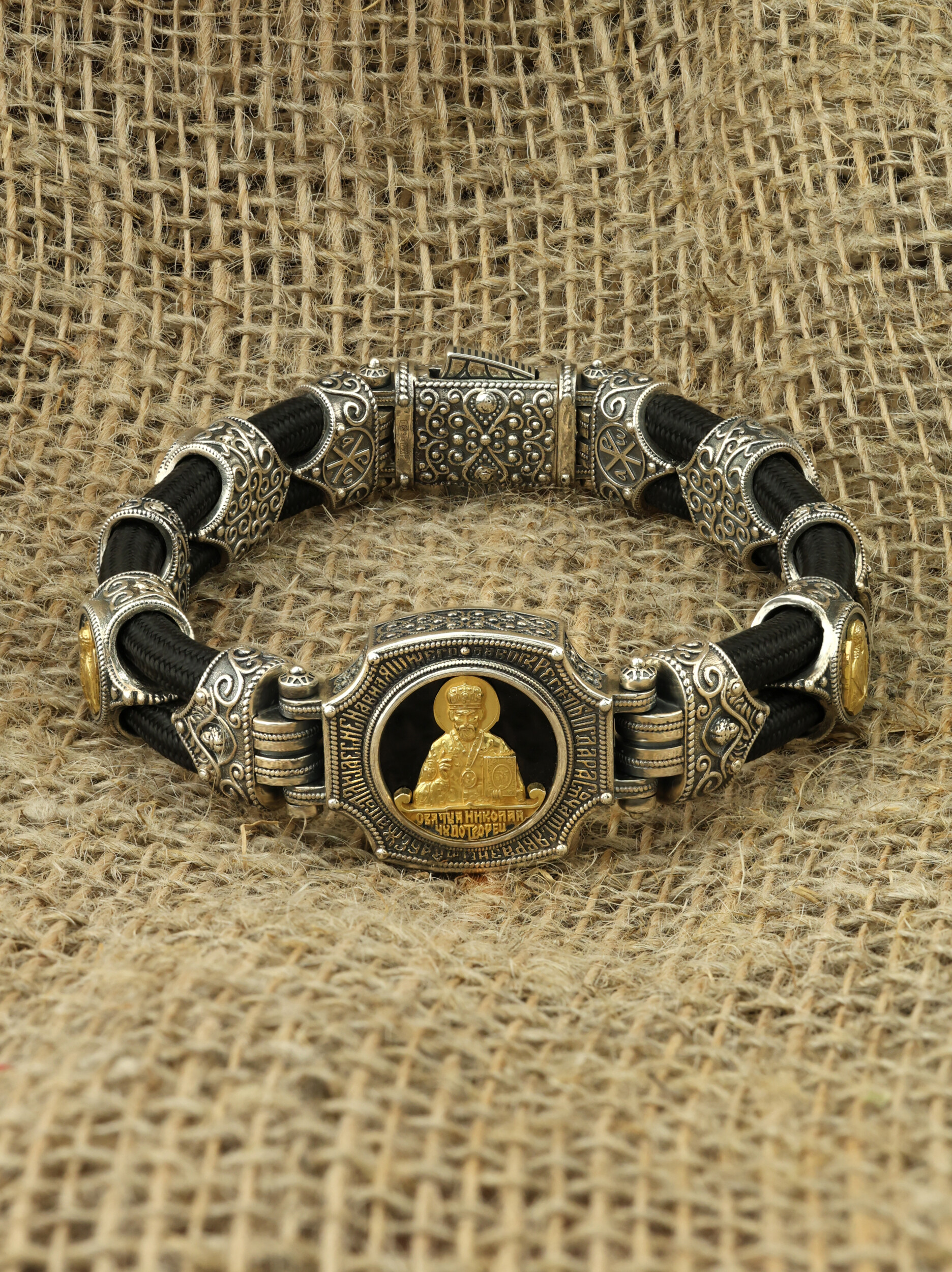 Браслет из серебра и золота c ониксом и шёлковым шнурком