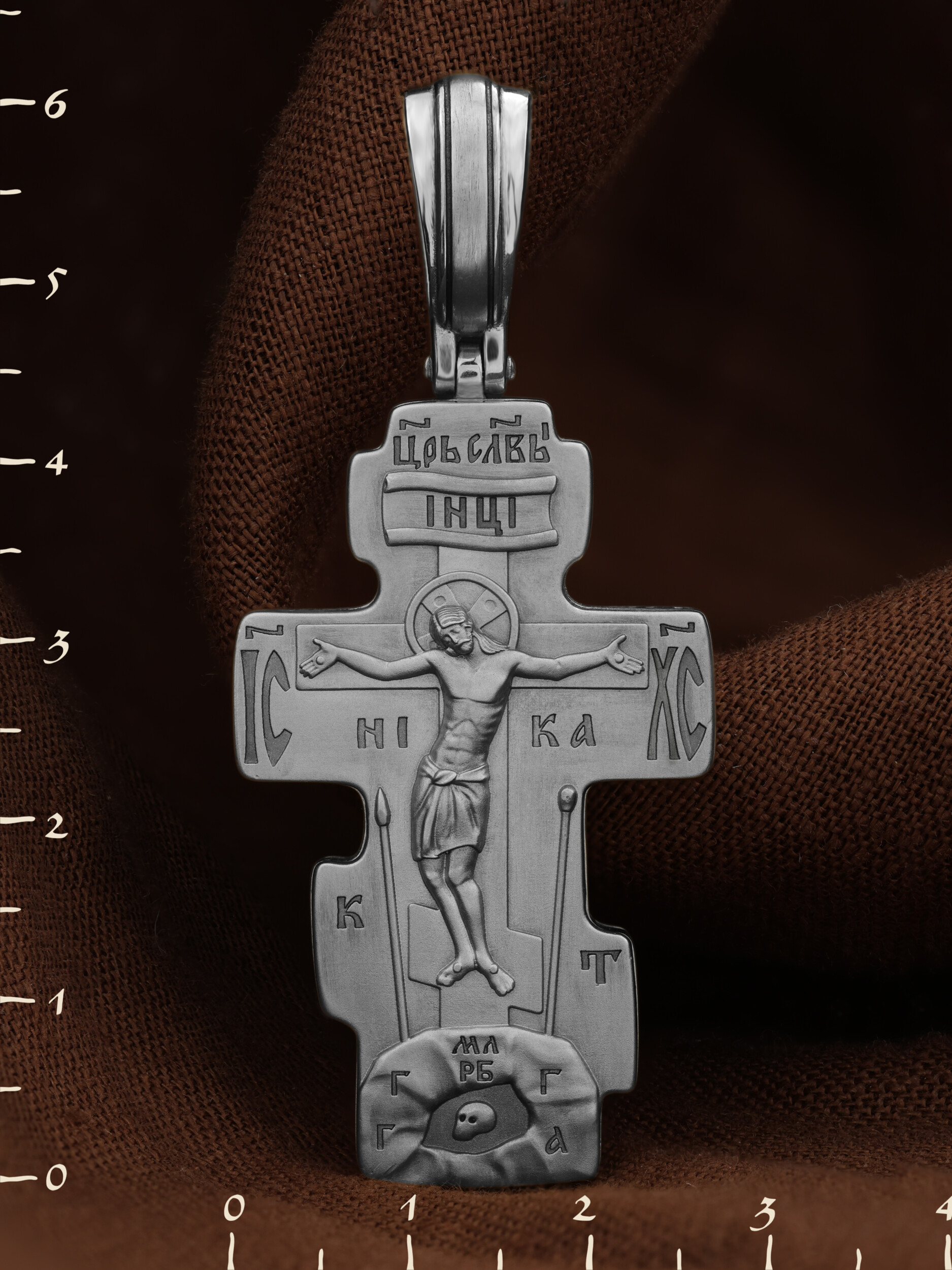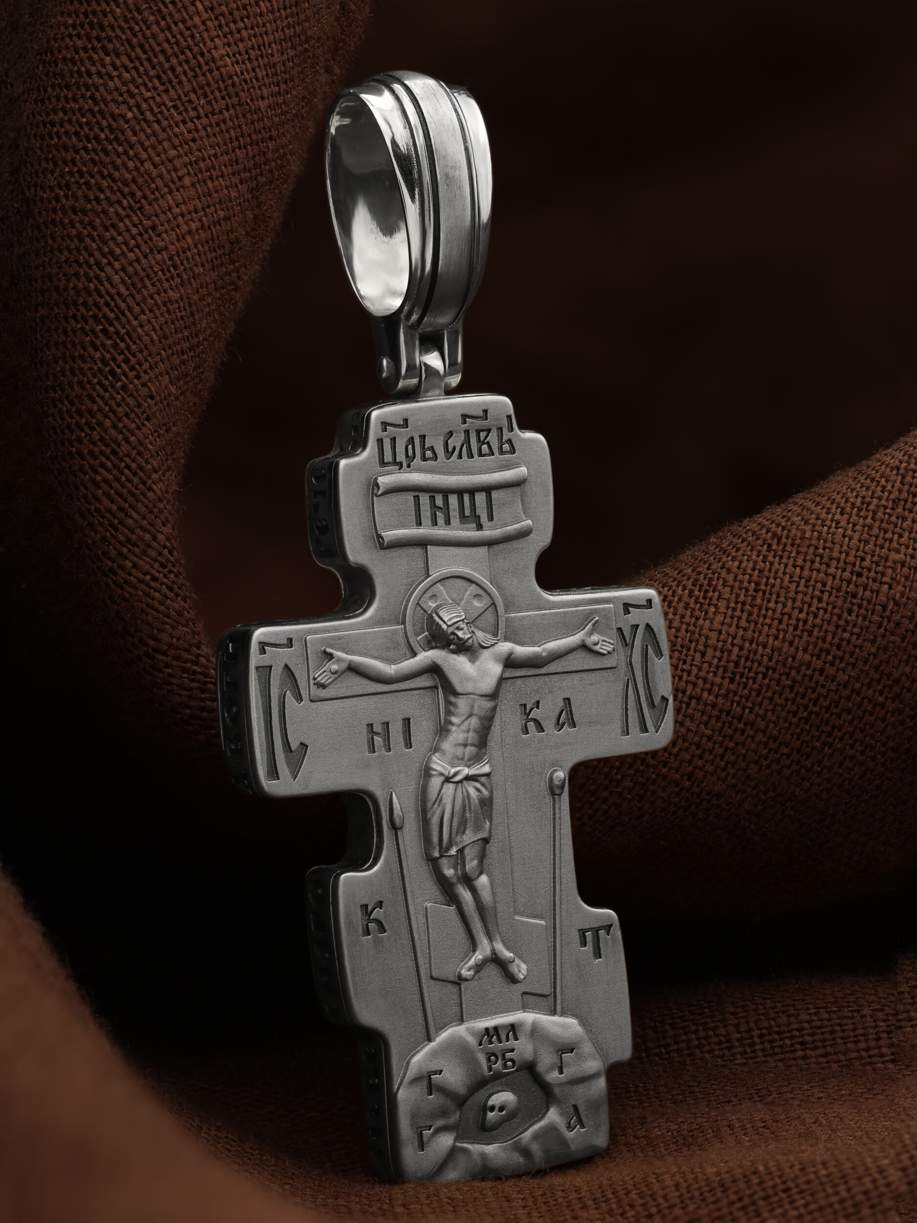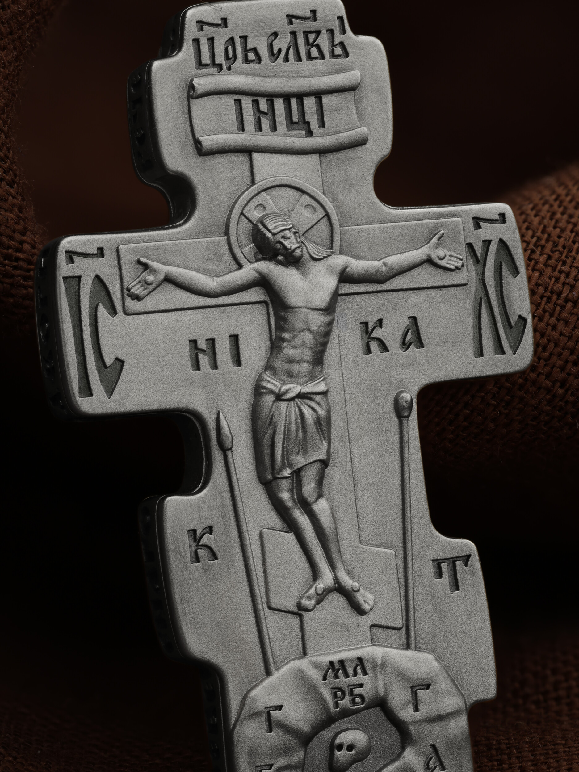 На лицевой стороне креста изображено Распятие Господа и Спасителя нашего Иисуса Христа. Крест- символ спасения и искупления рода человеческого, знамение победы над смертью и адом. Иисус Христос, как искупительная жертва освобождения человечества от власти греха, умер крестной смертью и в третий день воскрес. Над вершиной Распятия помещена надпись «Царь Славы». На верхней табличке, выше головы Иисуса, расположена надпись, составленная Понтием Пилатом — «IНЦI». Она означает «Иисус Назорей, Царь Иудейский». Надпись «IC» «ХC», означает Иисус Христос, помещается на разных сторонах поперечной перекладины креста. Под ней помещено слово «НIКА», что означает Победитель. Крест стоит на горе камней, символизирующих Голгофу, которая обозначена надписью «Г Г». В ее основании различается череп — это голова Адама, обозначенный надписью «Г А». Надпись «МЛРБ» — «место лобное рай бысть» означает место лобное стало раем. Вдоль креста изображены орудия Страстей Христовых: копие сотника Лонгина, которым пронзили подреберье мёртвого Иисуса, чтобы убедиться в Его смерти, и трость с губкой, с которой Иисуса напоили уксусом. Они обозначены буквами «К» и «Т».