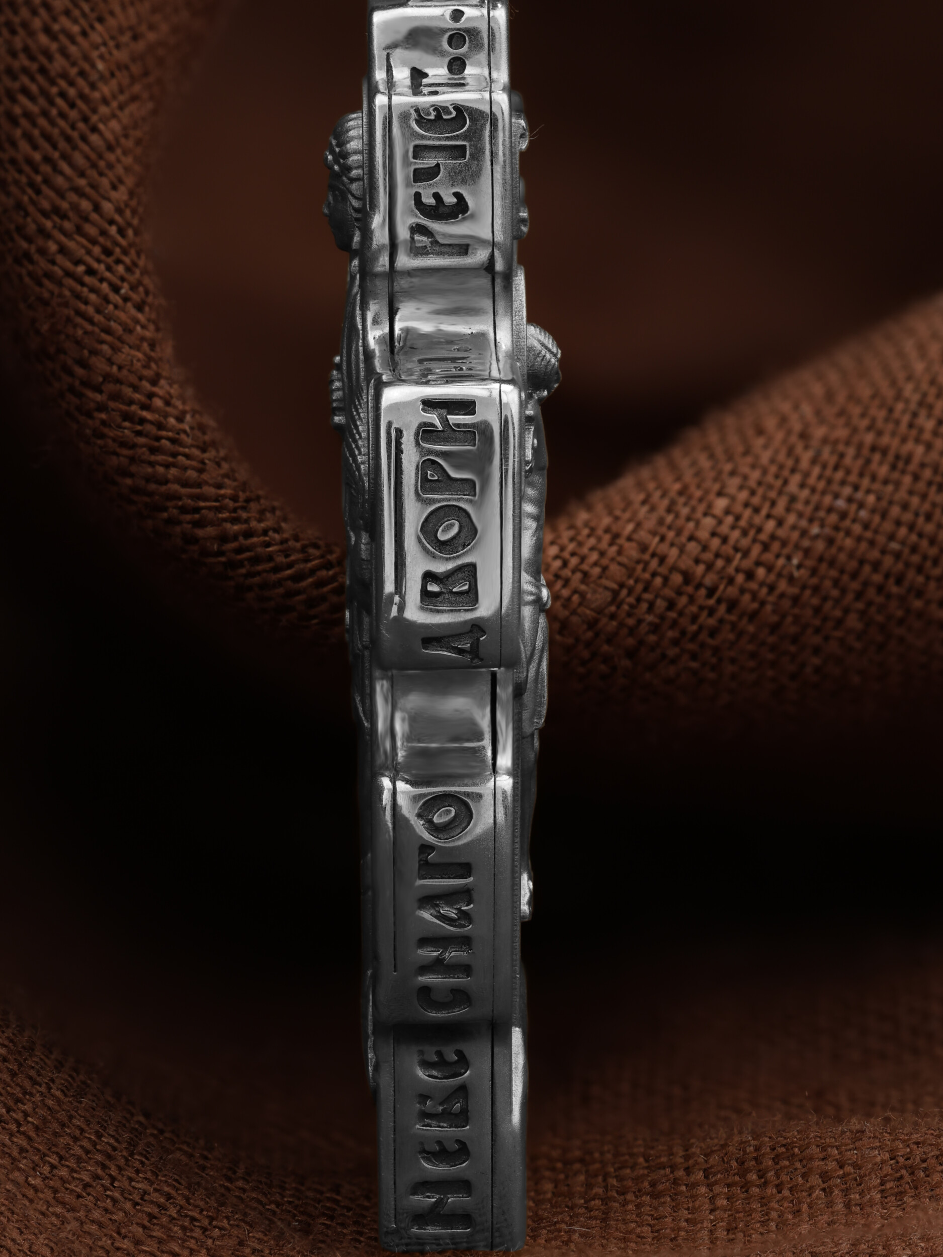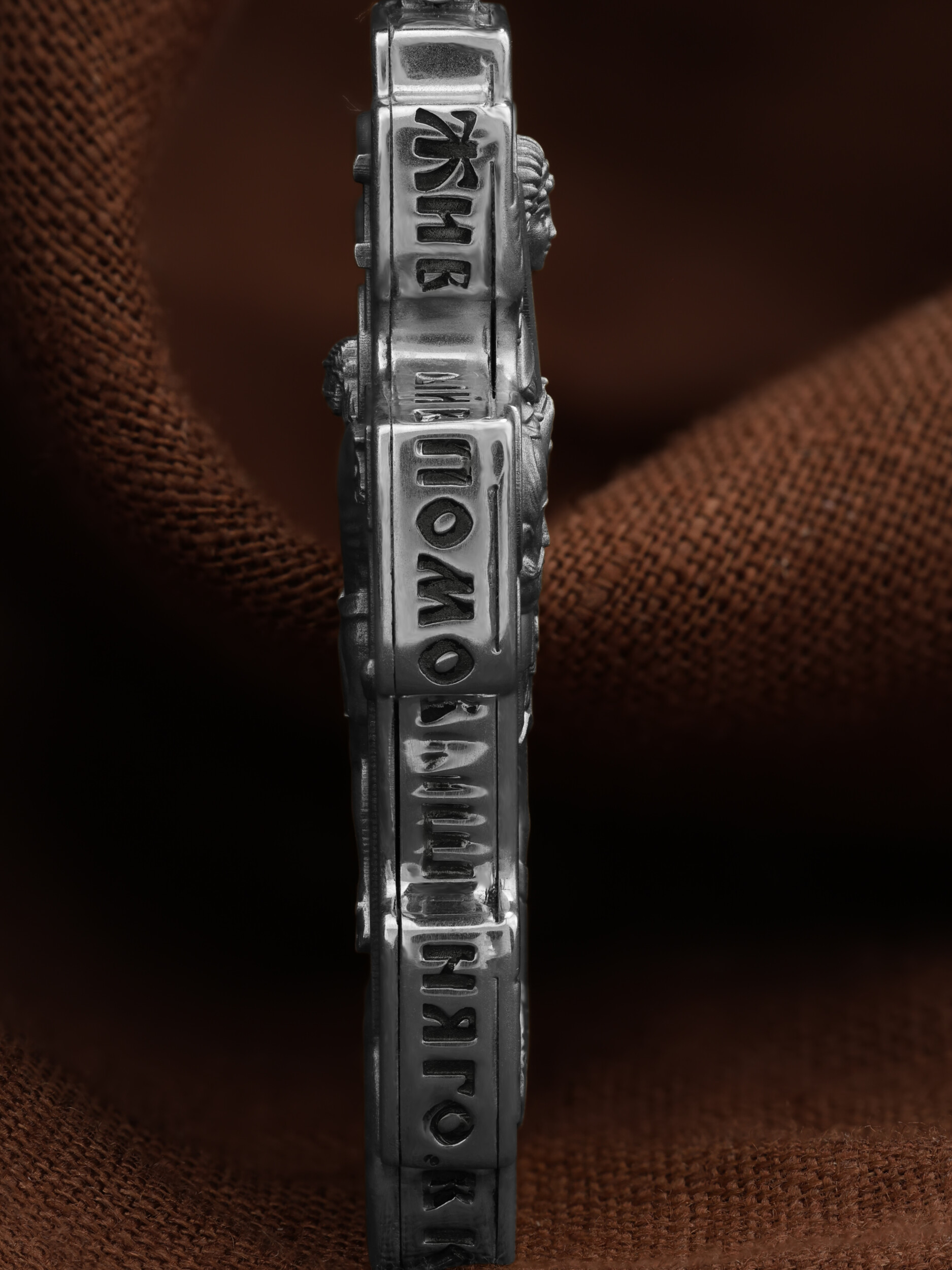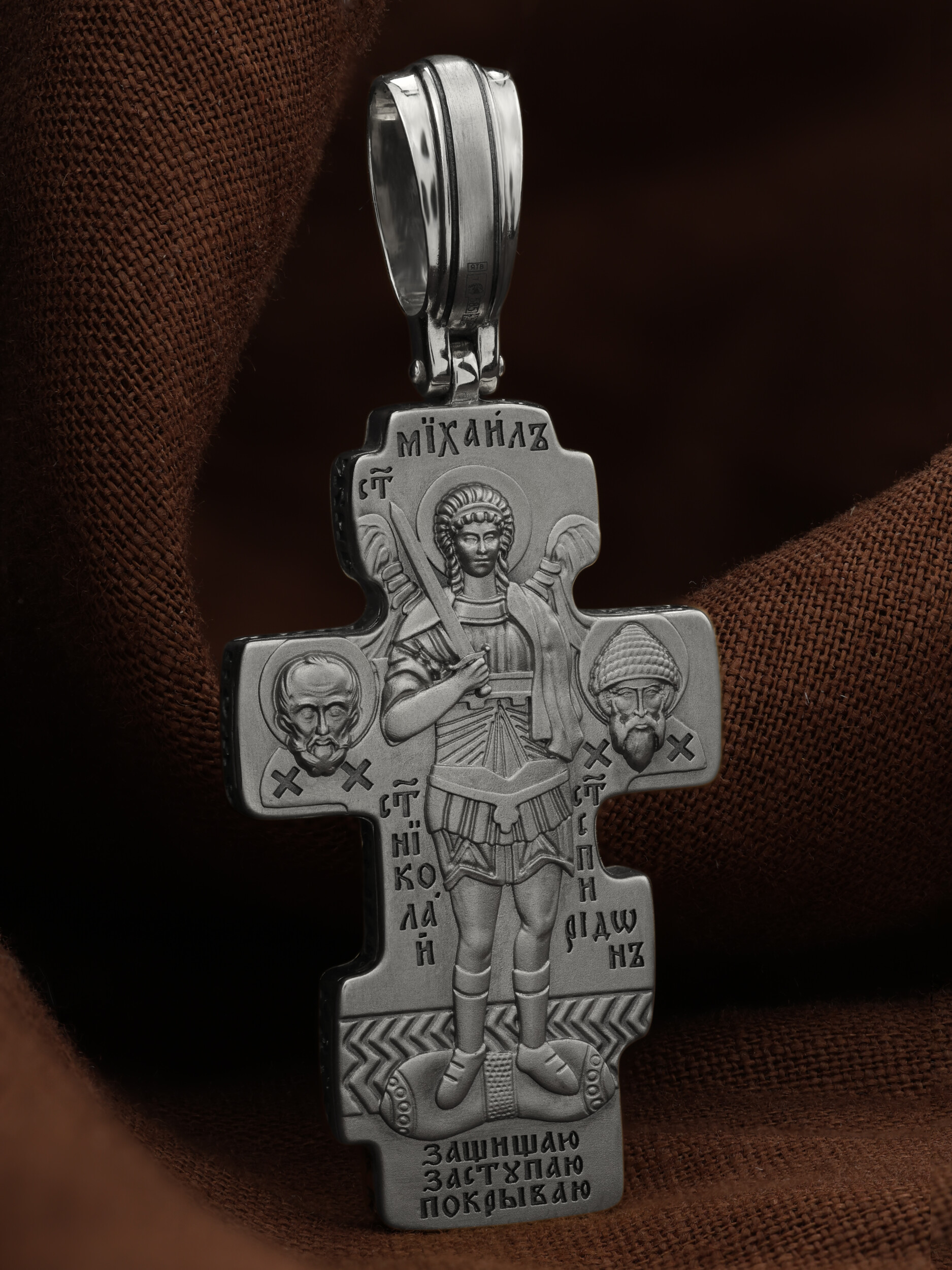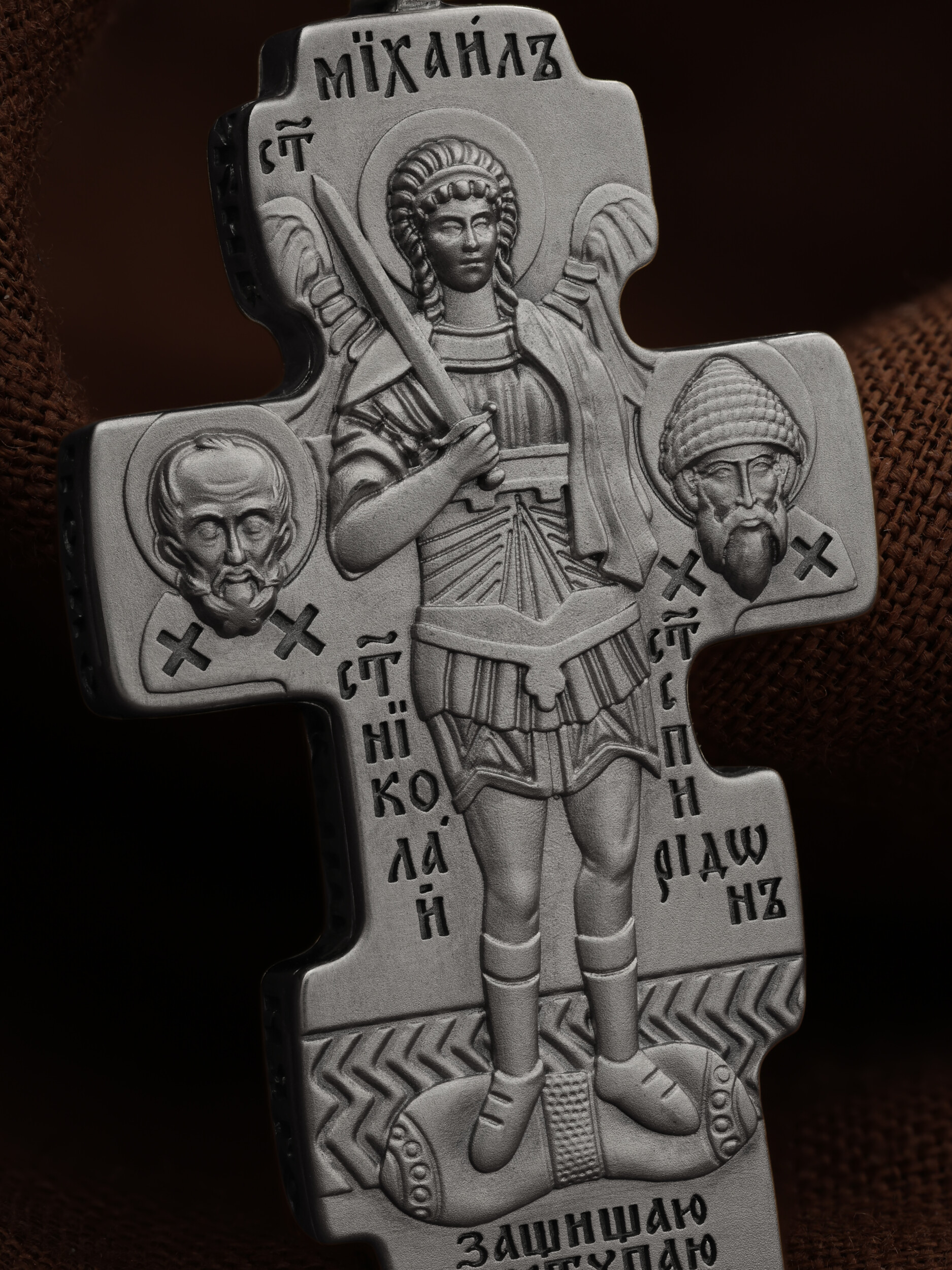 Центральную часть оборотной стороны креста занимает изображение Архангела Михаила — верного служителя Божия, который низринул с Неба возгордившегося денницу с другими павшими духами. В Православии его называют Архистратигом, что означает глава святого воинства Ангелов и Архангелов. Архангел Михаил изображен в воинственном виде с огненным мечом в правой руке. Архангел почитается как покровитель воинов и всех верных Богу и ведущих борьбу против сил зла, борец против ересей, а также защитник душ умерших, страж райских врат. С древних времен прославлен своими чудесами Архангел Михаил на Руси. Слева от образа Архангела изображен Святитель Николай Чудотворец, архиепископ Мир Ликийских, справа — Святитель Спиридон Тримифутский Чудотворец. Святители являются одними из самых почитаемых святых в православном мире. На торцевой стороне креста размещены слова молитвы из 90-го псалма: «Живый в помощи Вышняго, в крове Бога Небеснаго водворится. Речет…»