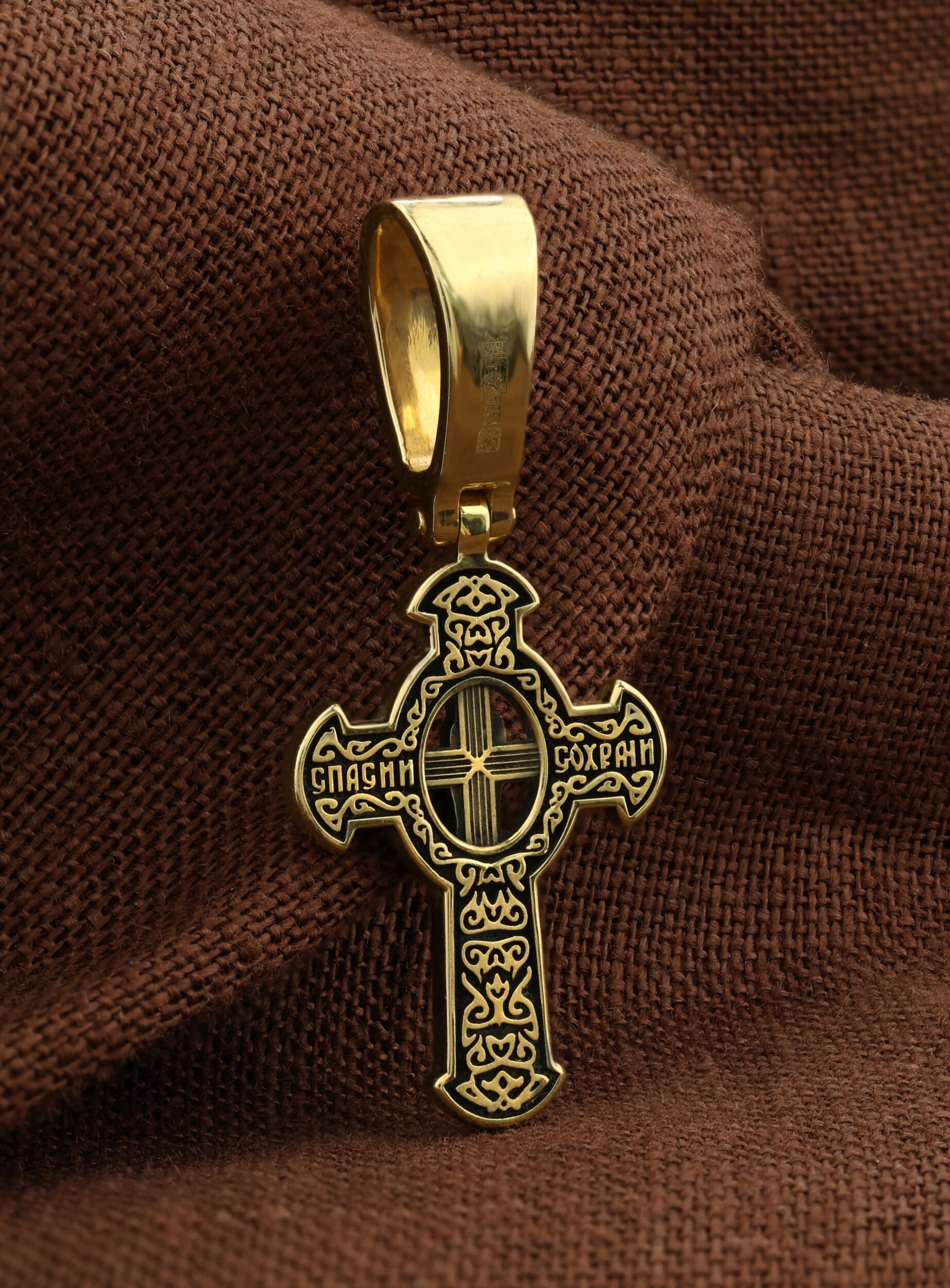 Оборотная сторона креста украшена растительным орнаментом. Помещенный на крест орнамент символизирует жизнедательную силу, животворное тепло креста. В растительный узор, на горизонтальной перекладине, вписано молитвенное славословие: «Спаси и сохрани». Эта надпись означает непрерывную молитву, совершаемую носителем данного креста.