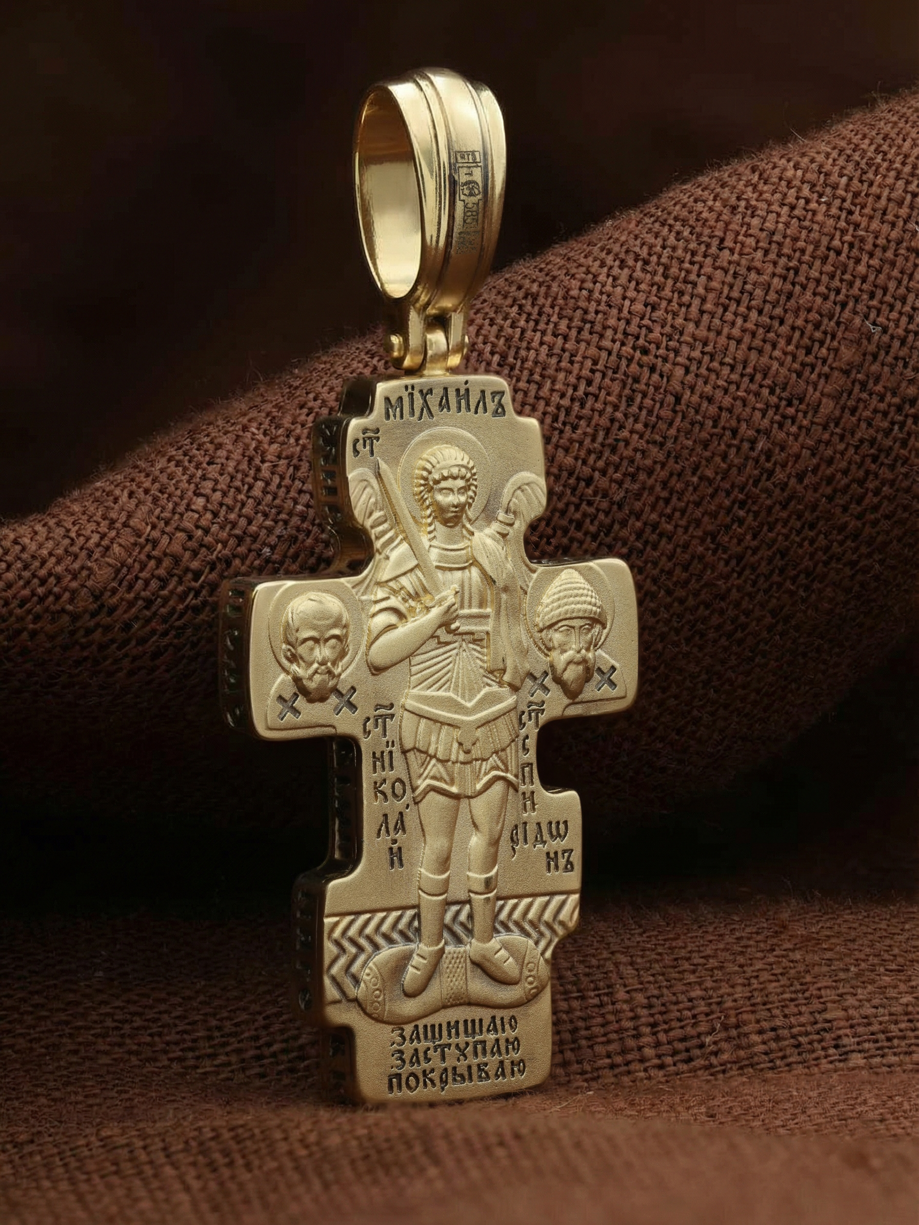 Центральную часть оборотной стороны креста занимает изображение Архангела Михаила — верного служителя Божия, который низринул с Неба возгордившегося денницу с другими павшими духами. В Православии его называют Архистратигом, что означает глава святого воинства Ангелов и Архангелов. Архангел Михаил изображен в воинственном виде с огненным мечом в правой руке. Архангел почитается как покровитель воинов и всех верных Богу и ведущих борьбу против сил зла, борец против ересей, а также защитник душ умерших, страж райских врат. С древних времен прославлен своими чудесами Архангел Михаил на Руси. Слева от образа Архангела изображен Святитель Николай Чудотворец, архиепископ Мир Ликийских, справа — Святитель Спиридон Тримифутский Чудотворец. Святители являются одними из самых почитаемых святых в православном мире. На торцевой стороне креста размещены слова молитвы из 90-го псалма: «Живый в помощи Вышняго, в крове Бога Небеснаго водворится. Речет…»