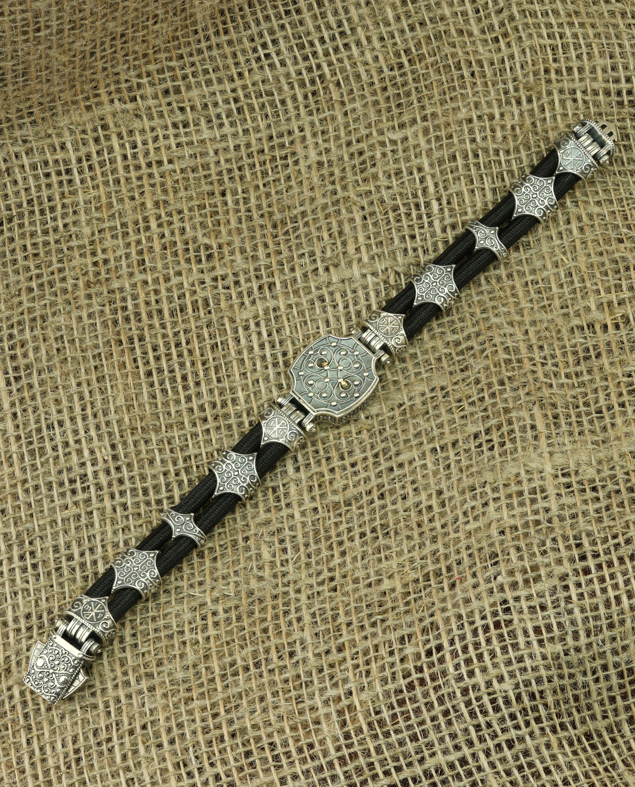Браслет из серебра и золота c ониксом и шёлковым шнурком