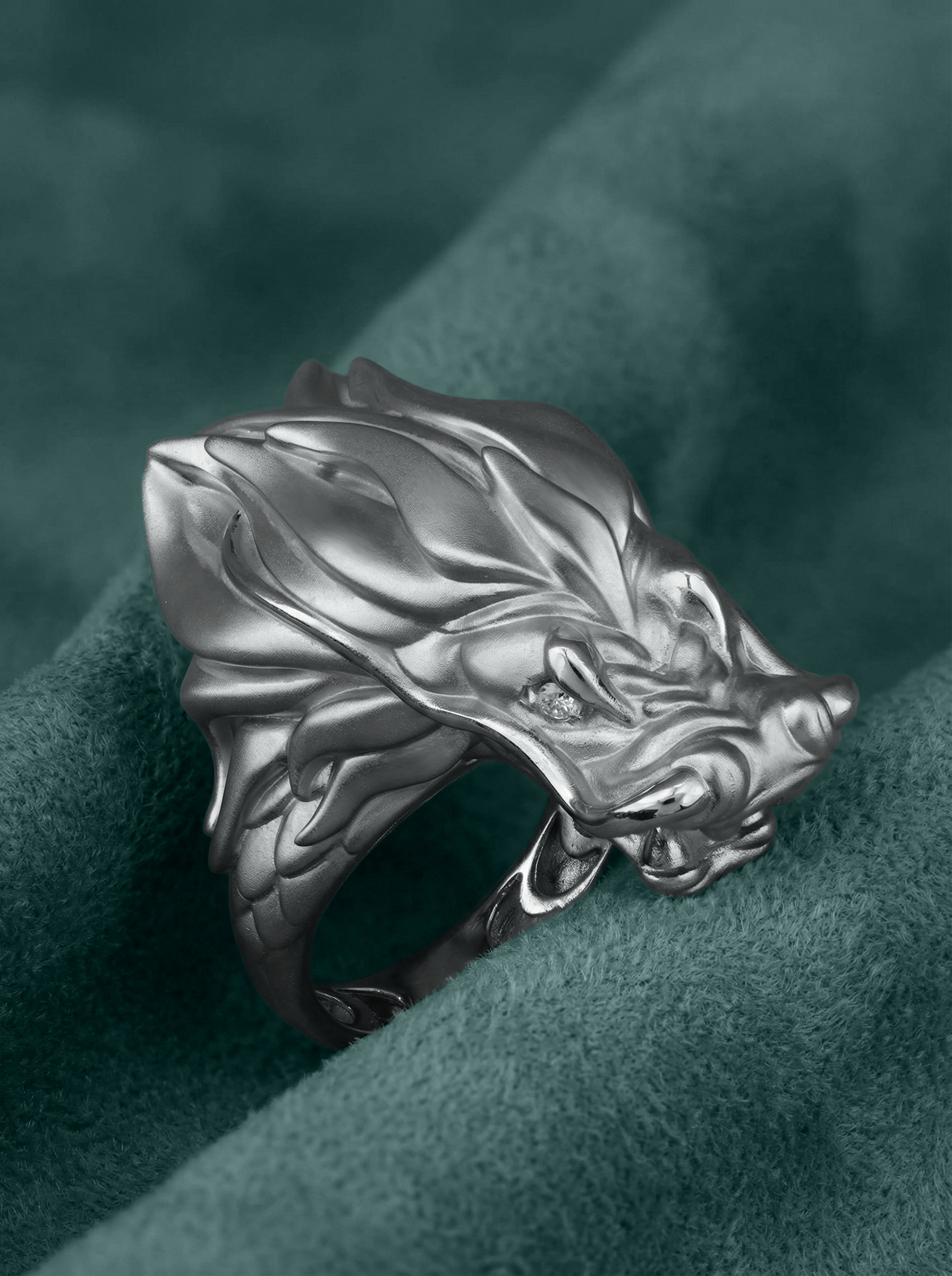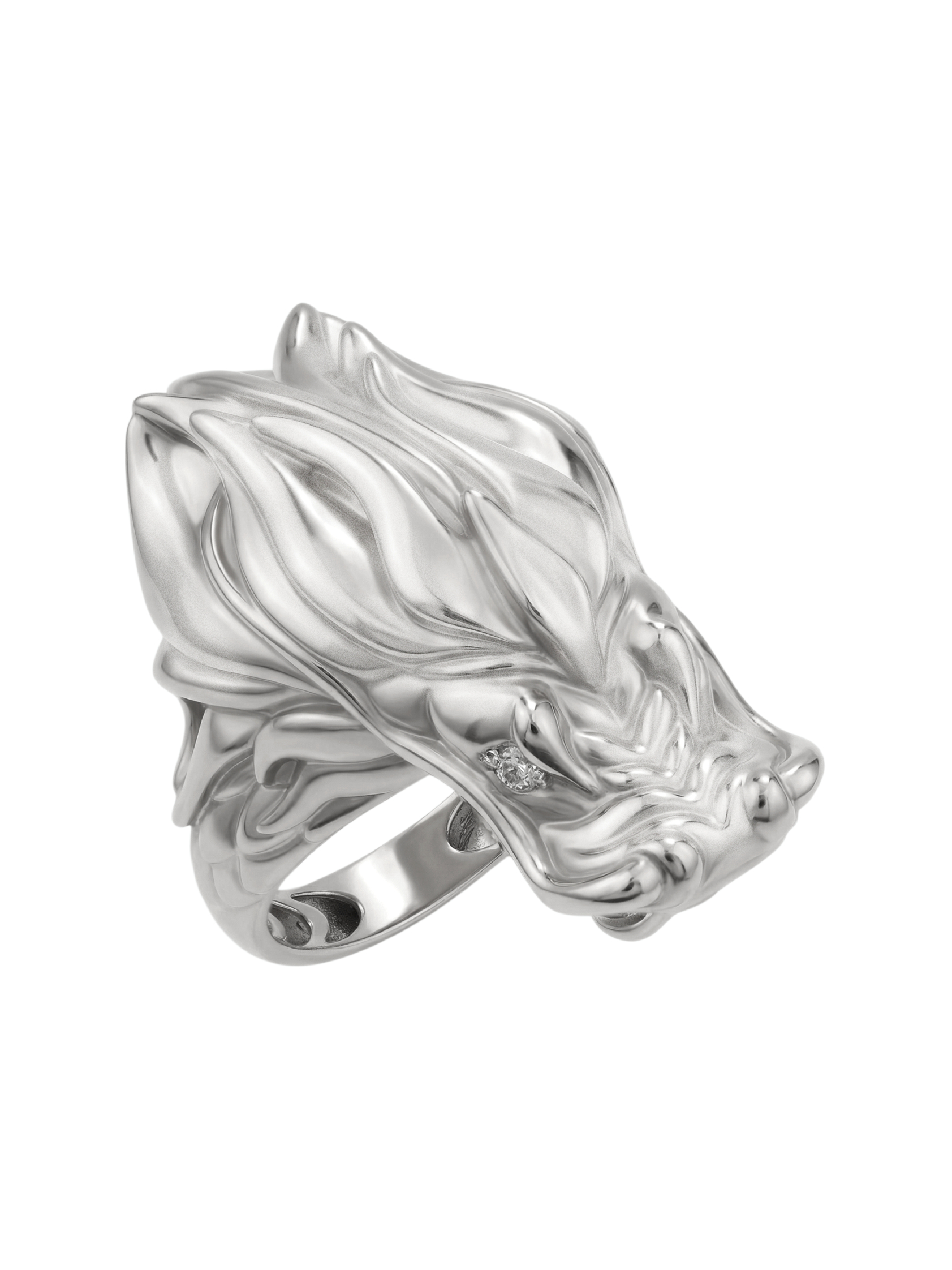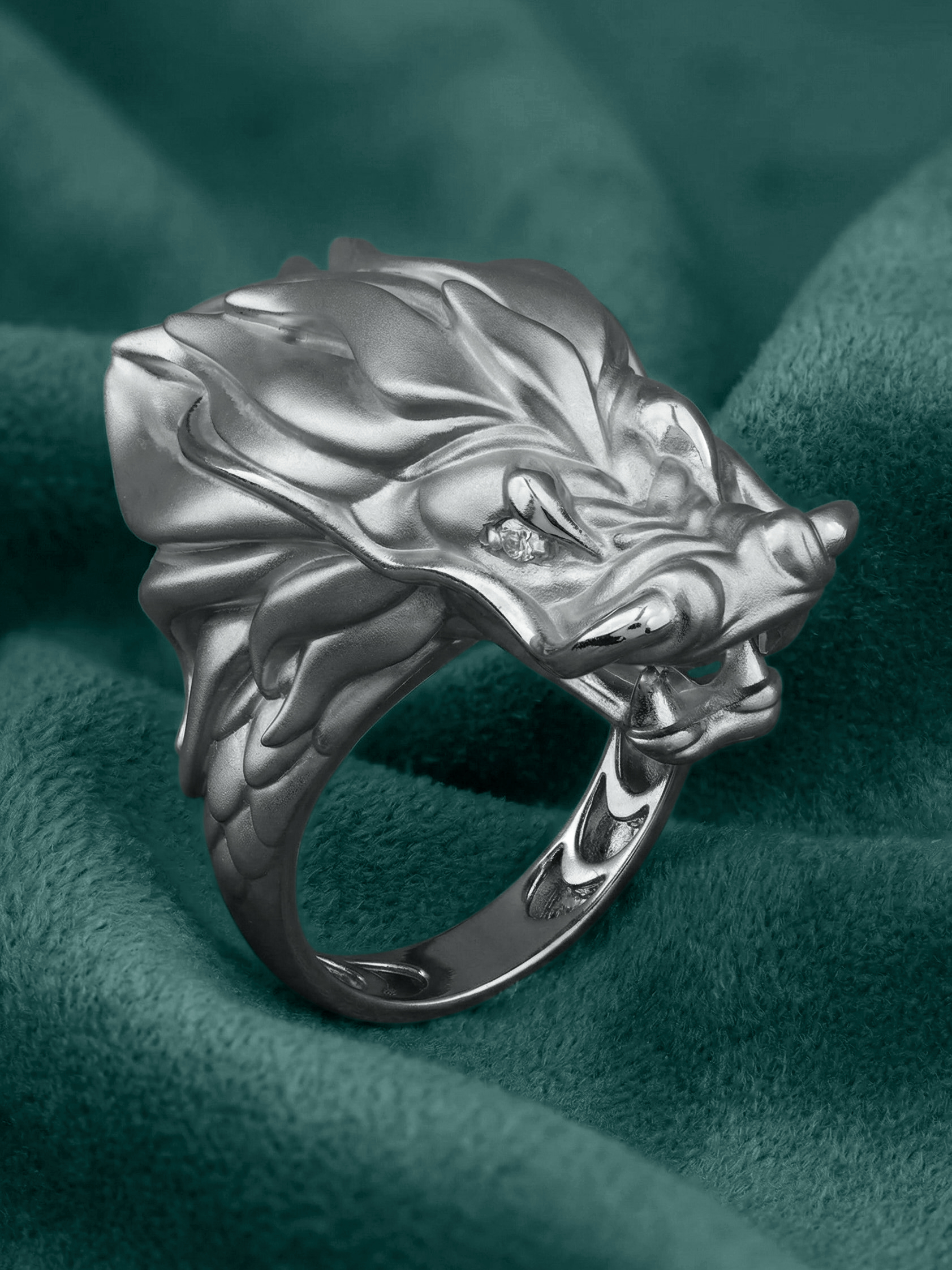 В центре композиции — благородное белое золото, чей холодный блеск подчеркивает агрессивную и одновременно изящную эстетику дракона. Глаза мифического существа инкрустированы двумя бриллиантами круглой формы белого цвета, которые добавляют изделию живой блеск и выразительность. Сочетание драгоценного металла и сверкающих камней превращает кольцо в настоящий артефакт, подчеркивающий статус своего обладателя.
