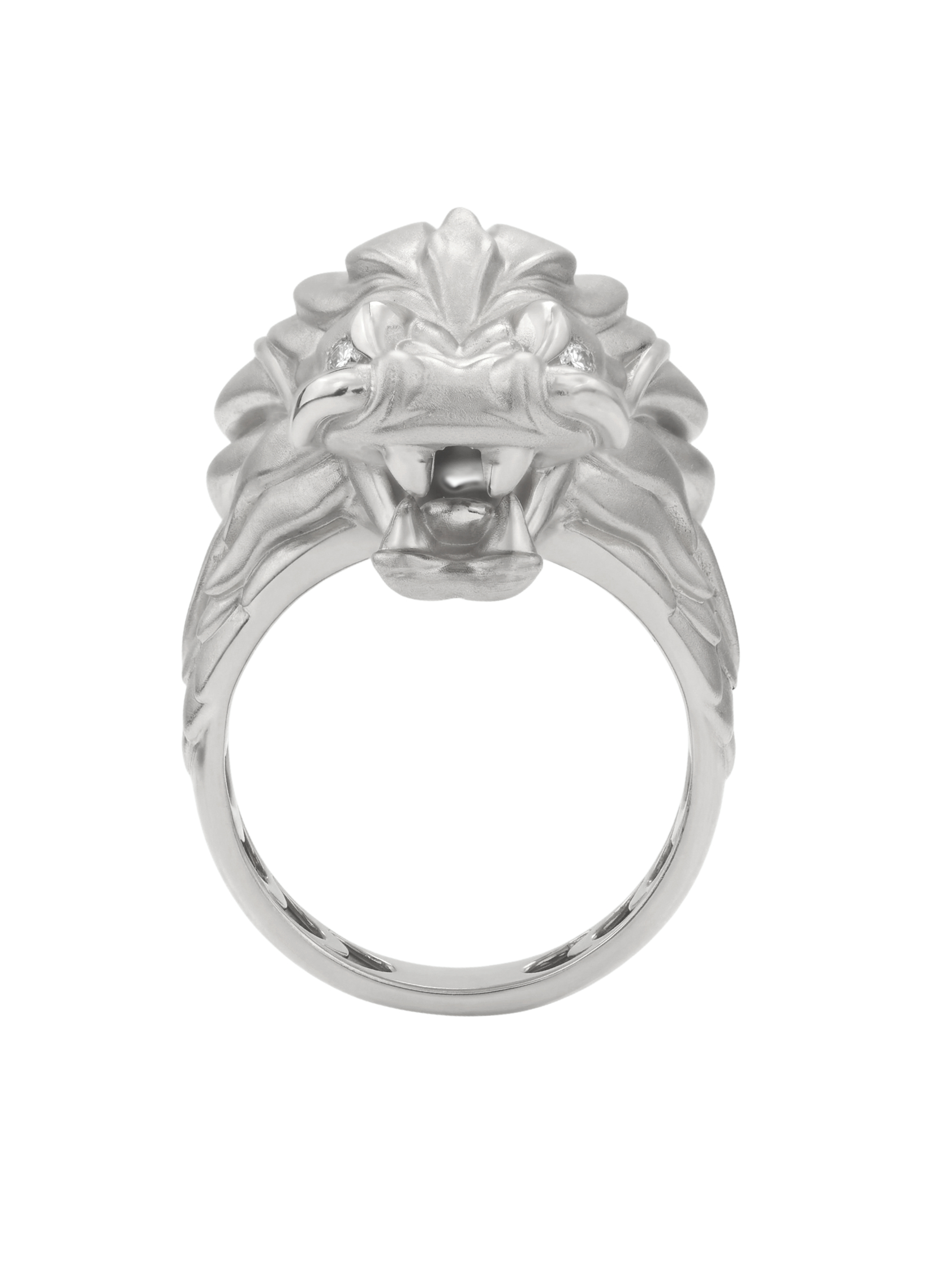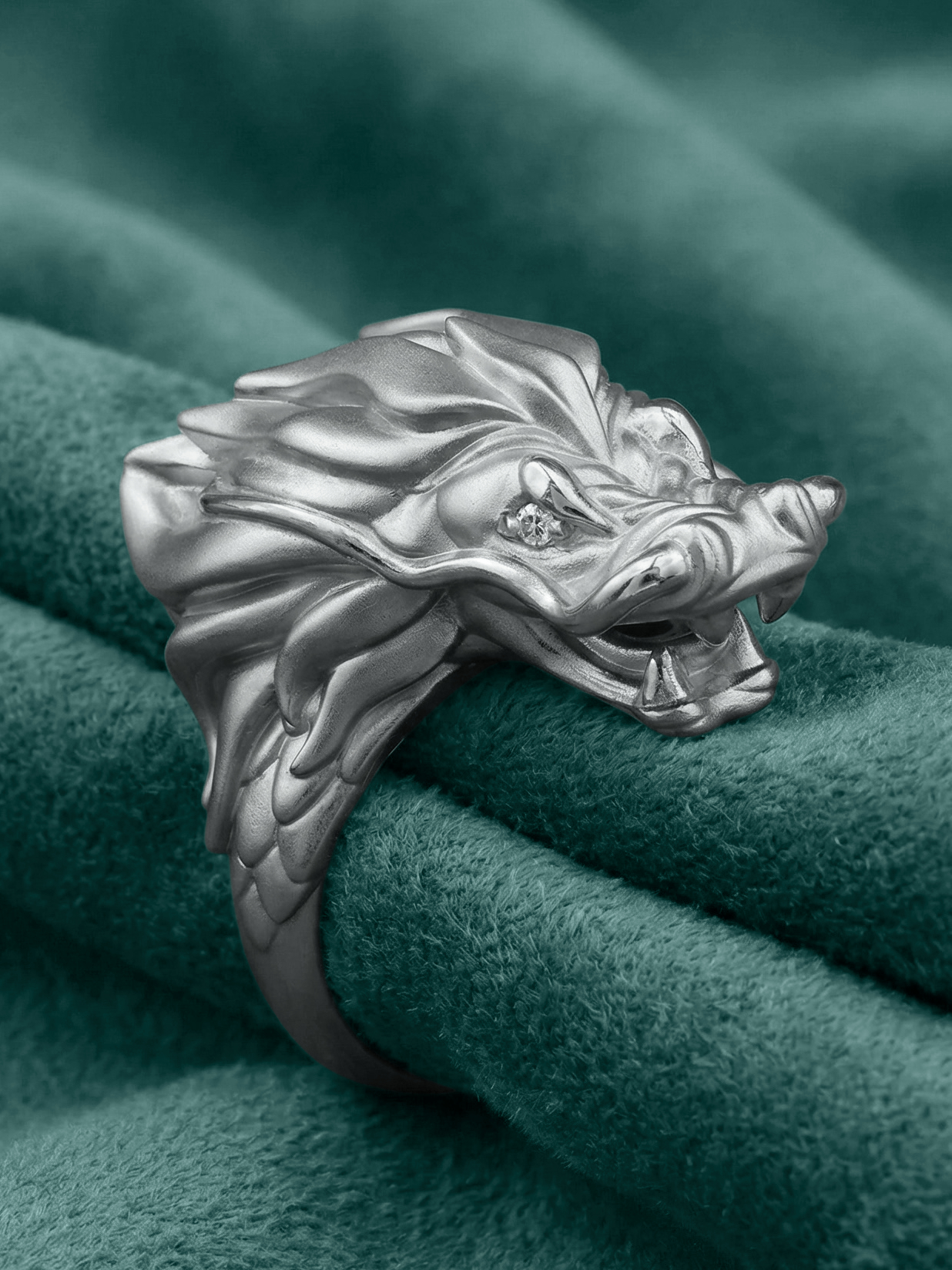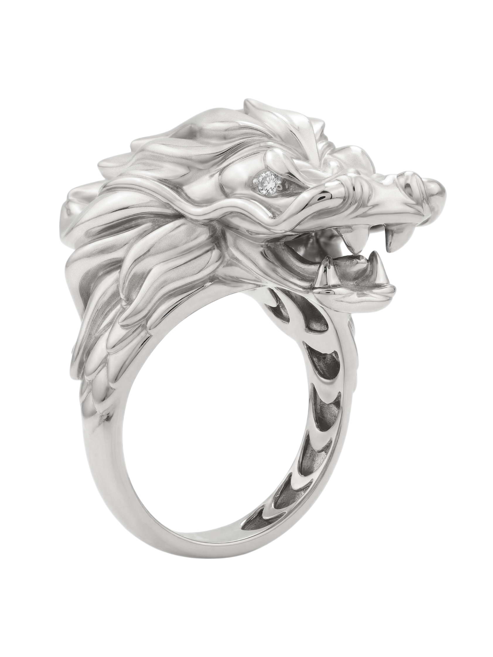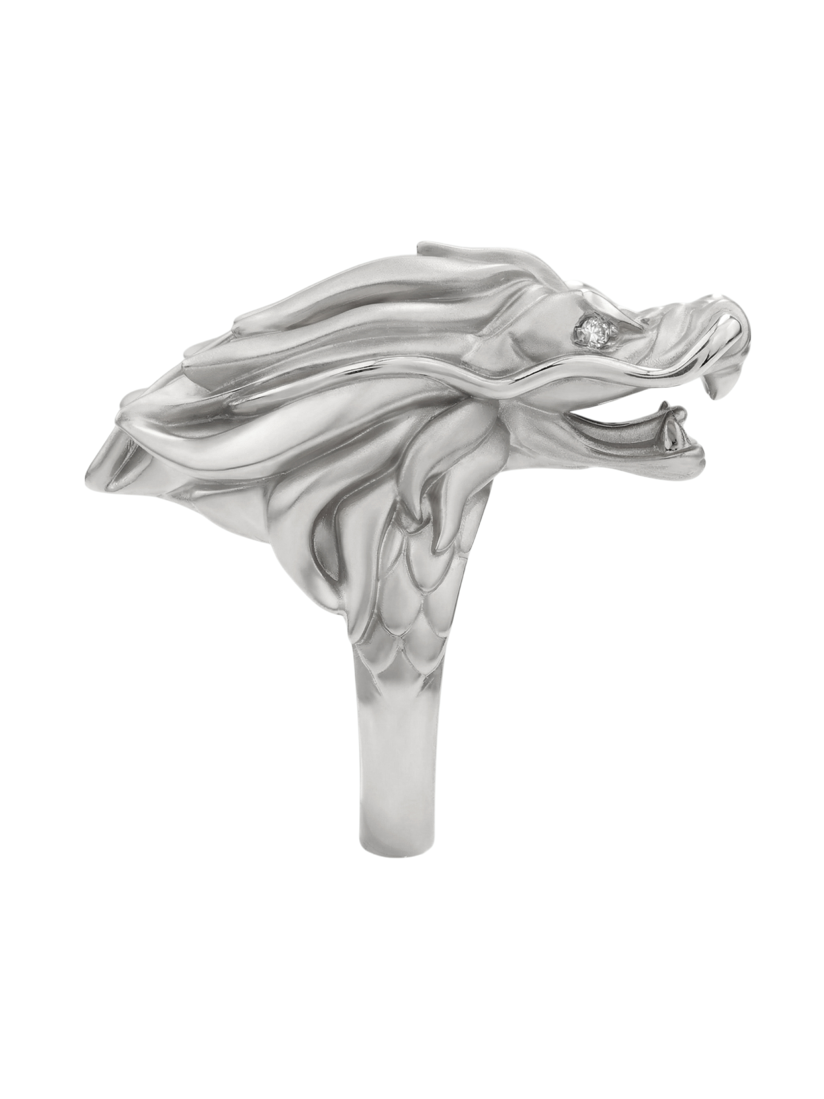 В центре композиции — благородное белое золото, чей холодный блеск подчеркивает агрессивную и одновременно изящную эстетику дракона. Глаза мифического существа инкрустированы двумя бриллиантами круглой формы белого цвета, которые добавляют изделию живой блеск и выразительность. Сочетание драгоценного металла и сверкающих камней превращает кольцо в настоящий артефакт, подчеркивающий статус своего обладателя.