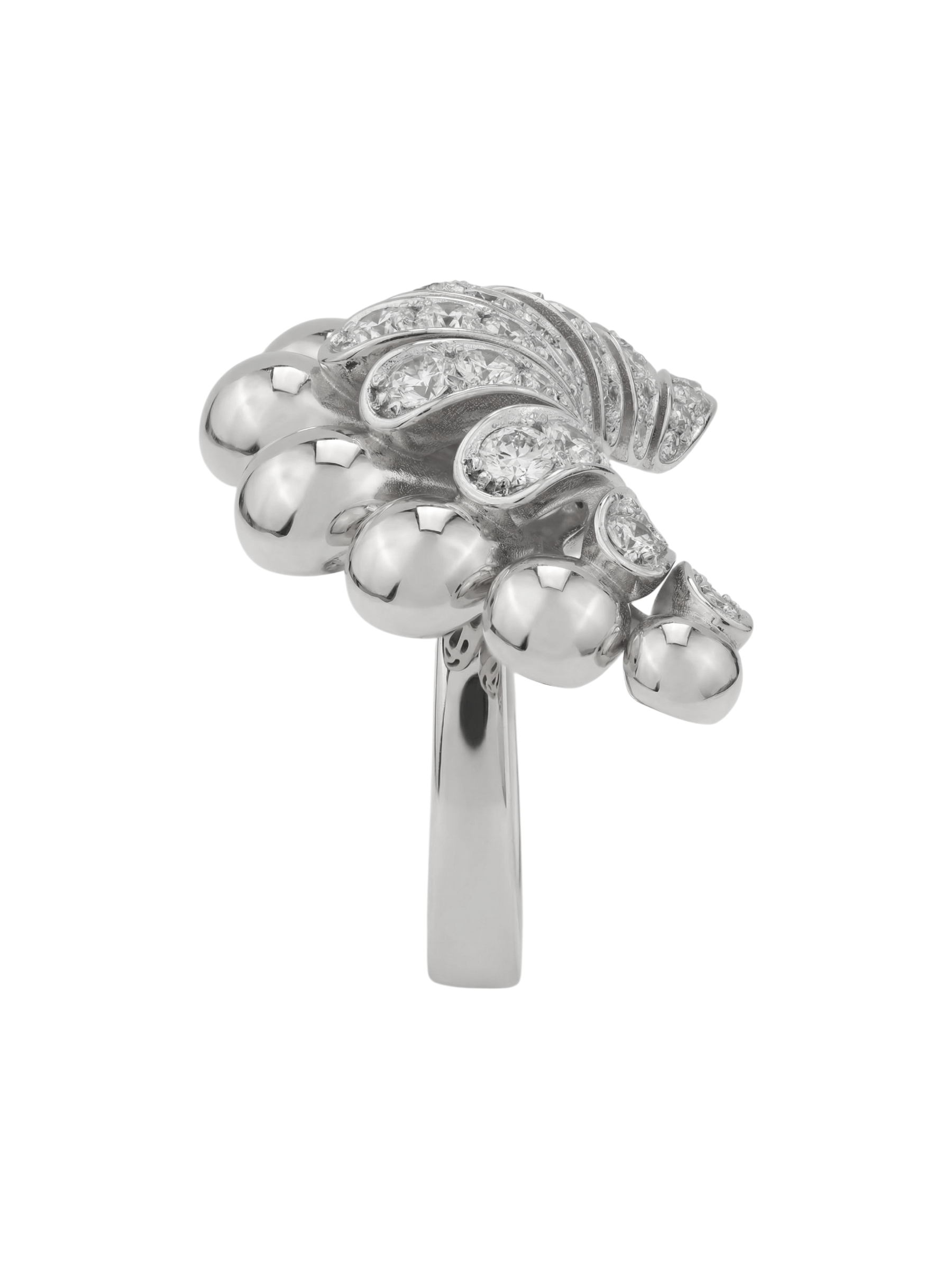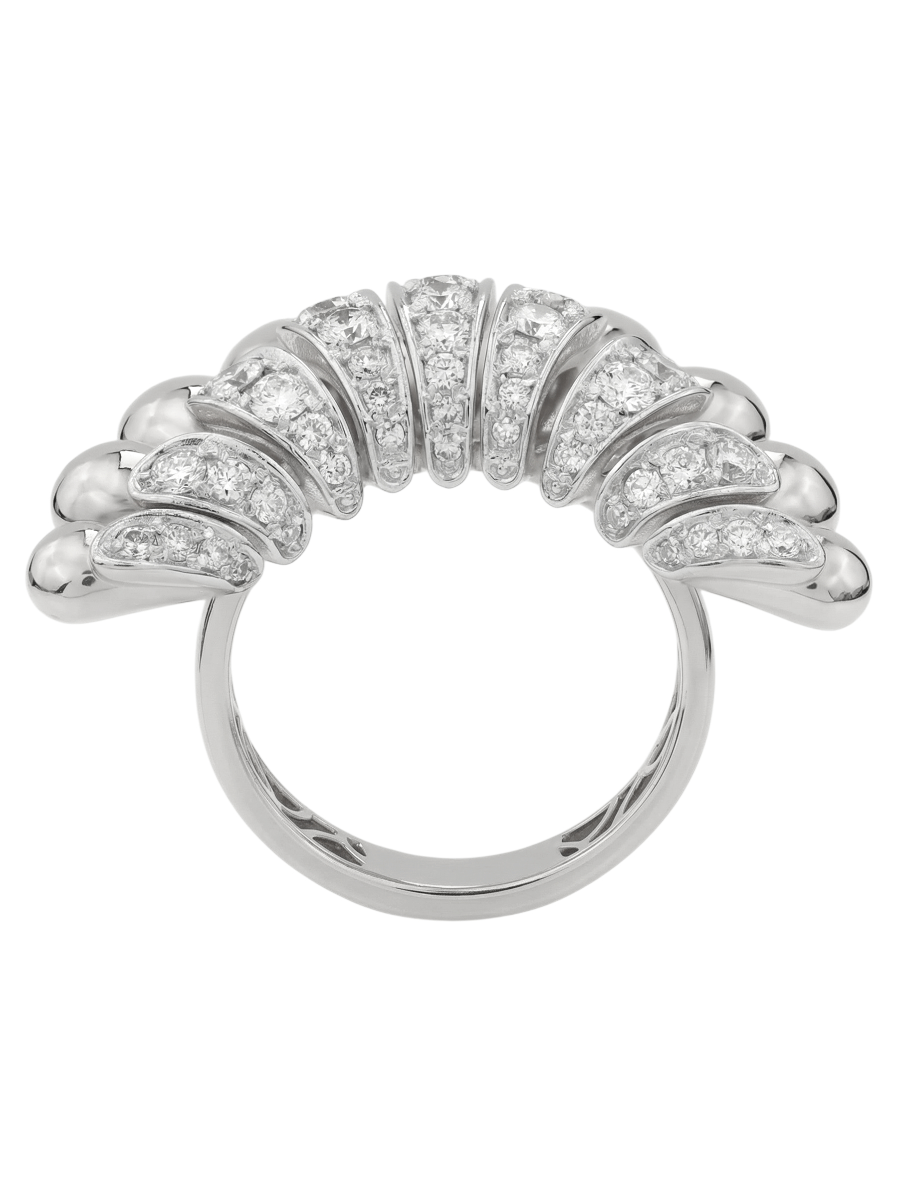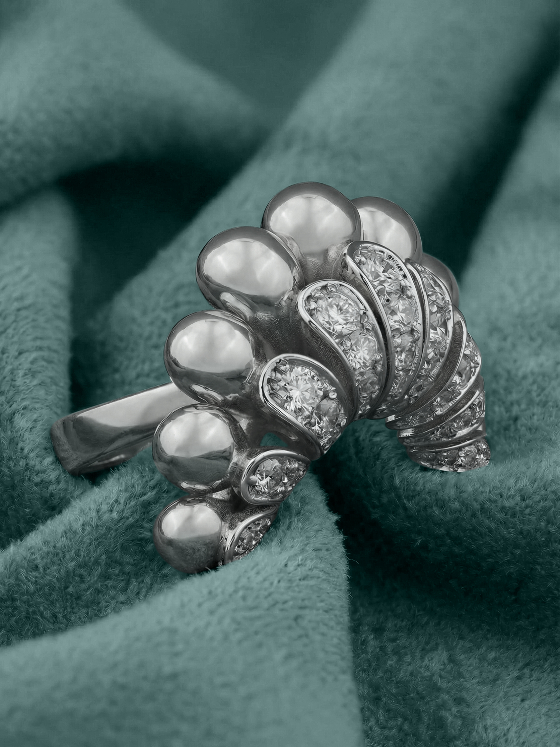 Декоративная часть изделия инкрустирована 40 бриллиантами, имеющими классическую форму огранки круг. Белый цвет вставок великолепно дополняет белое золото, обеспечивая эффектное светопреломление и завораживающую игру света при каждом движении. Тщательно проработанные детали делают это кольцо великолепным выбором как для женщин, так и для мужчин, предпочитающих премиальные ювелирные изделия.