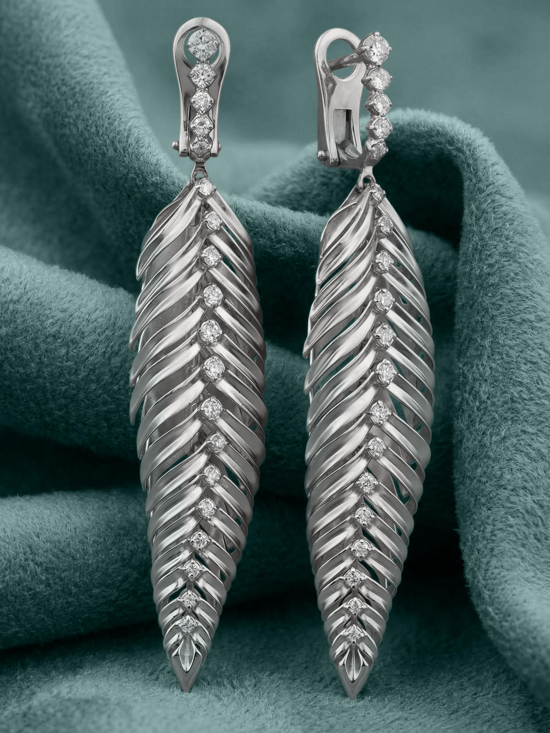 Серьги инкрустированы 38 бриллиантами круглой огранки. Камни белого цвета расположены по линии основы, создавая эффект мерцающей росы на поверхности ювелирного листа. Тщательная проработка деталей делает это изделие воплощением мастерства и стиля. Ювелирное украшение подойдет как женщинам, так и мужчинам, предпочитающим акцентные аксессуары с глубоким смыслом и природными мотивами.