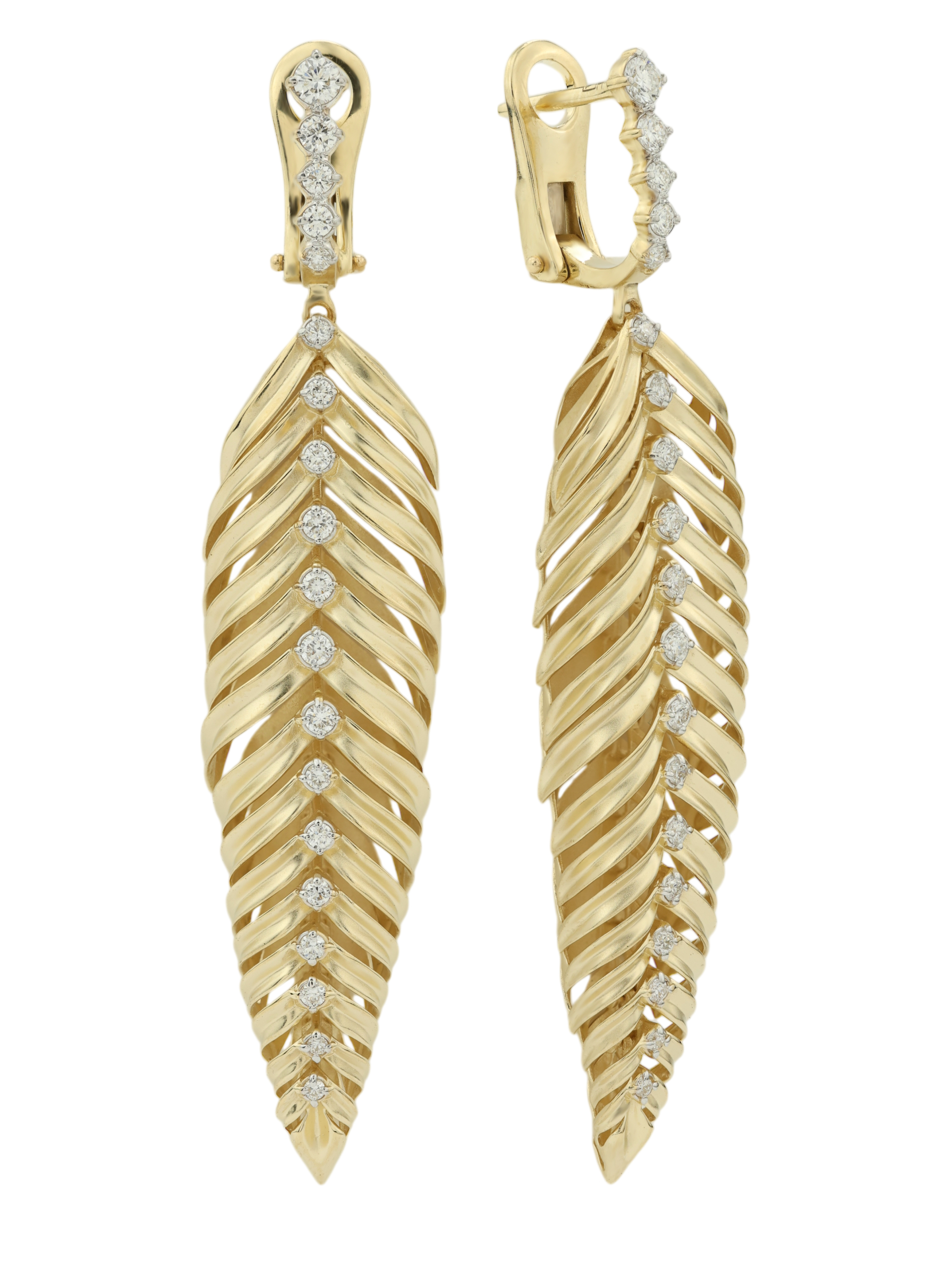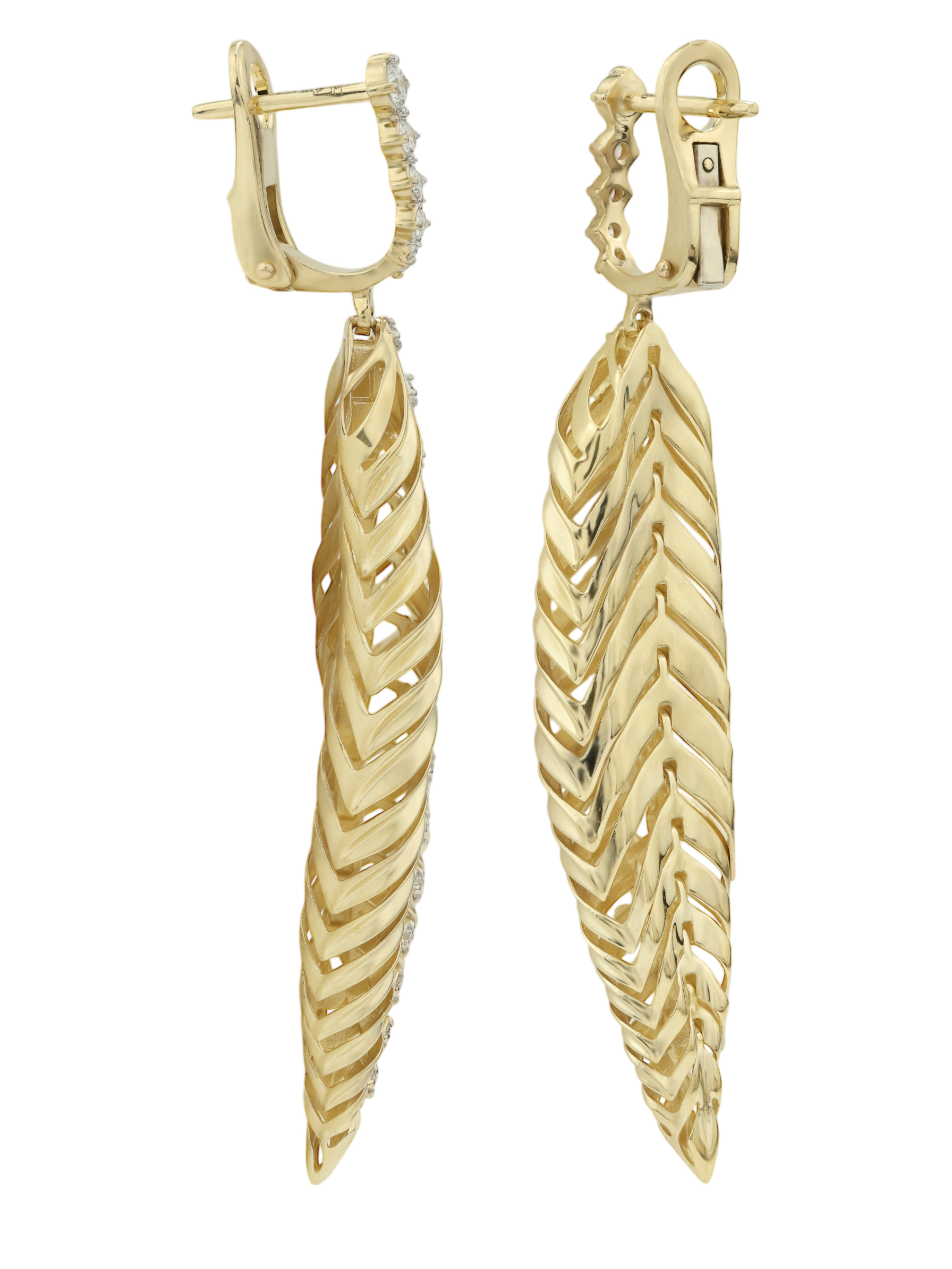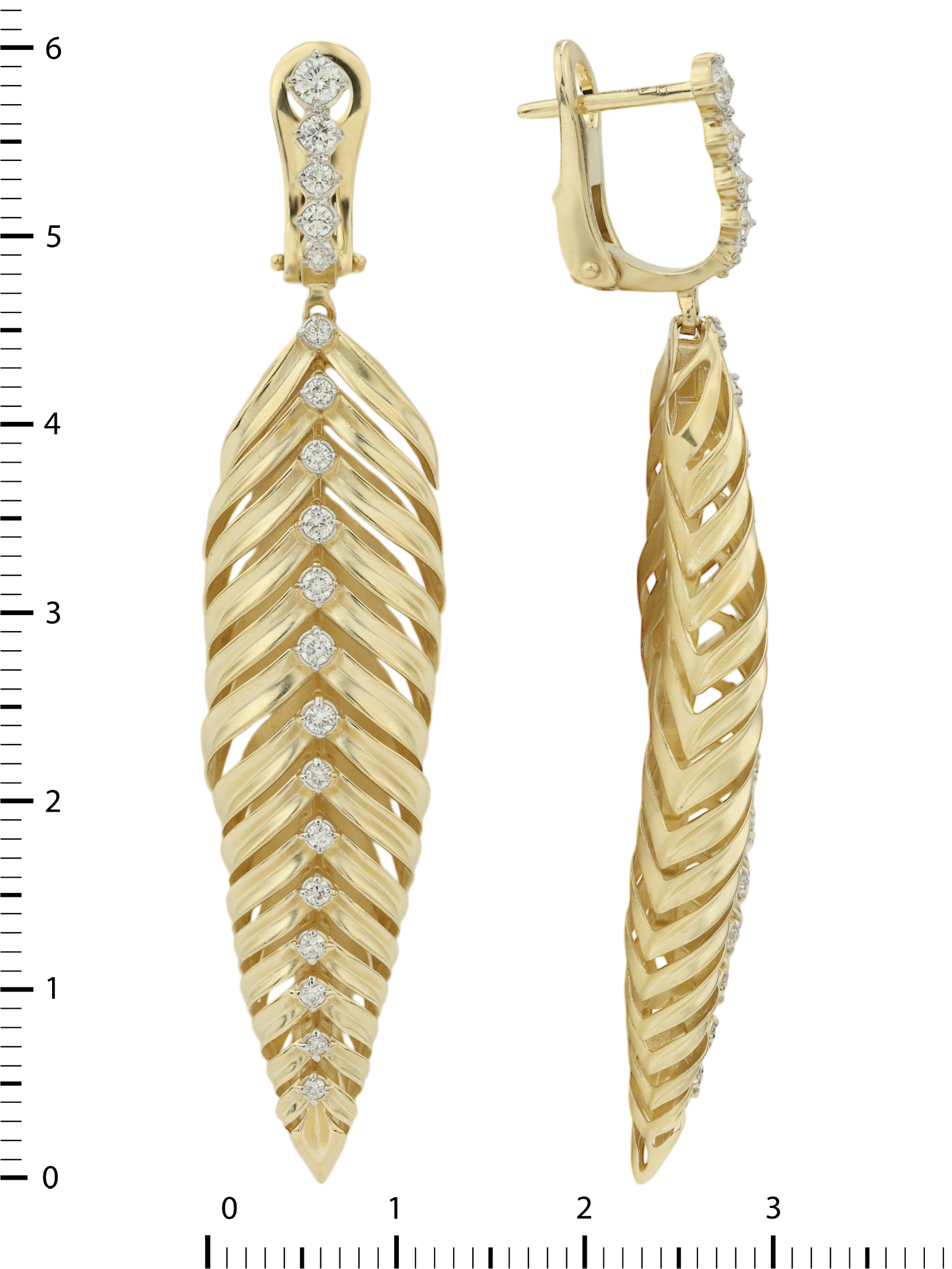 Эти серьги входят в состав коллекции Vioretty — Palm Branch и отличаются продуманной детализацией. Благодаря своей универсальной стилистике, аксессуар подойдет как для женщин, так и для мужчин, предпочитающих подчеркнуть индивидуальность утонченными деталями. Конструкция изделия позволяет создавать выразительные комплекты, становясь акцентом любого образа. Благородный оттенок лимонного золота в сочетании с белыми бриллиантами делает данную модель выразительным украшением для особых случаев и вечерних выходов. Утонченная геометрия листьев, реализованная в металле, подчеркивает высокий статус и безупречный вкус владельца.