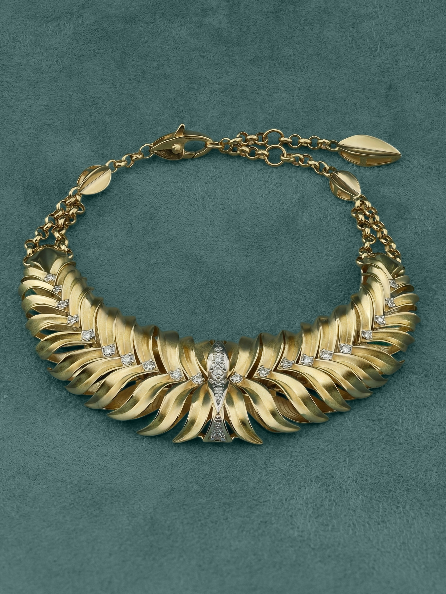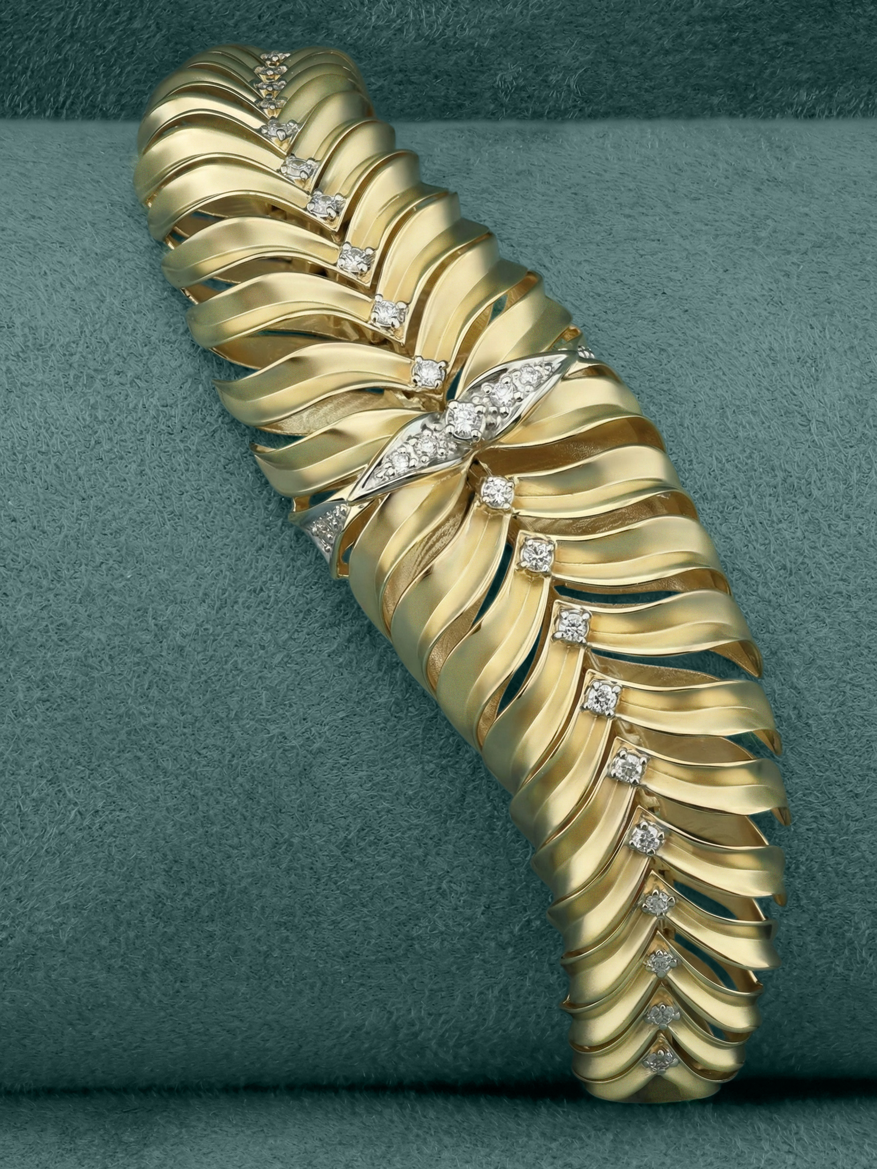 Роскошный браслет из лимонного золота 585 пробы станет центральным акцентом вашего образа, подчеркивая утонченный вкус и статус. Это украшение из коллекции Vioretty — Palm Branch выполнено в выразительном дизайне в виде листьев — его природные, плавные изгибы создают эффект движения и легкости, который приковывает взгляды. Особую глубину композиции придает благородный лимонный оттенок металла, идеально сочетающийся с сиянием драгоценных вставок.