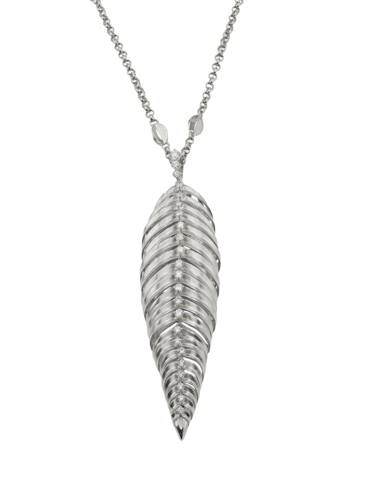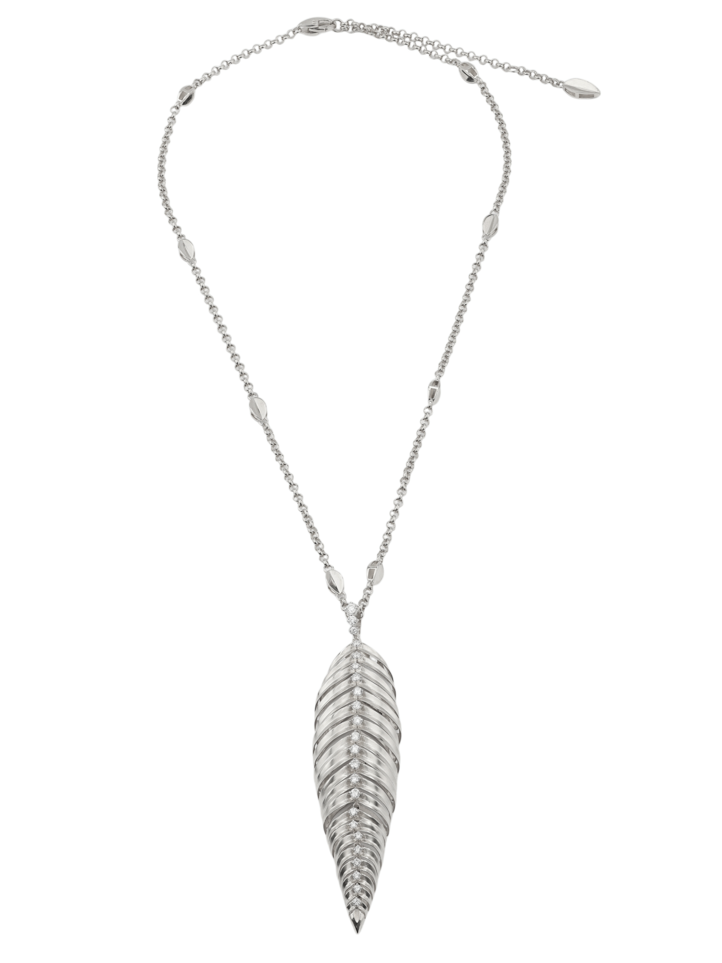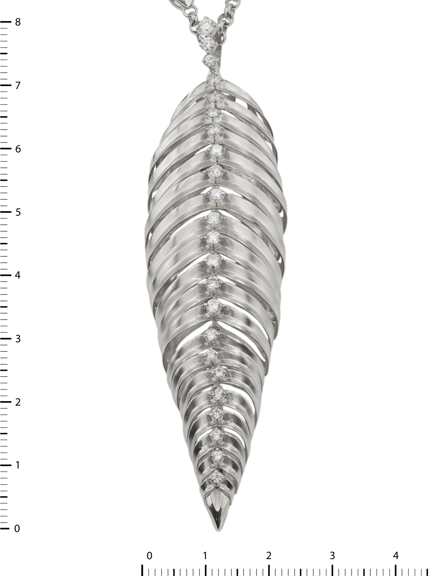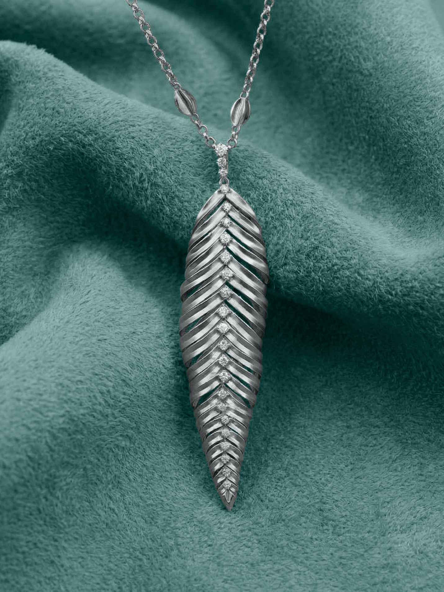 Изысканное колье из белого золота 585 пробы из коллекции Vioretty — Palm Branch станет воплощением утонченного вкуса и природной грации. Центральным элементом украшения выступает искусно выполненный подвес в дизайне «Листья», который привлекает внимание своей филигранной детализацией и ажурной формой. Вдоль центральной оси этого растительного мотива расположились 23 ослепительных бриллианта круглой огранки с чистым белым свечением, создавая эффект легкого инея на поверхности металла.