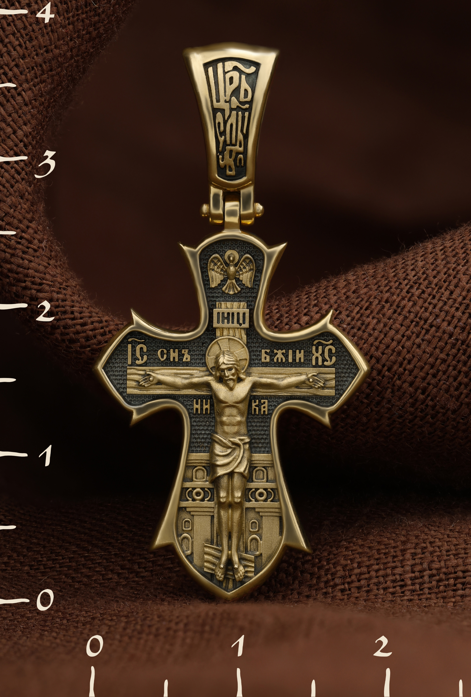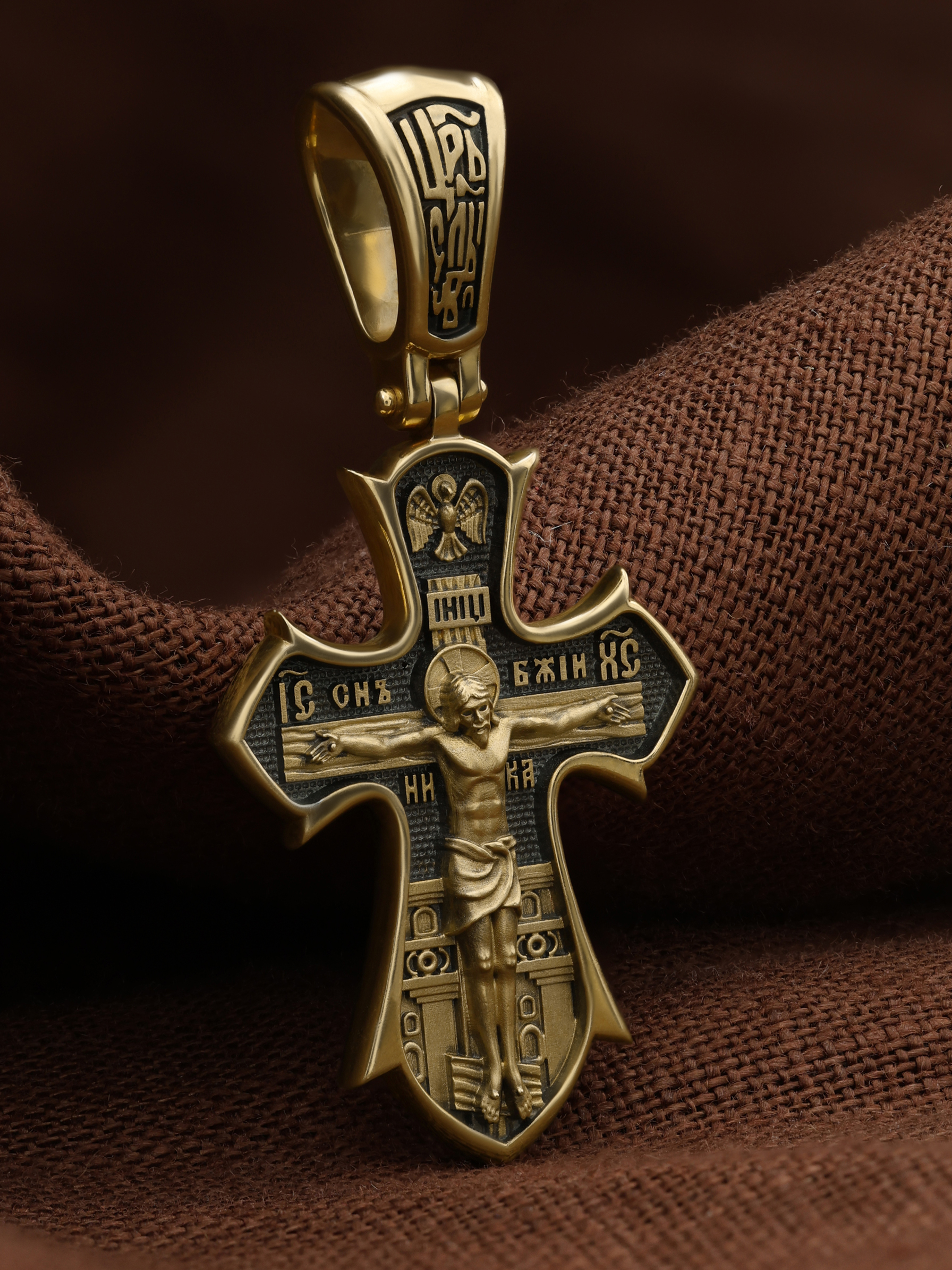 На лицевой стороне креста изображено распятие Господа нашего Иисуса Христа. Позади Распятия видна иерусалимская стена, знак того, что Господь был распят вне стен города. Но вместе с тем стена символизирует и Небесный Иерусалим, путь который открылся для человека через Голгофу. На кулоном кольце видим слова «ЦРЬ СЛВЫ» — Царь Славы. Верхняя перекладина символизирует собой табличку с надписью «IHЦI» — Иисус Назарянин Царь Иудейский. Над перекладиной пишется сокращенно имя Спасителя «IC XC» — Иисус Христос и словосочетание «СНЪ БЖIЙ» — «СЫН БОЖИЙ». Рядом с образом Христа помещены слова — «НИКА» (греч. — Победитель). Возвышение, на котором стоит Крест, символизирует гору Голгофу, на которой произошло Распятие. У подножия Креста изображают прах Адама, обозначенный черепом.