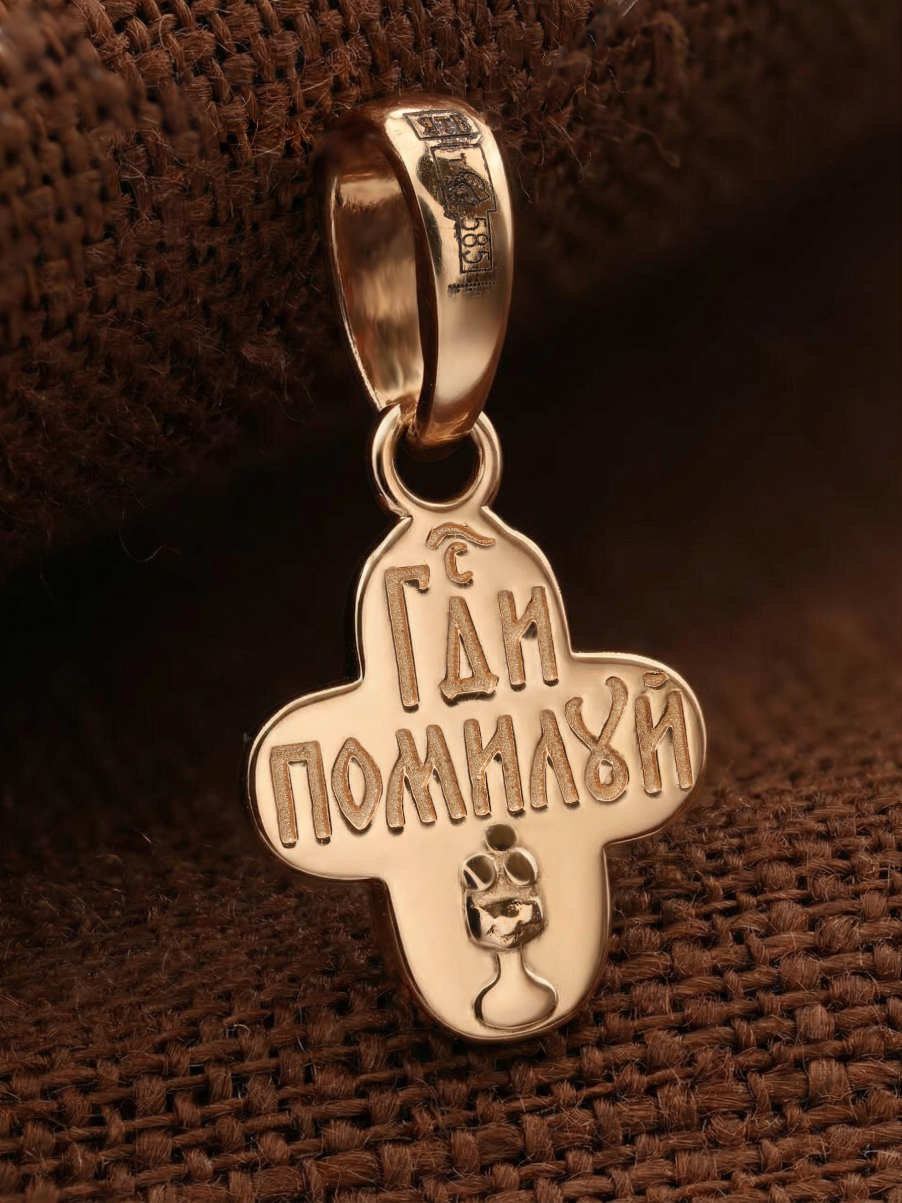 На оборотной стороне креста размещены слова молитвы: «Господи помилуй» и изображен Потир со Святыми Дарами. Таинство Евхаристии или Причащения — это центральное Таинство Церкви. Оно является способом соединения нашей души и тела с Богом. Его установил Господь Иисус Христос на Тайной Вечери. Он сказал: «Я хлеб живый, сшедший с небес; ядущий хлеб сей будет жить вовек; хлеб же, который Я дам, есть Плоть Моя, которую Я отдам за жизнь мира… истинно, истинно говорю вам: если не будете есть Плоти Сына Человеческого и пить Крови Его, то не будете иметь в себе жизни. Ядущий Мою Плоть и пиющий Мою Кровь имеет жизнь вечную, и Я воскрешу его в последний день. Ибо Плоть Моя истинно есть пища, и Кровь Моя истинно есть питие. Ядущий Мою Плоть и пиющий Мою Кровь пребывает во Мне, и Я в нем. Как послал Меня живый Отец, и Я живу Отцем, так и ядущий Меня жить будет Мною. Сей-то есть хлеб, сшедший с небес» (Евангелие от Иоанна 6:51−57).