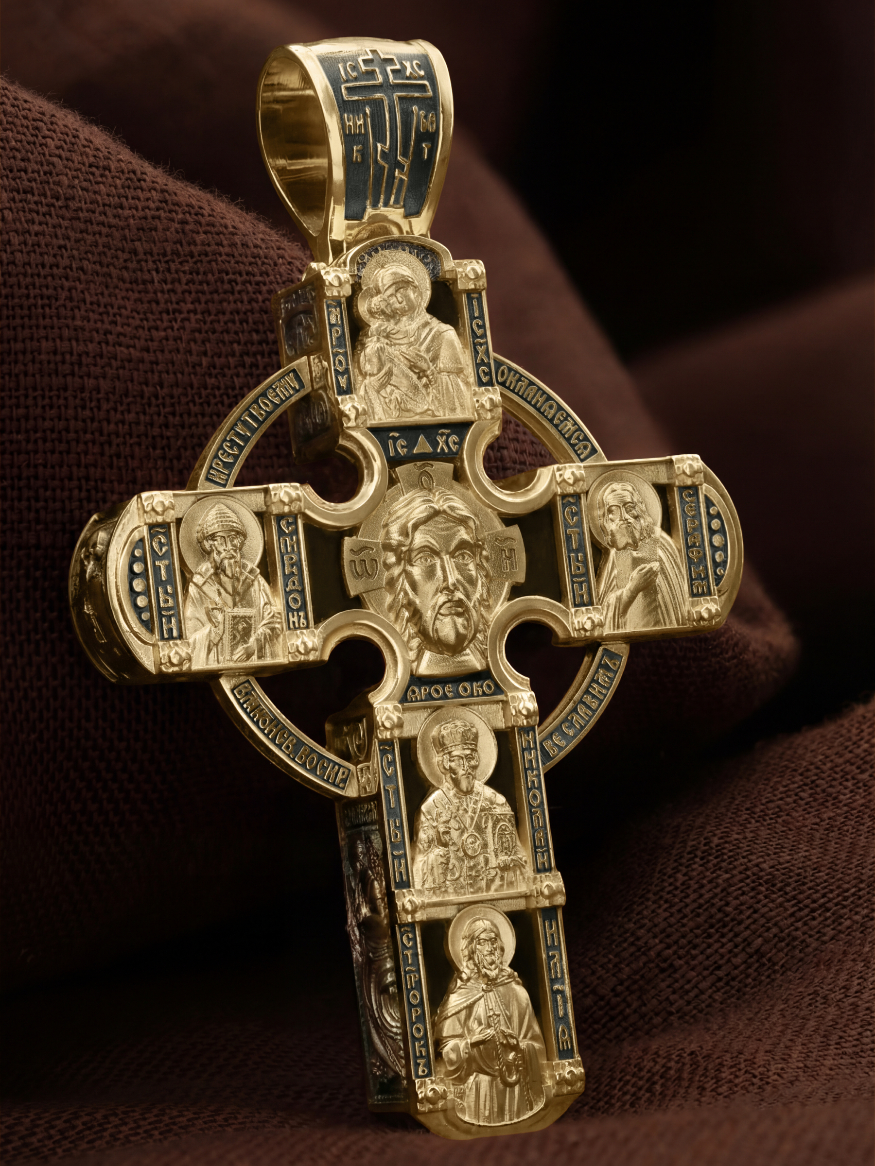 Крест объединяет в одной фигуре два христианских символа — круг-нимб и крест. На лицевой стороне креста изображено Распятие Господа и Спасителя нашего Иисуса Христа. Крест — символ спасения и искупления рода человеческого, знамение победы над смертью и адом. Распятие сопровождается каноническими надписями. На верхней табличке, выше головы Иисуса, расположена надпись, составленная Понтием Пилатом — «IНЦI». Она означает «Иисус Назорей, Царь Иудейский». Надписи «IC» «ХC», что означает Иисус Христос и «Сын Божий» размещается на разных сторонах поперечной перекладины креста. Вдоль Распятия размещены надписи «Царь Славы», «НИКА» (греч. — Победитель) и «МЛРБ» — «место лобное рай бысть» означает место лобное стало раем». Крест стоит на горе камней, символизирующих Голгофу. В ее основании различается череп — это голова Адама. Вдоль креста изображены орудия Страстей Христовых: копие сотника Лонгина, которым пронзили подреберье мёртвого Иисуса, чтобы убедиться в Его смерти, и трость с губкой, с которой Иисуса напоили уксусом. Они обозначены буквами «К» и «Т». Слева от Распятия помещены лики Пречистой Богородицы и Апостола Петра, справа изображены Апостол и евангелист Иоанн Богослов и Апостол Павел. Над Распятием изображен Святой Ангел-Хранитель, ниже — икона Божией Матери «Семистрельная». По кругу размещена молитва: «Кресту Твоему поклоняемся, Владыко, и Святое Воскресение Твое славим». На кулонном кольце помещено изображение Креста «Голгофа», на котором был распят Господь и Спаситель наш Иисус Христос.