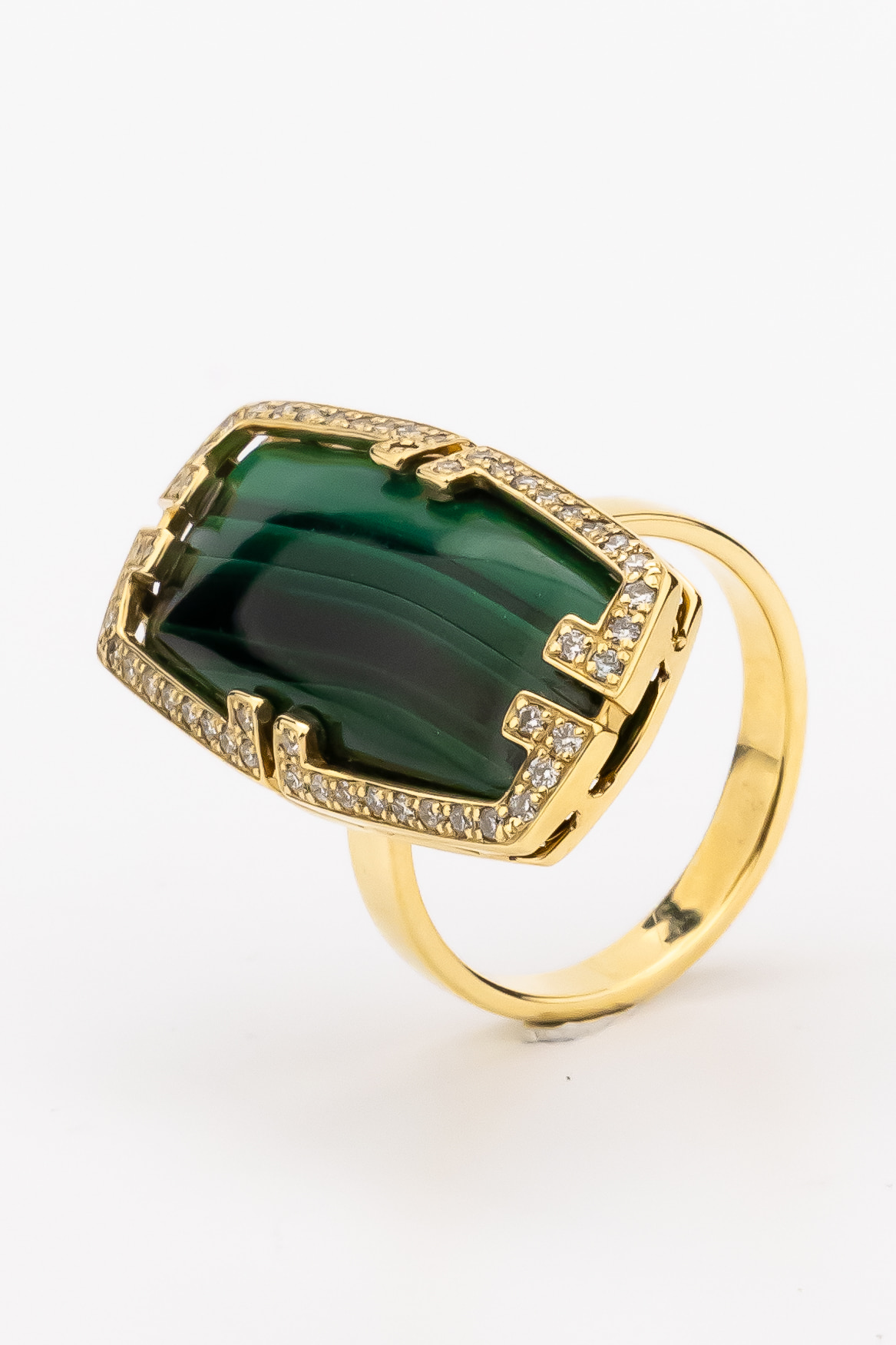 Кольцо из лимонного золота c бриллиантами, рубином и малахитом