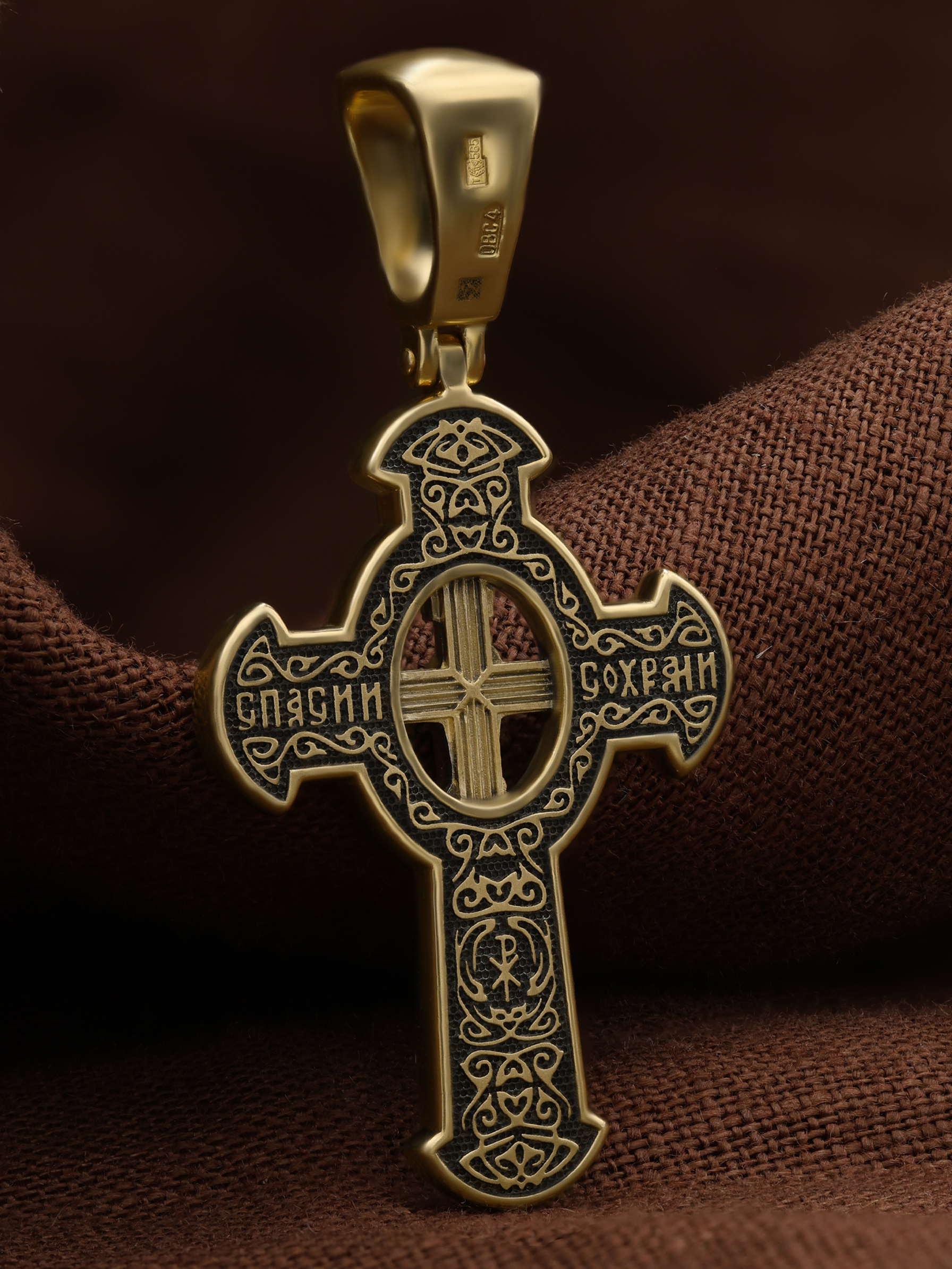 Оборотная сторона креста украшена растительным орнаментом. Помещенный на крест орнамент символизирует жизнедательную силу, животворное тепло креста. В растительный узор, на горизонтальной перекладине, вписано молитвенное славословие: «Спаси и сохрани». Эта надпись означает непрерывную молитву, совершаемую носителем данного креста.