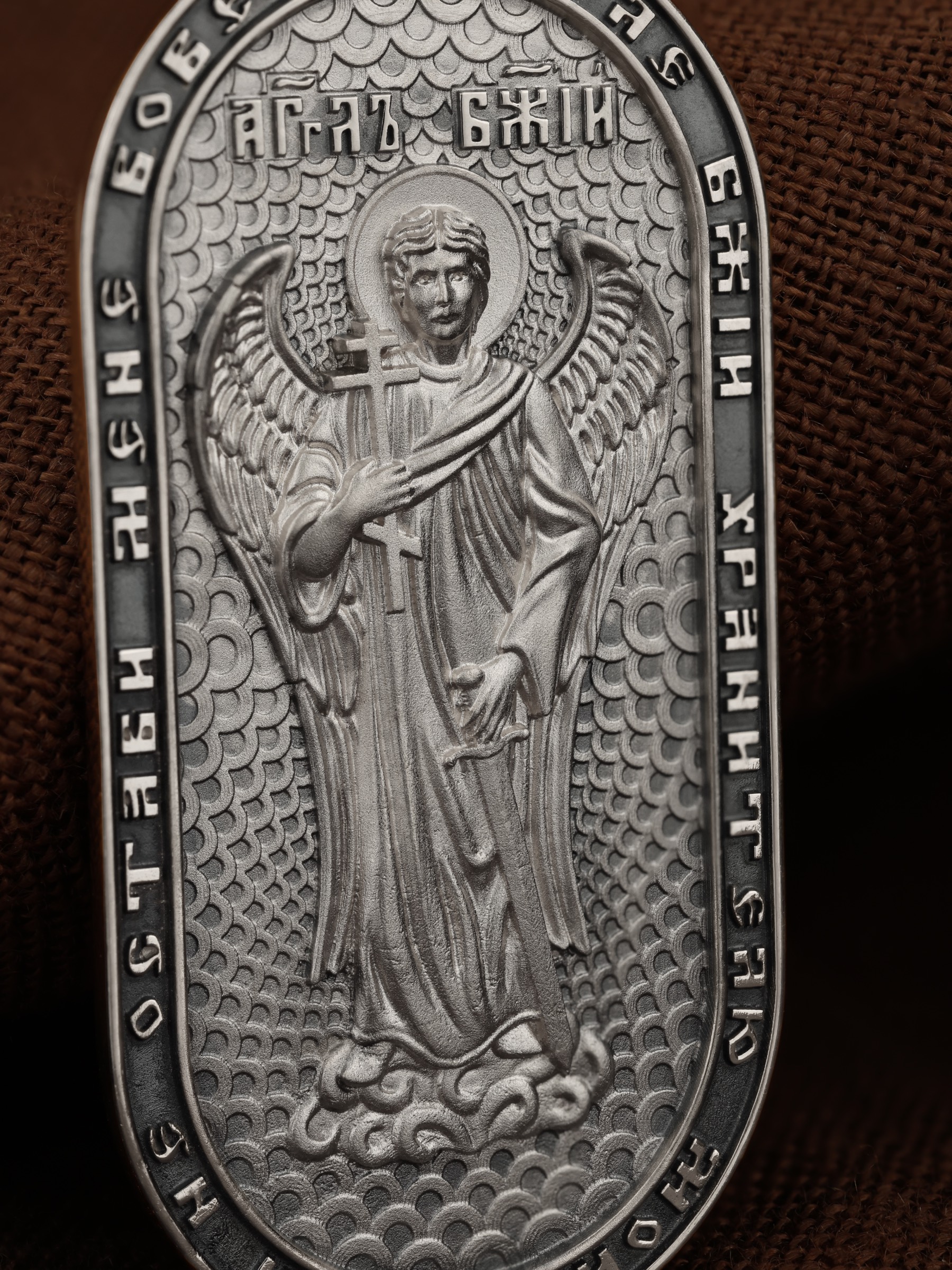 Основой композиции оборотной стороны является изображение Ангела Хранителя, который неотступно находится рядом с человеком, помогая, оберегая и наставляя его, а после смерти сопровождает его душу через мытарства. По контуру написана молитва: «Ангел Божий, хранителю мой святый, не остави мене вовеки». На кулонном кольце изображен Спас Нерукотворный — Символ вочеловечившегося Божества.
