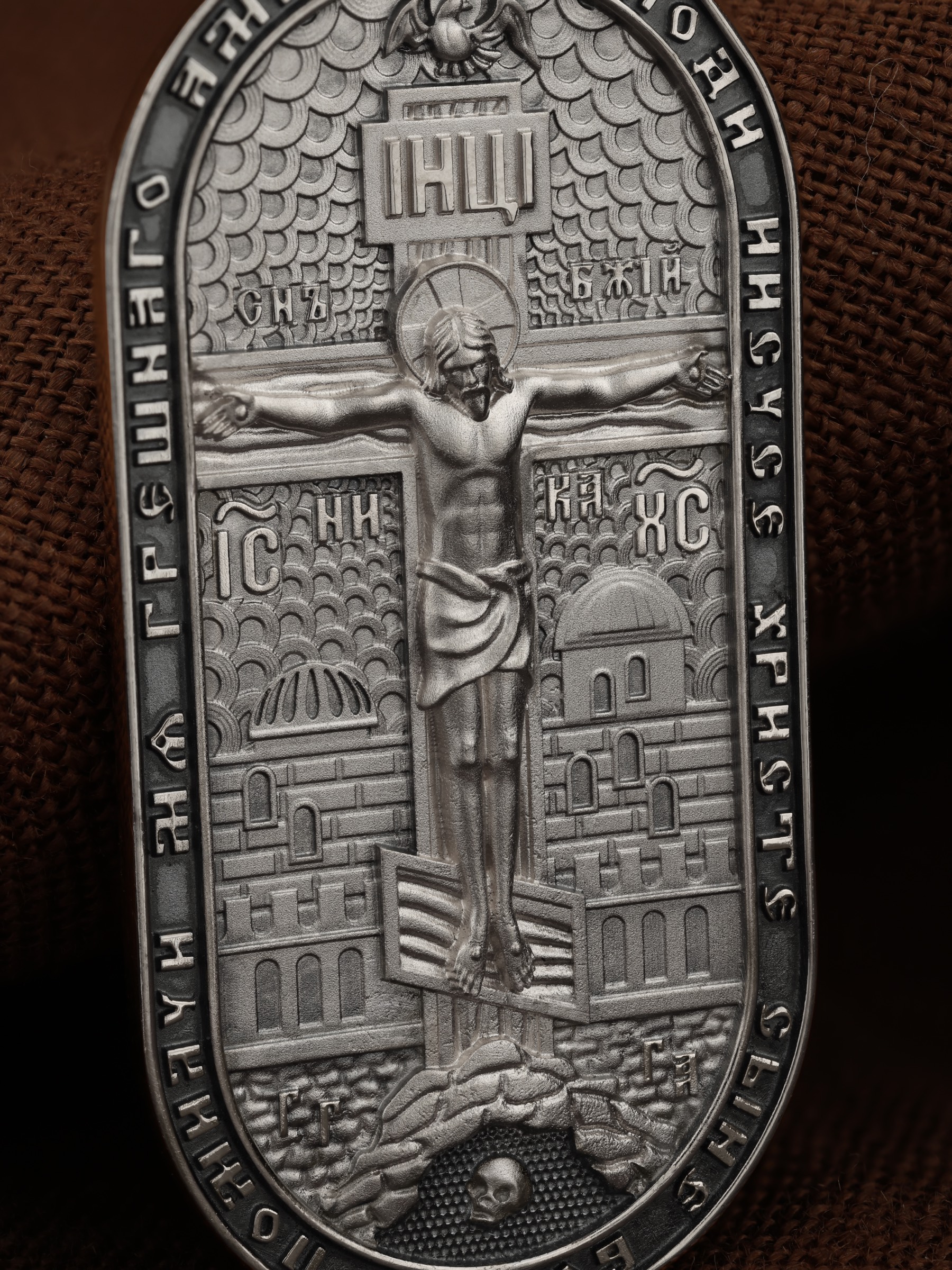 Центральную часть лицевой стороны занимает Распятие Христа — образ жертвы, принесенной Господом за грехи людей. Именно ко Христу, сошедшему на землю ради нашего спасения, возносятся все молитвы. Рядом с Его образом помещены слова — «НИКА» (греч. — Победитель) и «СЫН БОЖИЙ». Эти слова характеризуют Господа как Великого Архиерея, победителя смерти. Также Распятие сопровождается надписями, олицетворяющими Христа — это святое имя Христа «IC» (Иисус) «ХС» (Христос). Верхняя перекладина символизирует собой табличку с надписью «IHЦI» — Иисус Назарянин Царь Иудейский. Возвышение, на котором стоит Крест, символизирует гору Голгофу, на которой произошло Распятие. У подножия Креста изображают прах Адама, обозначенный черепом. На кулонном кольце изображен шестикрылый Серафим — самый приближенный к Господу Ангел. По контуру образка написана молитва: «Господи Иисусе Христе, Сыне Божий, помилуй мя грешного. Аминь»