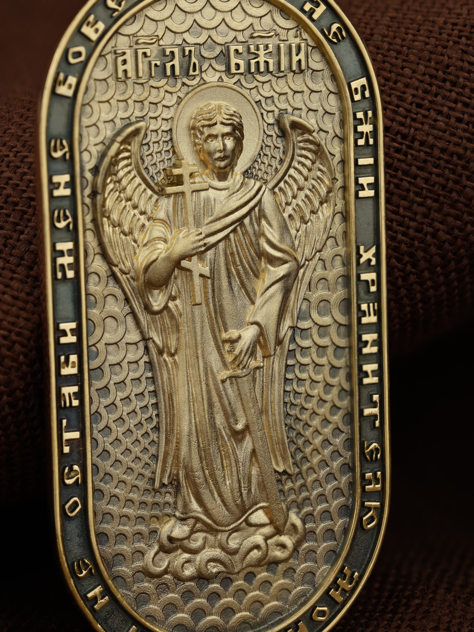 Основой композиции оборотной стороны является изображение Ангела Хранителя, который неотступно находится рядом с человеком, помогая, оберегая и наставляя его, а после смерти сопровождает его душу через мытарства. По контуру написана молитва: «Ангел Божий, хранителю мой святый, не остави мене вовеки». На кулонном кольце изображен Спас Нерукотворный — Символ вочеловечившегося Божества.