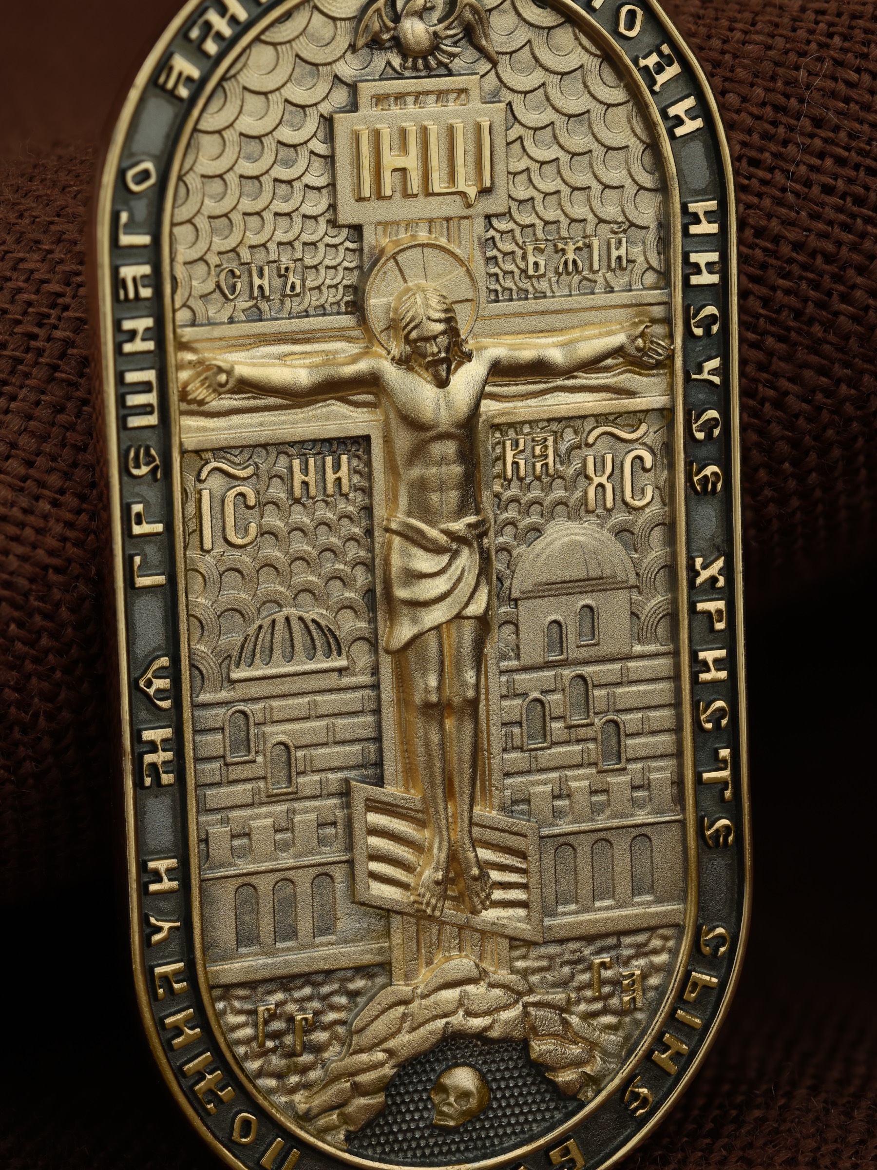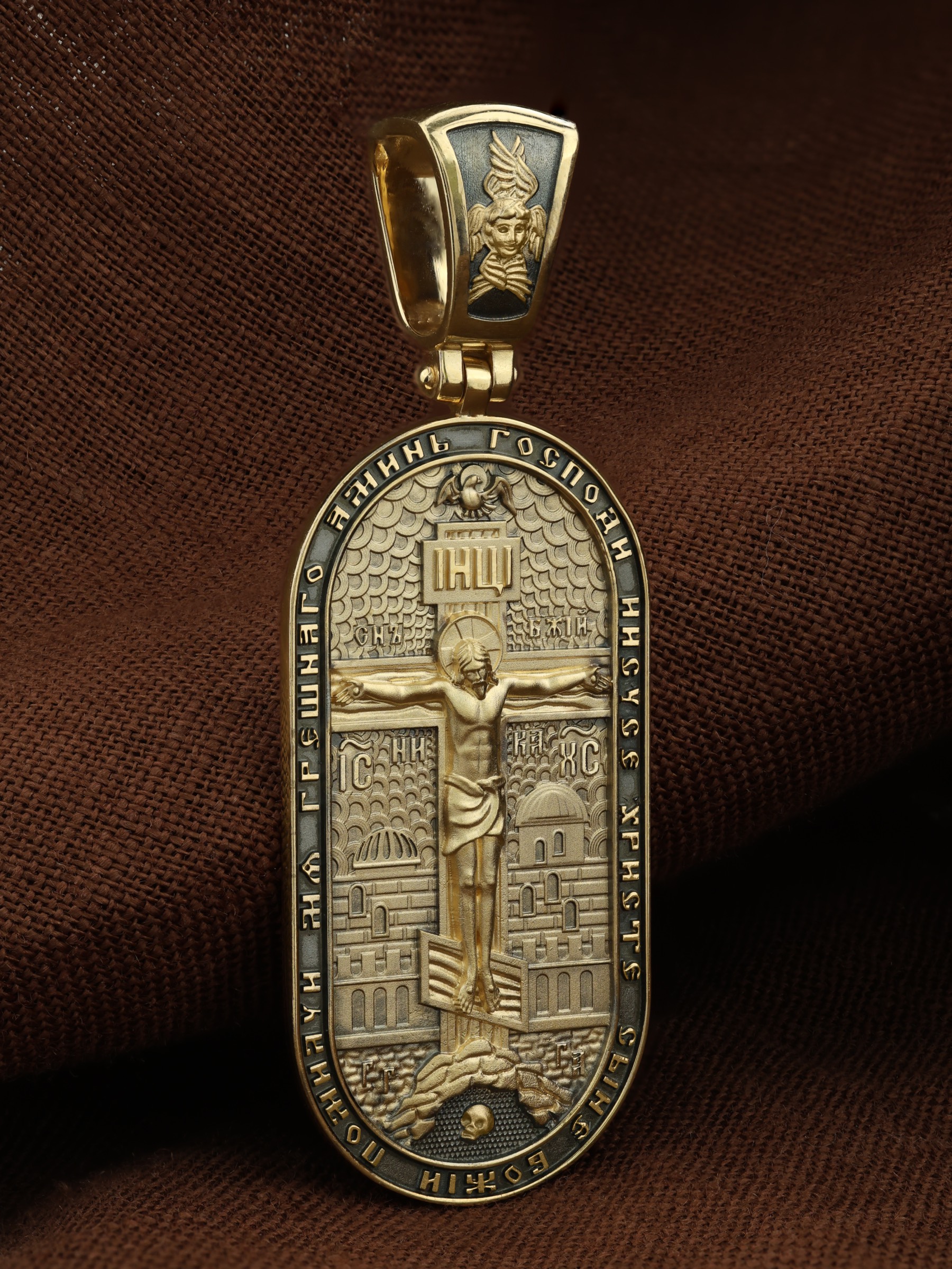 Центральную часть лицевой стороны занимает Распятие Христа — образ жертвы, принесенной Господом за грехи людей. Именно ко Христу, сошедшему на землю ради нашего спасения, возносятся все молитвы. Рядом с Его образом помещены слова — «НИКА» (греч. — Победитель) и «СЫН БОЖИЙ». Эти слова характеризуют Господа как Великого Архиерея, победителя смерти. Также Распятие сопровождается надписями, олицетворяющими Христа — это святое имя Христа «IC» (Иисус) «ХС» (Христос). Верхняя перекладина символизирует собой табличку с надписью «IHЦI» — Иисус Назарянин Царь Иудейский. Возвышение, на котором стоит Крест, символизирует гору Голгофу, на которой произошло Распятие. У подножия Креста изображают прах Адама, обозначенный черепом. На кулонном кольце изображен шестикрылый Серафим — самый приближенный к Господу Ангел. По контуру образка написана молитва: «Господи Иисусе Христе, Сыне Божий, помилуй мя грешного. Аминь»