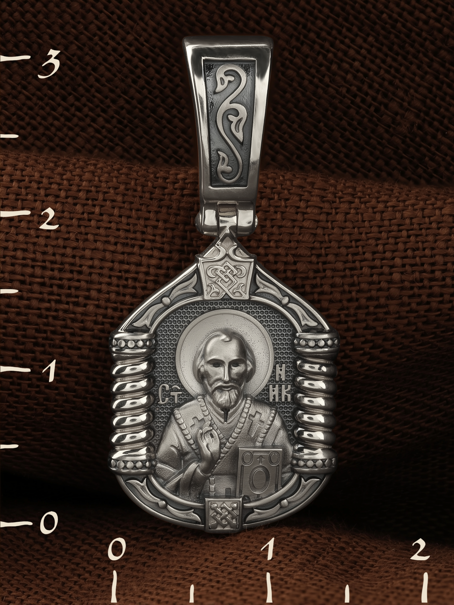 На лицевой стороне образка изображен Святитель Николай архиепископ Мир Ликийских, Чудотворец. Он является одним из самых почитаемых святых в православном мире. Святитель Николай родился во второй половине III века в Малой Азии в Ликийском городе Патары. С рождения Божий Угодник проявлял необыкновенные дарования. Сохранилось Предание, что во время крещения он, никем не поддерживаемый, простоял в купели три часа. Приняв сан священника, святитель Николай стал проводить еще более строгую подвижническую жизнь. Избранник Божий Николай стал вершиной всех добродетелей, поднятой до райской высоты. С кем из величайших праведников не сравнялся он образом духовной красоты, кому из них не последовал в своих деяниях и чудотворениях? Вся жизнь святого Николая — это служение Богу. Много великих и преславных чудес сотворил великий Святитель Николай Угодник. Он помогал сущим в бедах, укрощал штормы, спасал от потопления и выносил на сушу из глубины морской, освобождал из плена и приносил освобожденных домой, избавлял от уз и темницы, защищал от посечения мечом, освобождал от смерти и подавал многим различные исцеления, слепым прозрение, хромым хождение, глухим слух, немым дар слова.