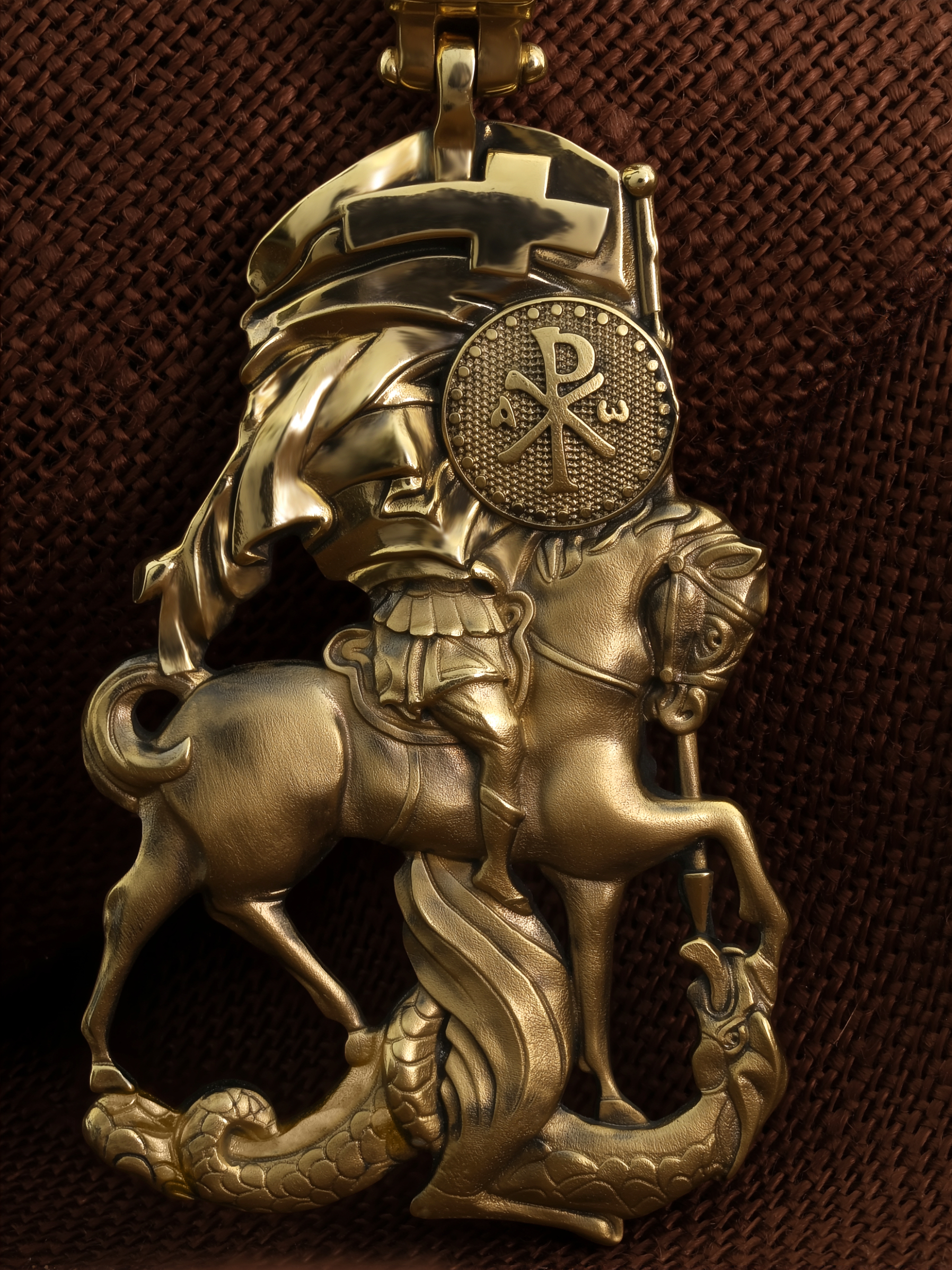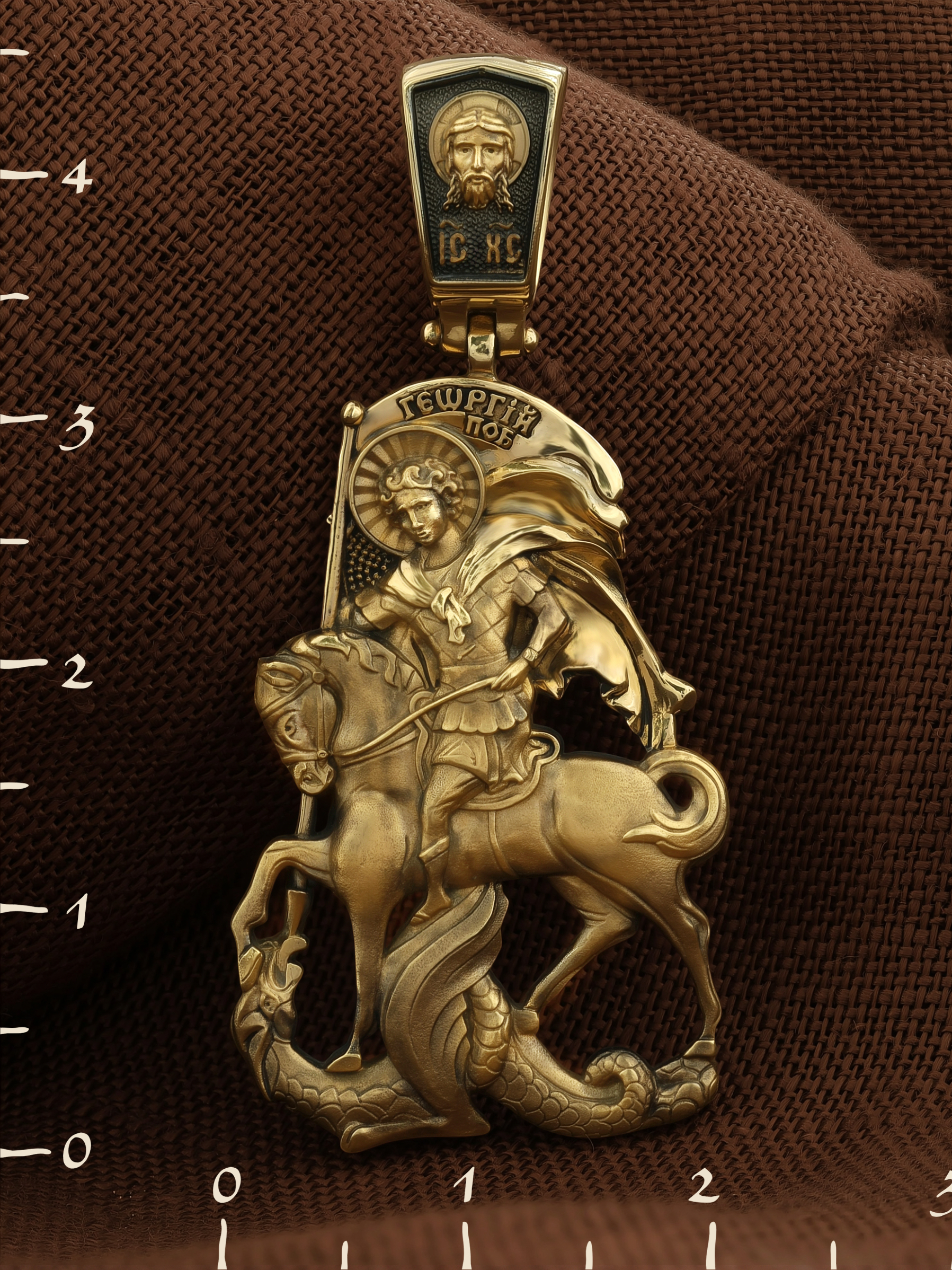 Основой композиции образка является изображение Святого Великомученика Георгия Победоносца — одного из самых почитаемых и удивительных святых. Георгий родился в Каппадокии (Малая Азия) в семье богатых и знатных горожан. Юношей поступил на службу к римскому императору Диоклетиану, за отличное знание военного дела и проявленную в боях и походах храбрость был приближен к императору и удостоен высокого воинского звания. Во время начавшихся гонений на христиан, перешел на сторону гонимых и, отвергнув человеческий страх, стал ярым проповедником учения Христа. Мучители подвергли опального воеводу жесточайшим восьмидневным пыткам и казнили его (обезглавили) в возрасте около тридцати лет в 303 году. На Руси он известен как Юрий или Егорий, заступник для верующих, чья жизнь имеет какое-либо отношение к военным делам, помощник в крестьянском труде. Образок сделан в виде воинского щита. На нем Георгий изображен как воитель, сидящий на вздыбленном коне и поражающий копьем огнедышащего змея. Справа над образом изображена благословляющая Божия десница. Змей символизирует собою сатанинские силы. Молитвами вознесенными к Всевышнему и своей непреклонной верой он смог одолеть чудовище. Святой убил змея, спас царскую дочь, принесенную в жертву, и жителей города, их души от влияния дьявола, породив в них надежду и веру в Господа, призывая людей принять христианскую веру. На оборотной стороне образка написана молитва: «Мучениче Георгие, моли Бога о мне».