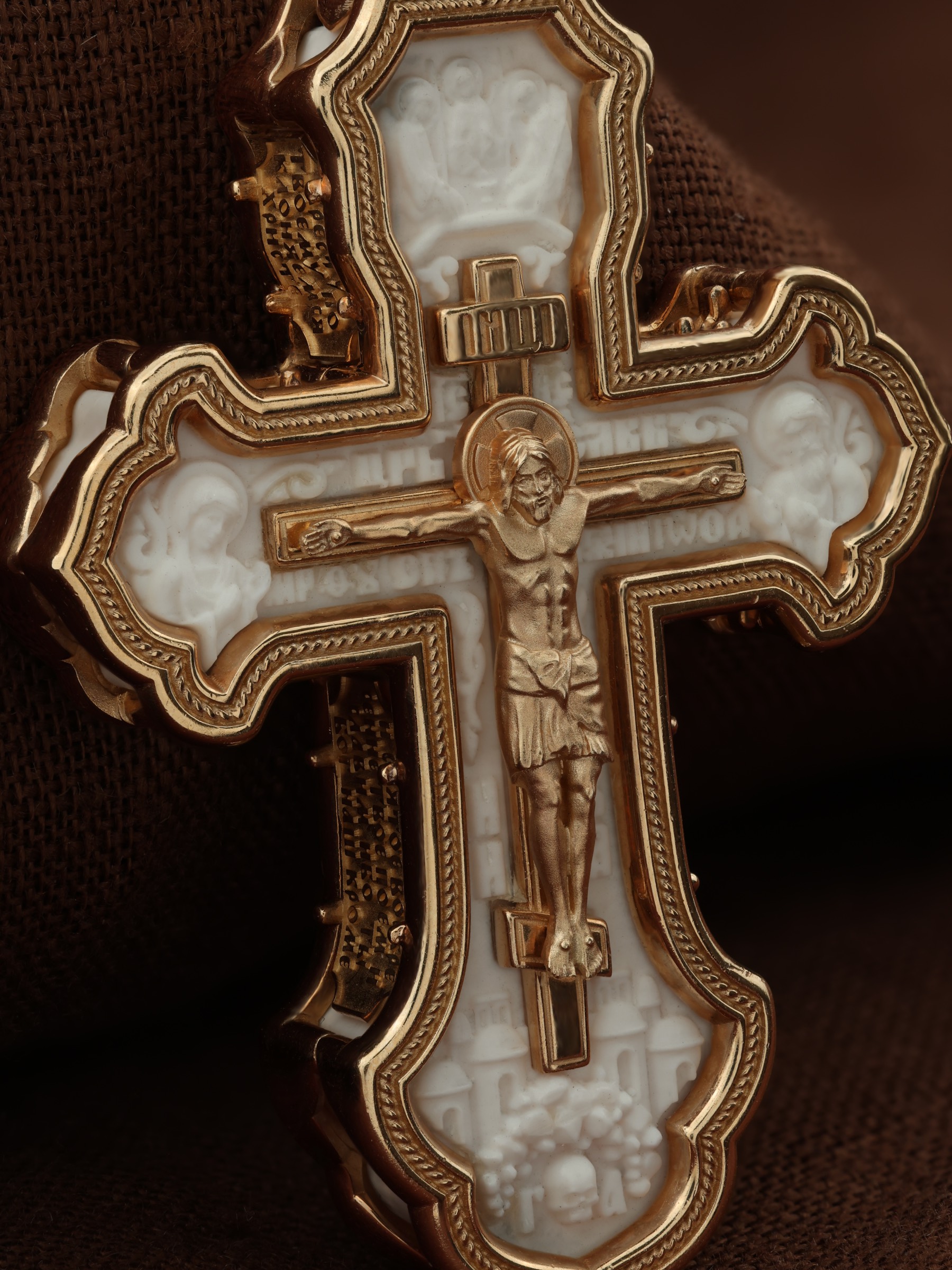 На лицевой стороне креста изображено Распятие Господа и Спасителя нашего Иисуса Христа, отдавшего Себя на смерть, чтобы другие могли жить — жить вечной жизнью, жить с Богом. Через крестную жертву Бог раскрывает нам Свою безмерную любовь и призывает к ответной любви. Своею кровью Господь освятил крест и сделал его проводником Своей благодати, источником освящения верующих. На верхней табличке, выше головы Иисуса, расположена надпись, составленная Понтием Пилатом — «IНЦI». Она означает «Иисус Назорей, Царь Иудейский». Распятие сопровождается каноническими надписями. Надпись «IС» « ХС» означает Иисус Христос и помещается над Распятием. Надпись «Царь Славы» помещается на разных сторонах поперечной (большой) перекладины креста. Ниже расположены надпись «Сын Божий» и слово «НИКА», что означает «победитель». Слева от Распятия изображена Пресвятая Богородица, Справа изображен Пророк Предтеча и Креститель Господень Иоанн. За Распятием высится Иерусалимская стена, в знак того, что Господь был распят вне стен города. Возвышение, на котором стоит Крест, символизирует гору Голгофу, на которой произошло Распятие. Под подножием Креста изображена покоящаяся голова (череп) Адама и надпись «Г.А.». Над распятием помещено изображение иконы Святой Троицы в виде трех ангелов. На кулонном кольце изображен Нерукотворный образ Господа и Спасителя нашего Иисуса Христа, чудесно отпечатавшийся на плате, котором Христос вытер свой лик.