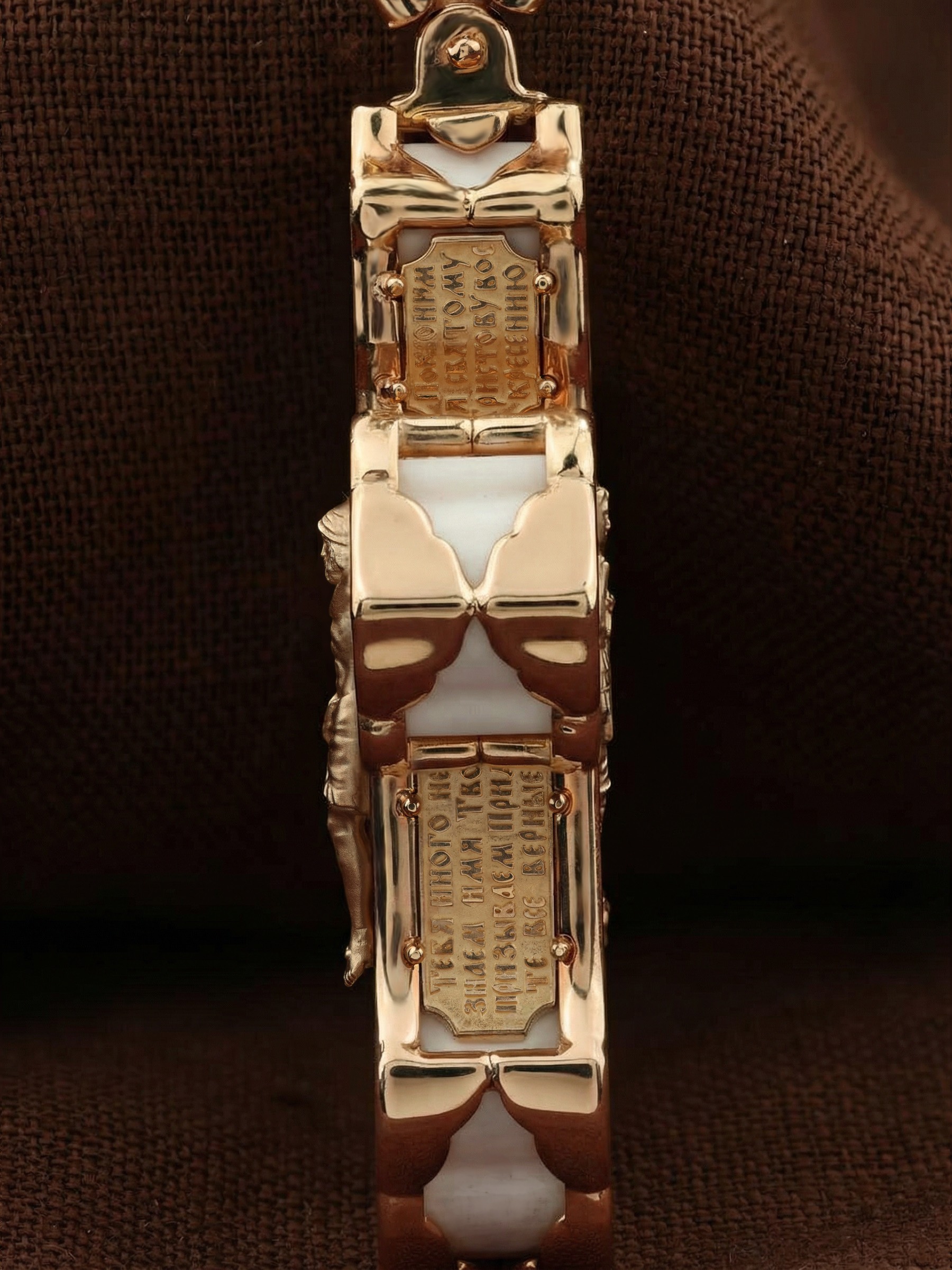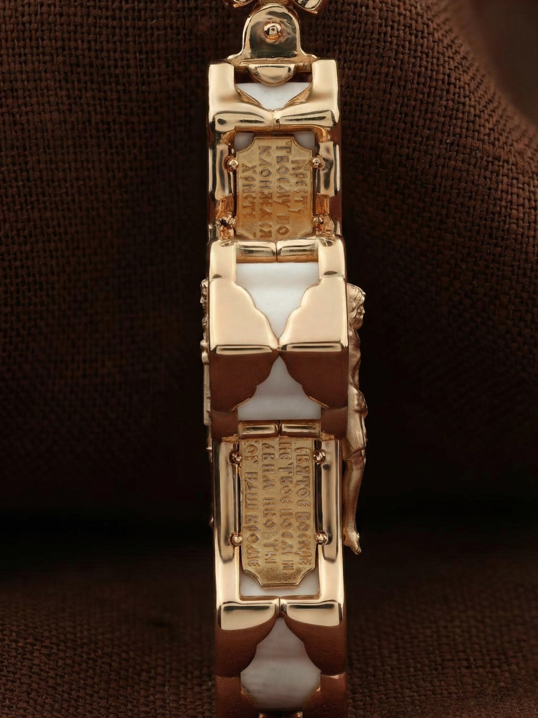В центре оборотной стороне креста изображен Святой Агнгел-Хранитель в виде юноши держащего в правой руке крест, а в левой — мечь. Агнгел-Хранитель — это Ангел приставляемый Богом к человеку при крещении для охраны и помощи в добрых делах. Он невидимо находится при человеке на протяжении всей его жизни, если человек сохраняет в себе любовь к Богу и истинную веру перед Ним. По сторонам от изображения помещена молитва: «Ангеле Божий, хранителю мой святый, на соблюдение мне от Бога с небесе данный! Прилежно молю тя: ты мя днесь просвети, и от всякаго зла сохрани, ко благому деянию настави…». На кулонном кольце изображена икона Божией Матери «Покров Пресвятой Богородицы».
